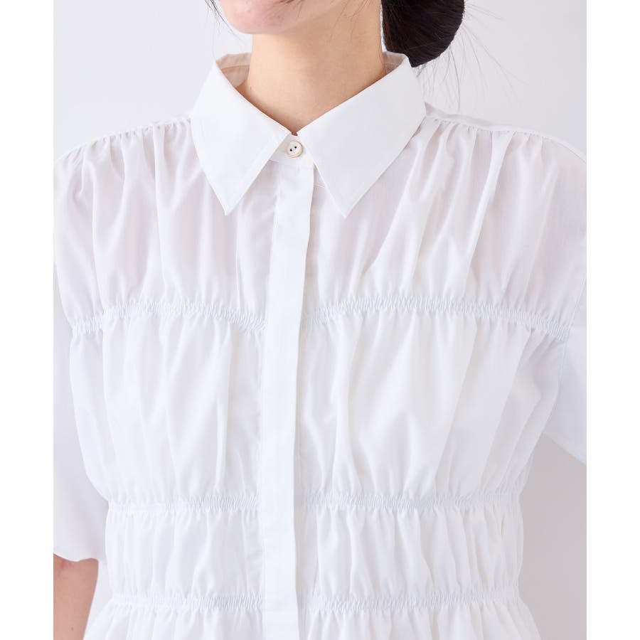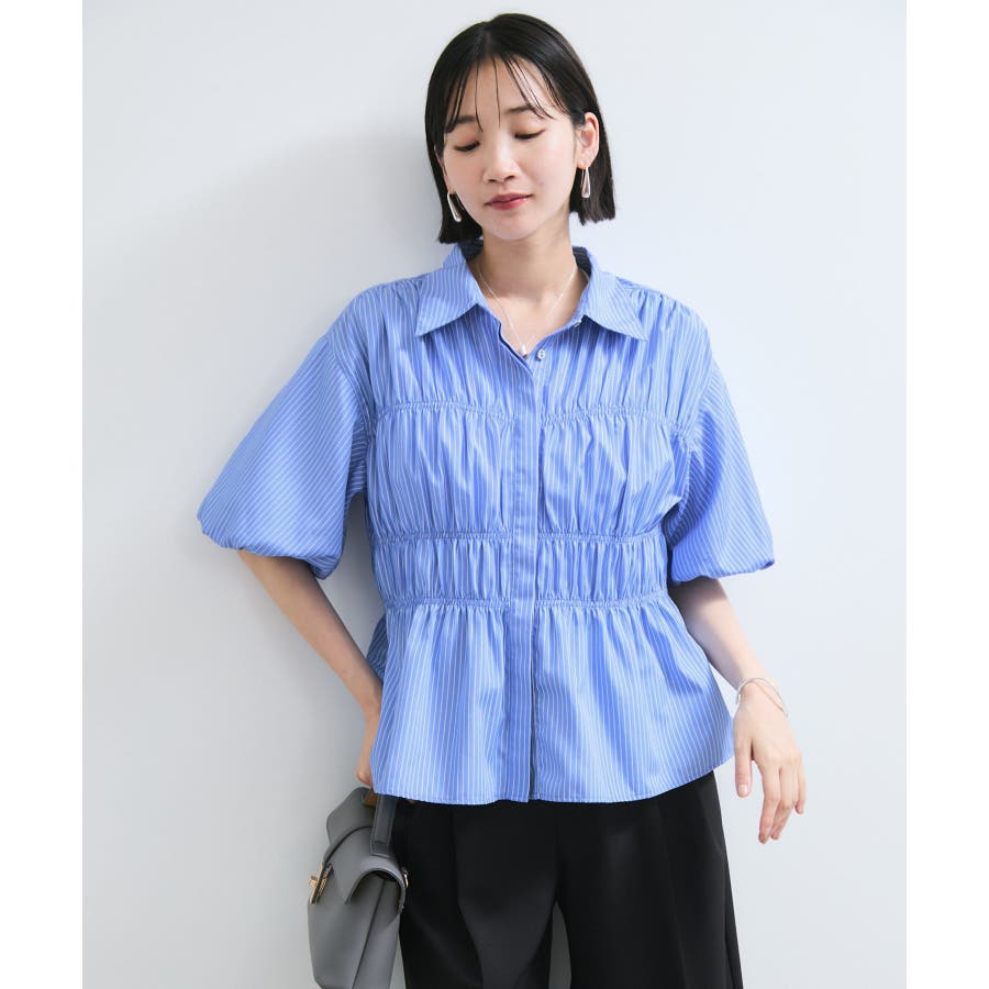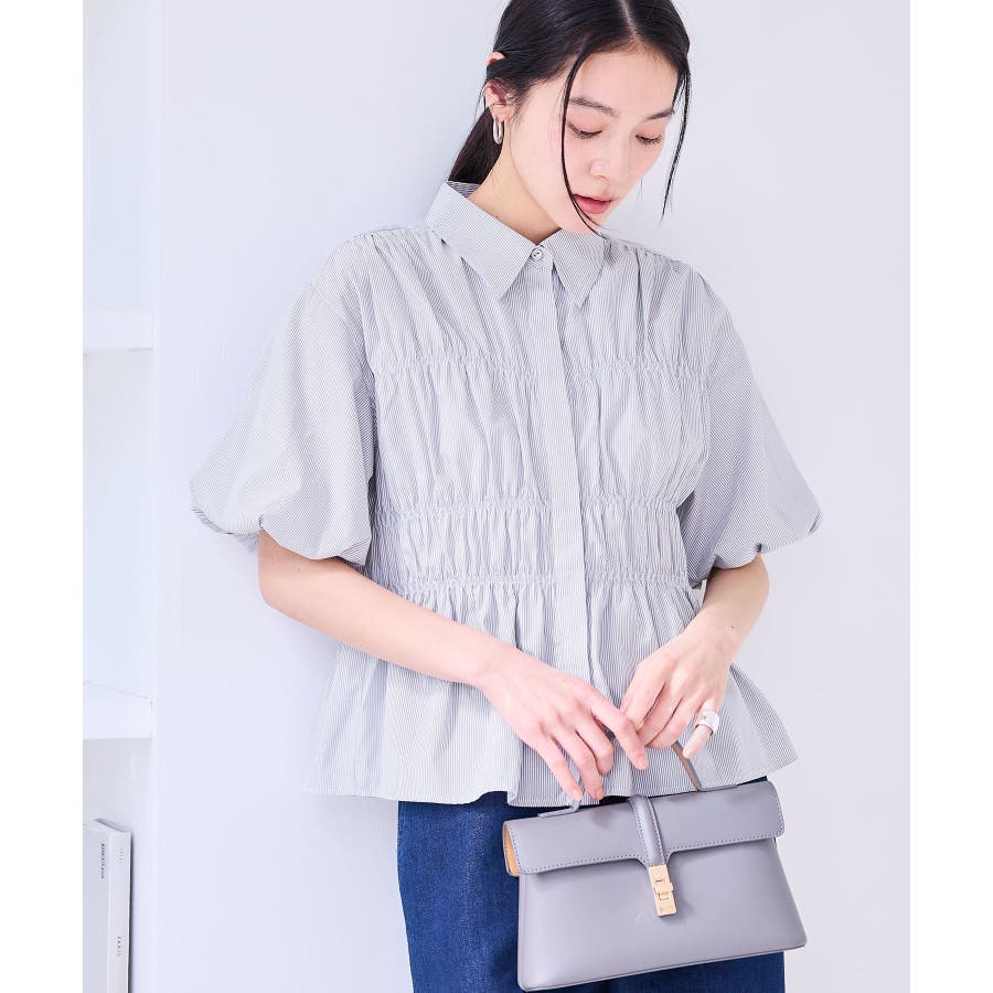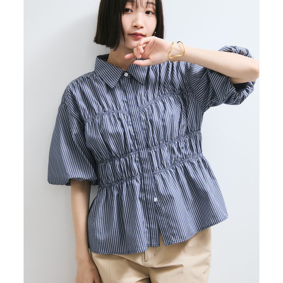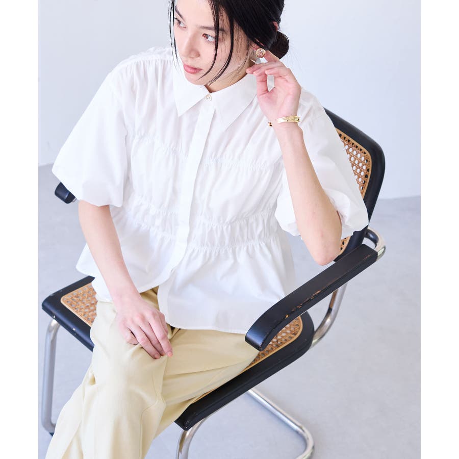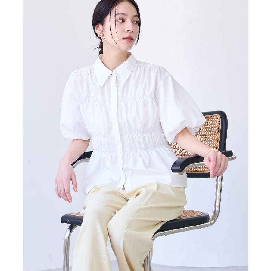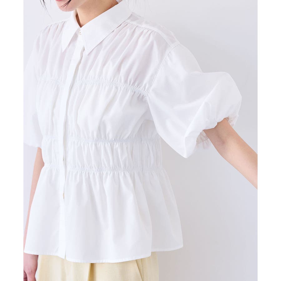 ・シャツを土台にビスチェ風のシャーリングを施した今年らしいデザインシャツ。