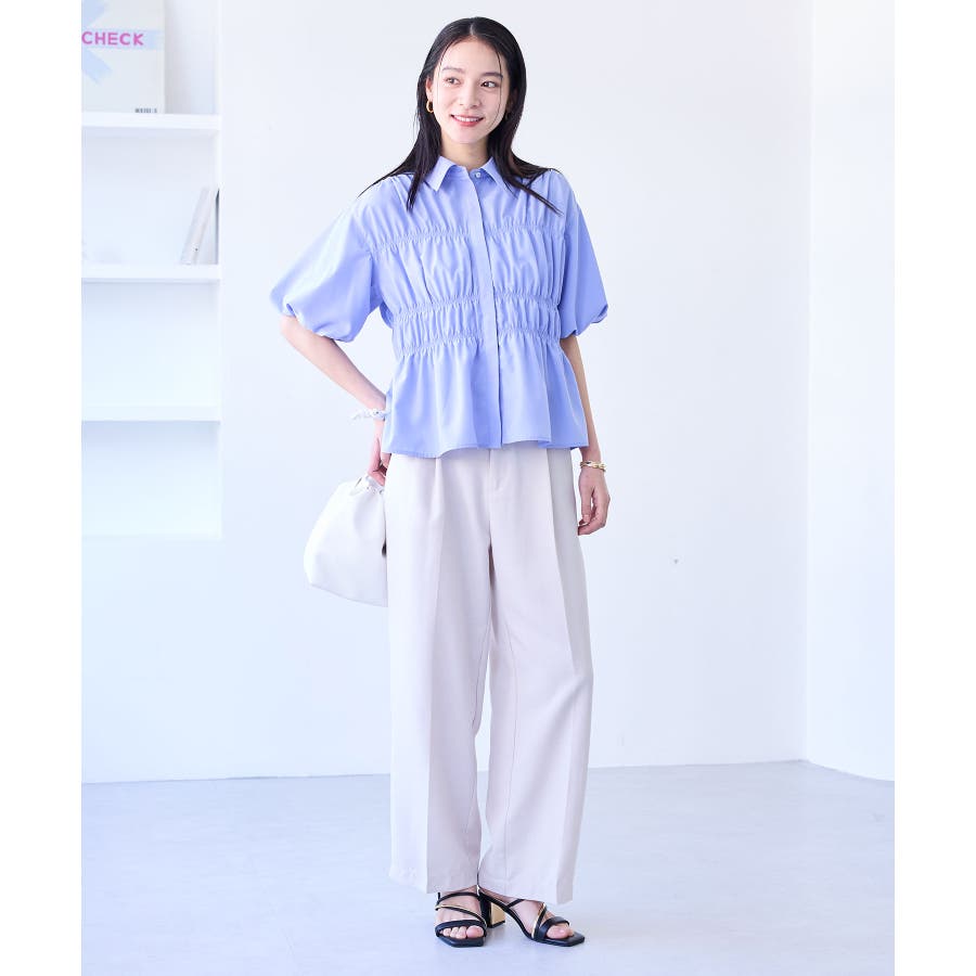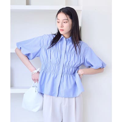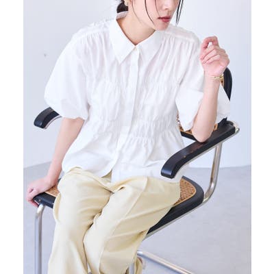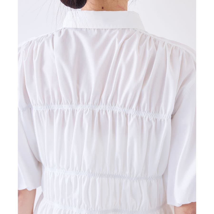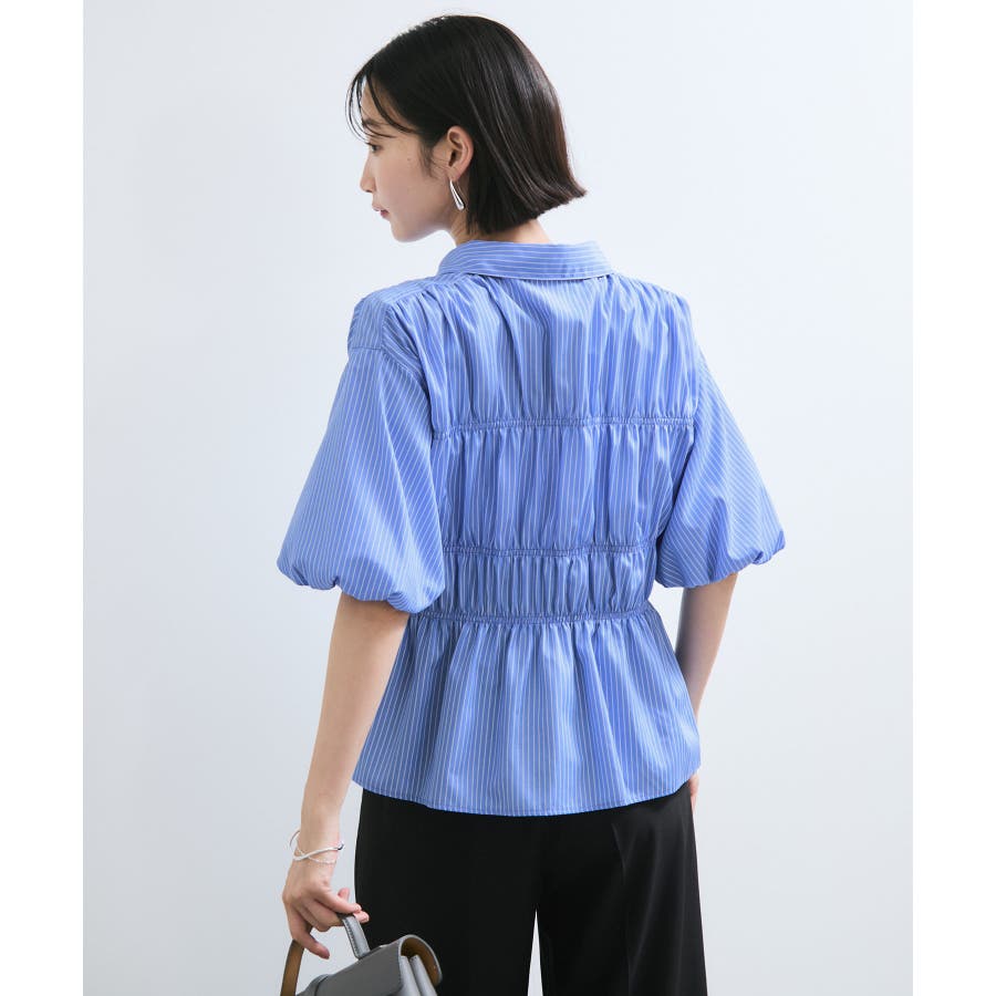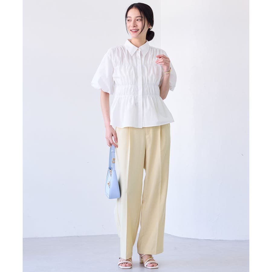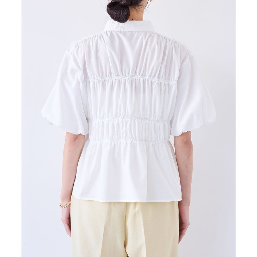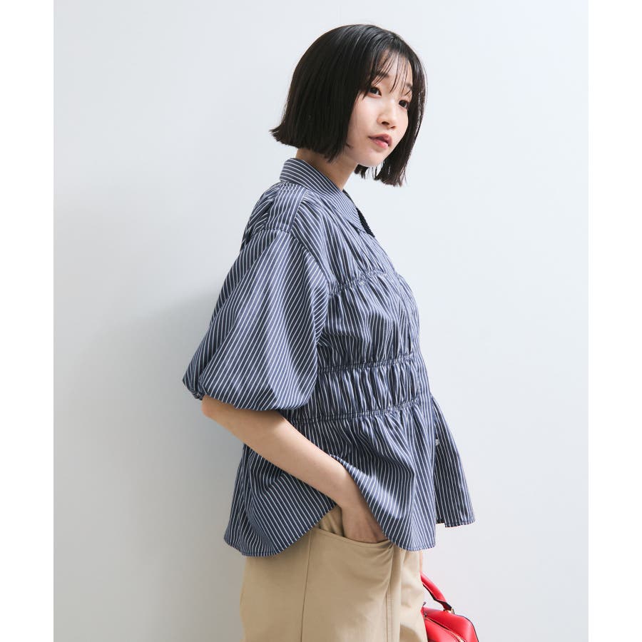 ・シャツを土台にビスチェ風のシャーリングを施した今年らしいデザインシャツ。