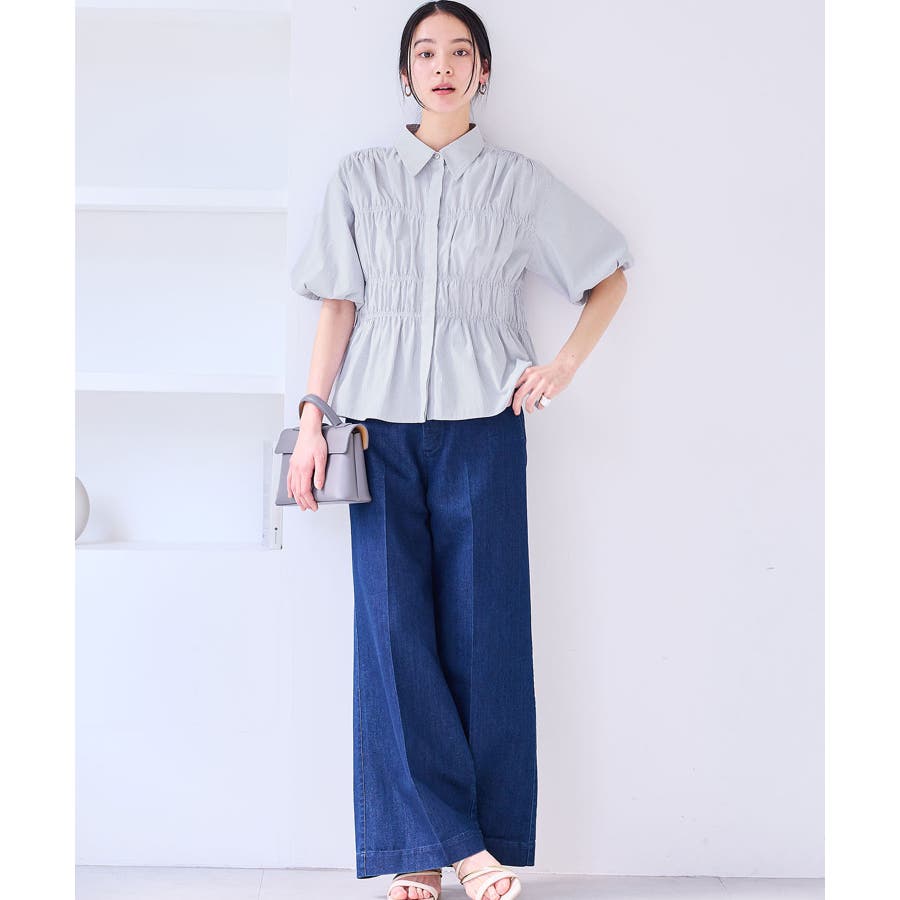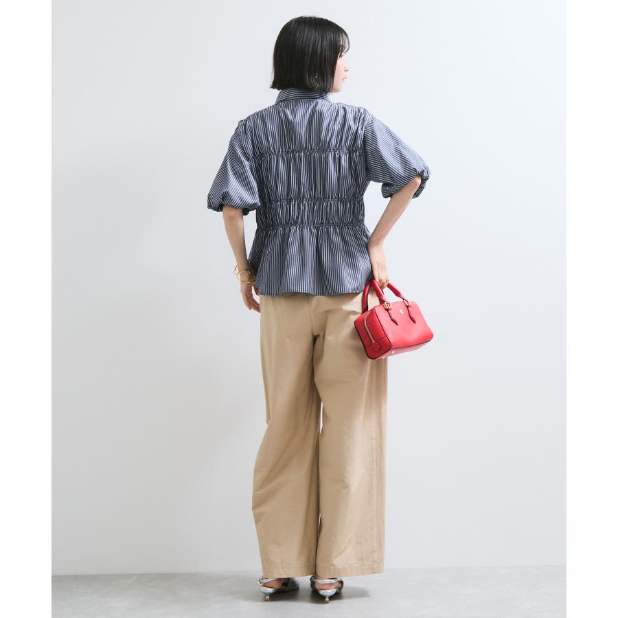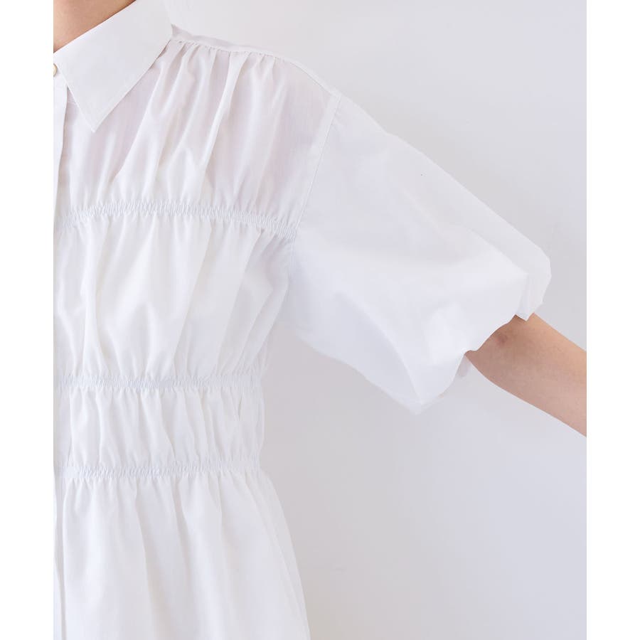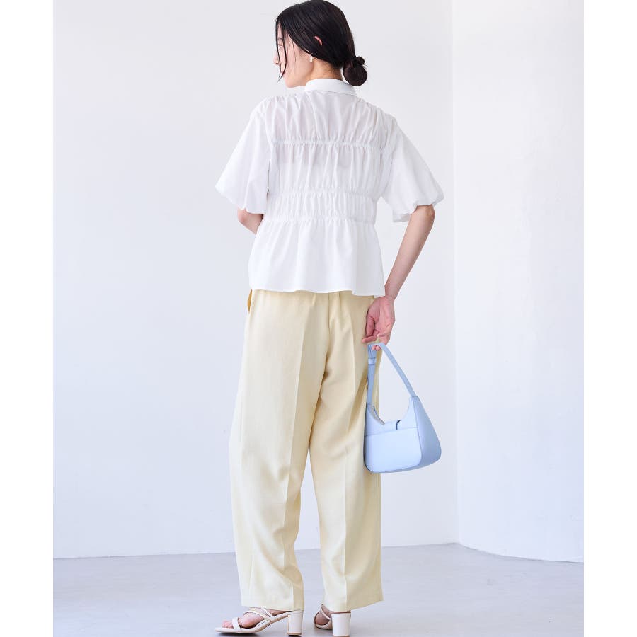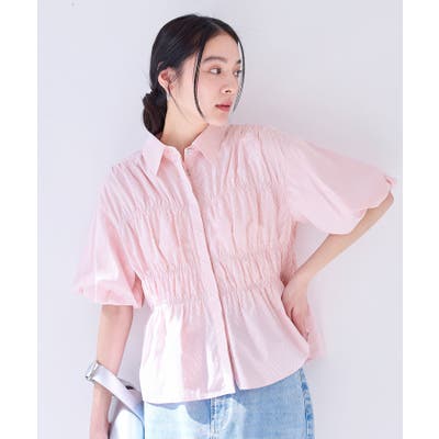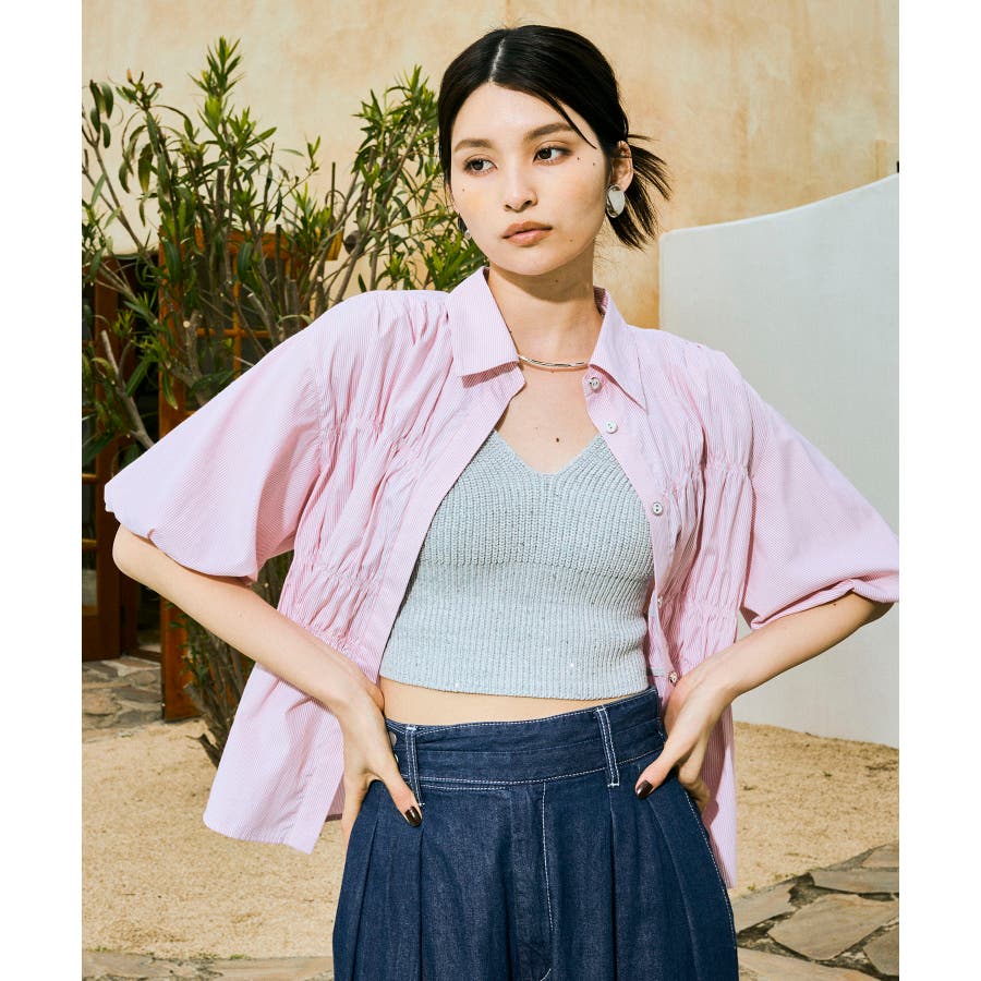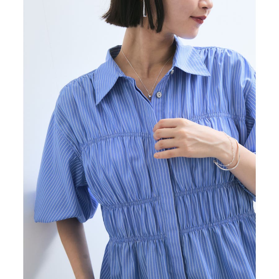 ・シャツを土台にビスチェ風のシャーリングを施した今年らしいデザインシャツ。