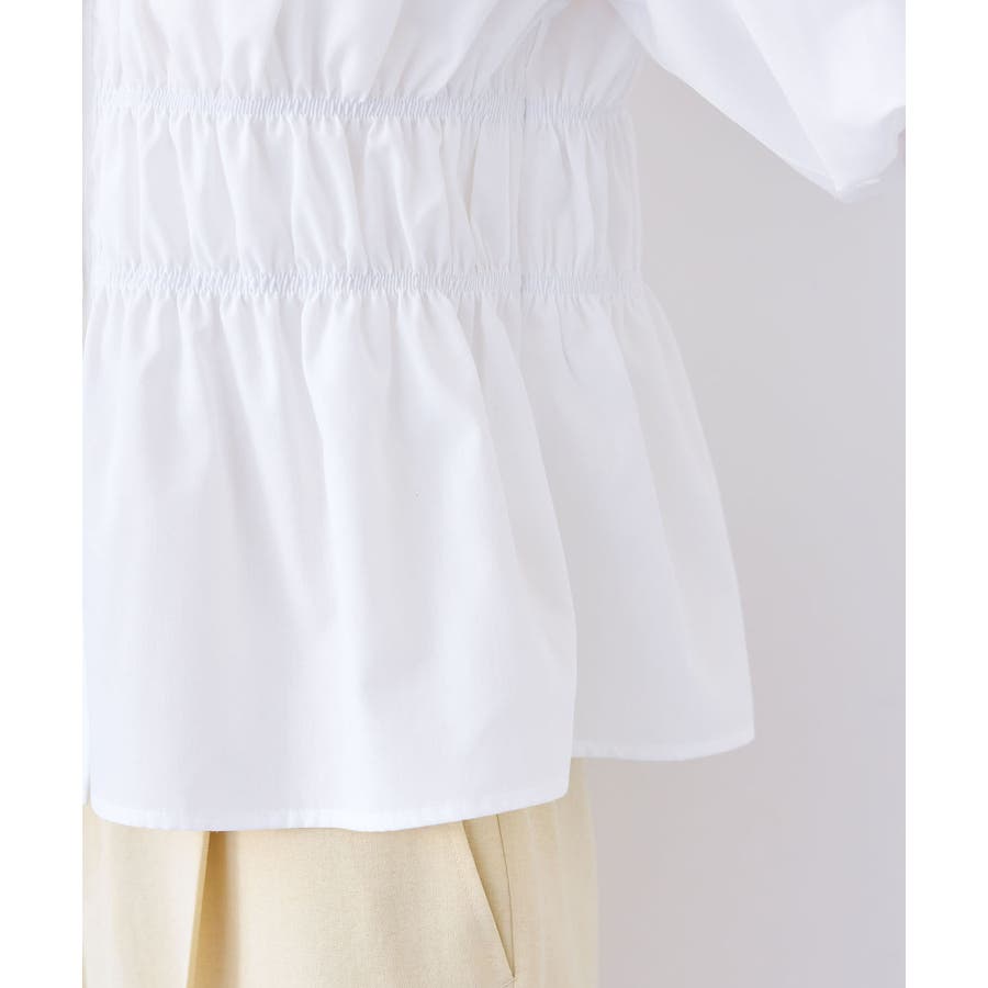 その他仕様:胸元シャーリング部分ゴムあり。第一ボタン以外は比翼ボタンの仕様。袖口はゴムなし。