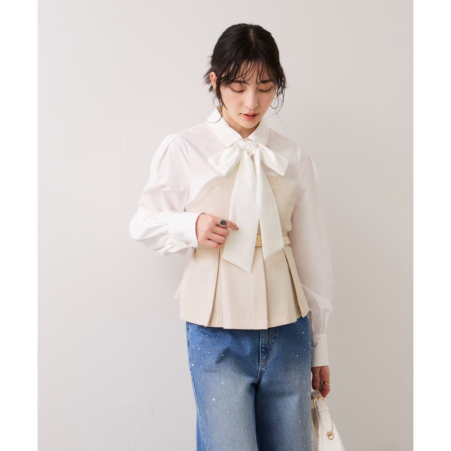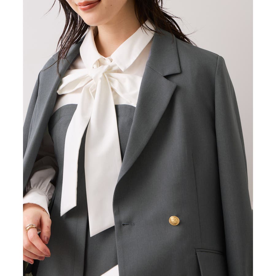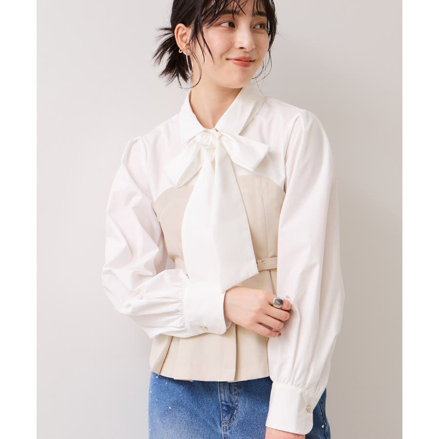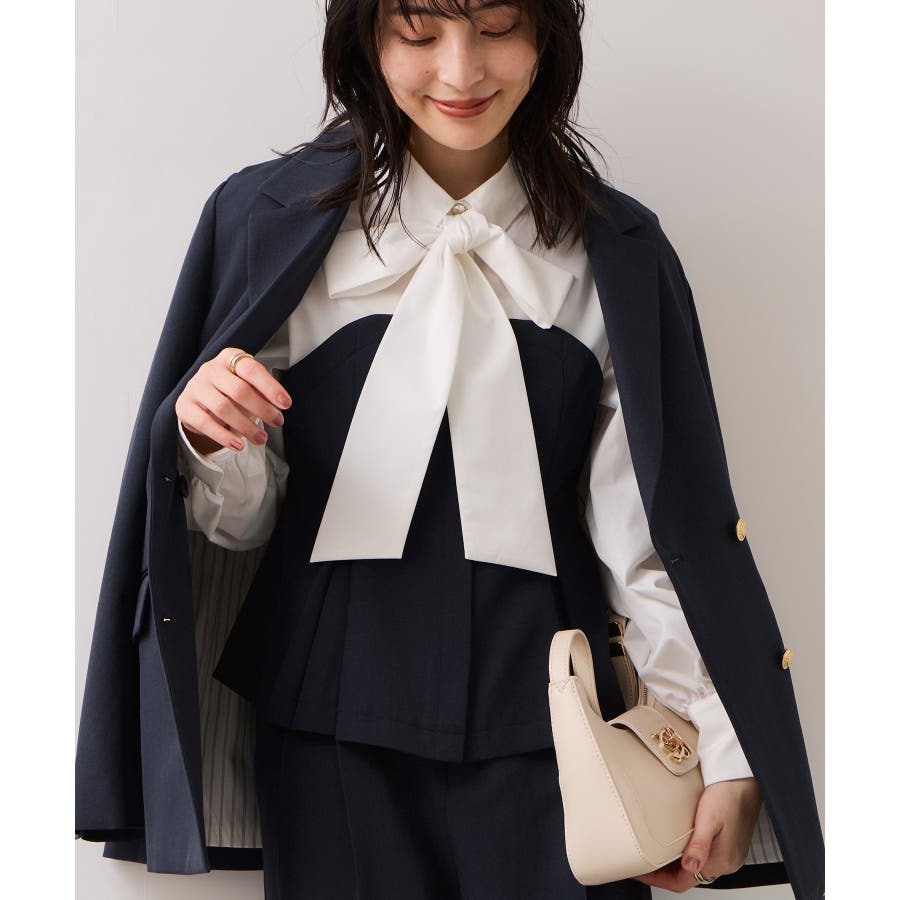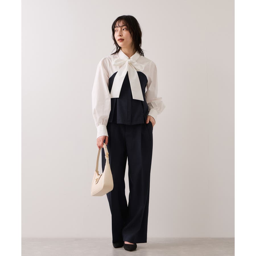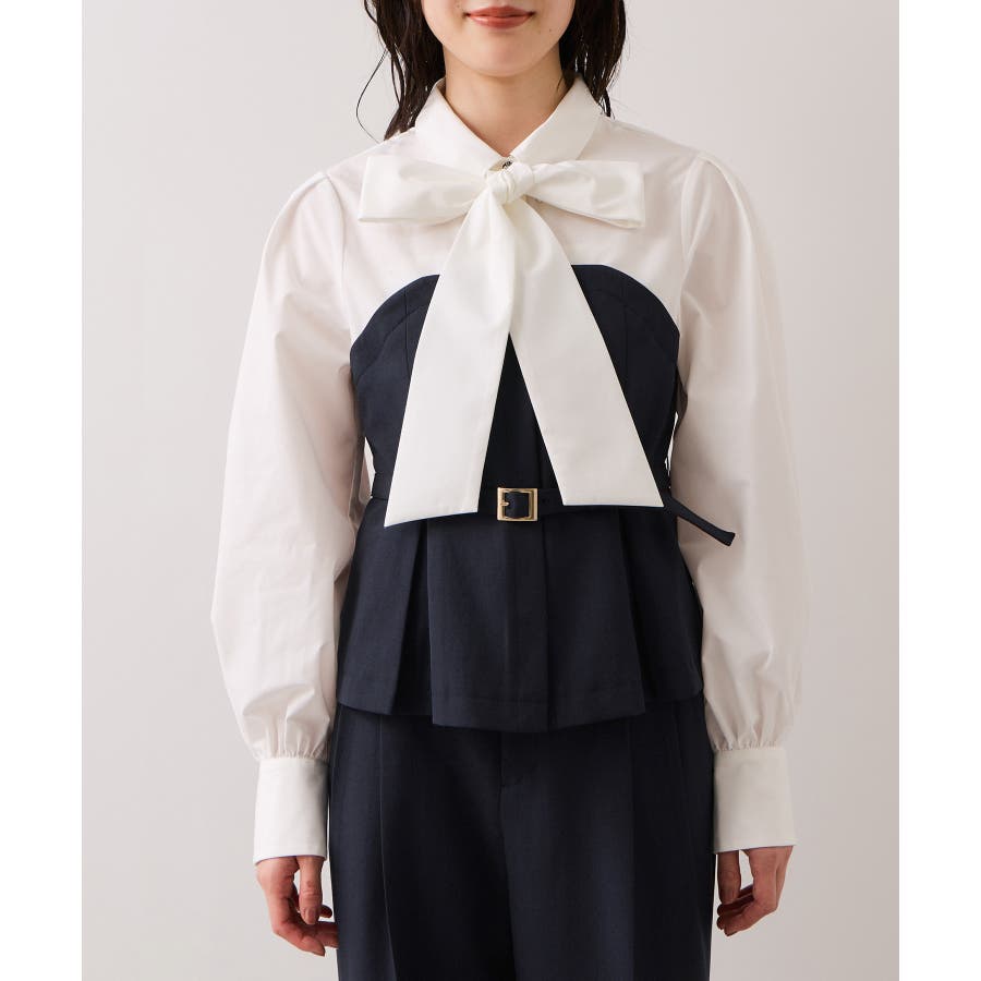 リボンボウタイと共布ベルトがついているので、シーンに合わせて違う見せ方が出来ます。着方としてはどちらか1つつけるのがおすすめです。