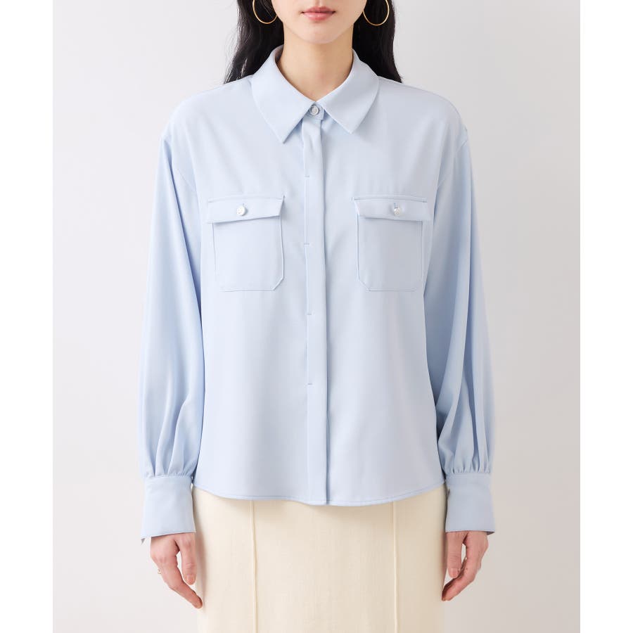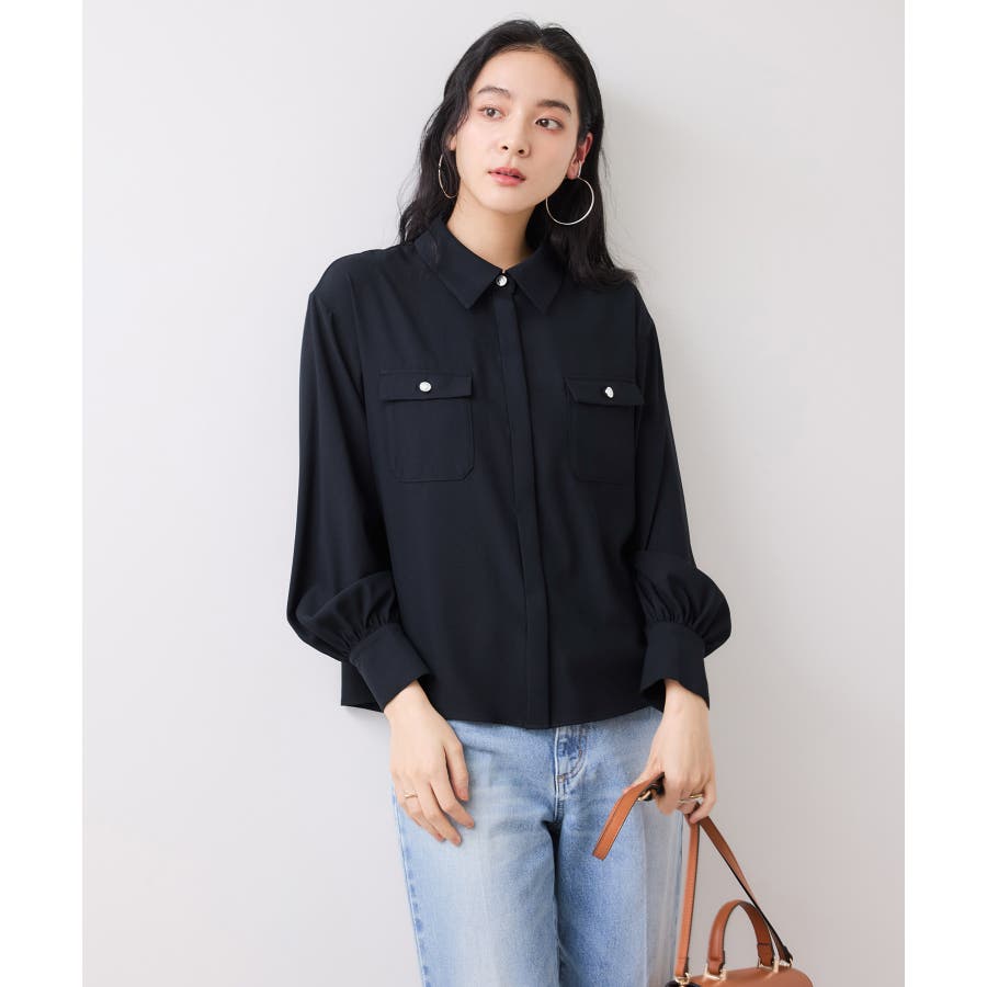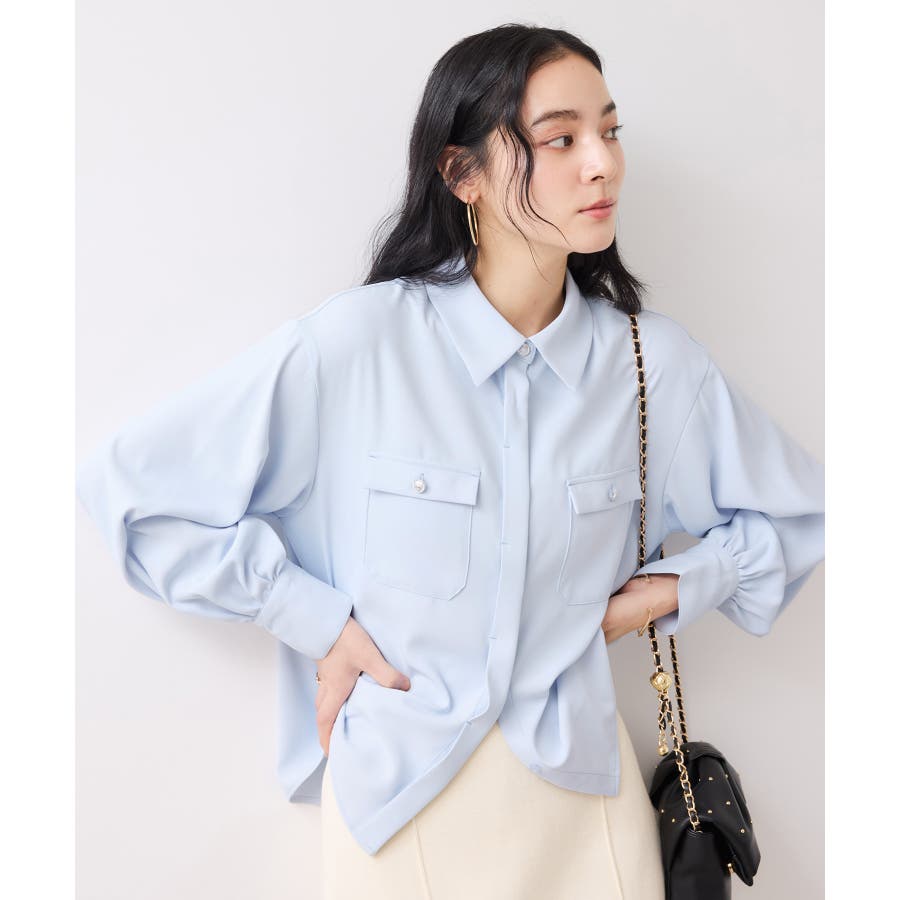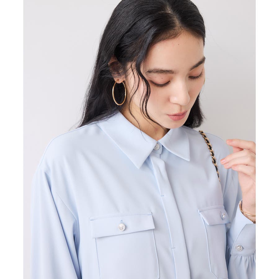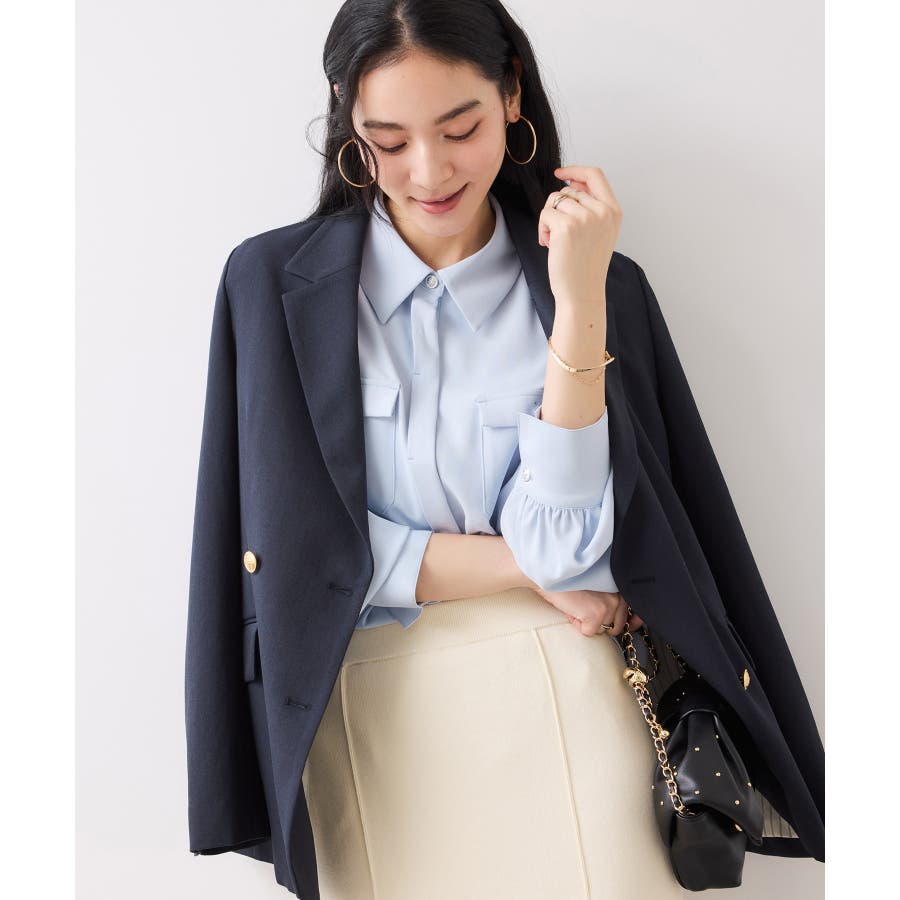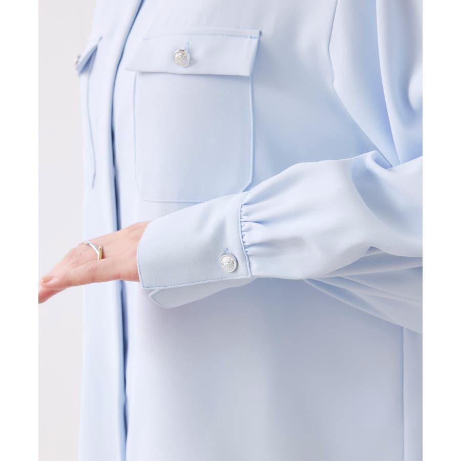 シルバーの紋章入りメタル釦がポイント。ベーシックなシャツ型ブラウスですが袖にボリュームを持たせており女性らしい印象に。