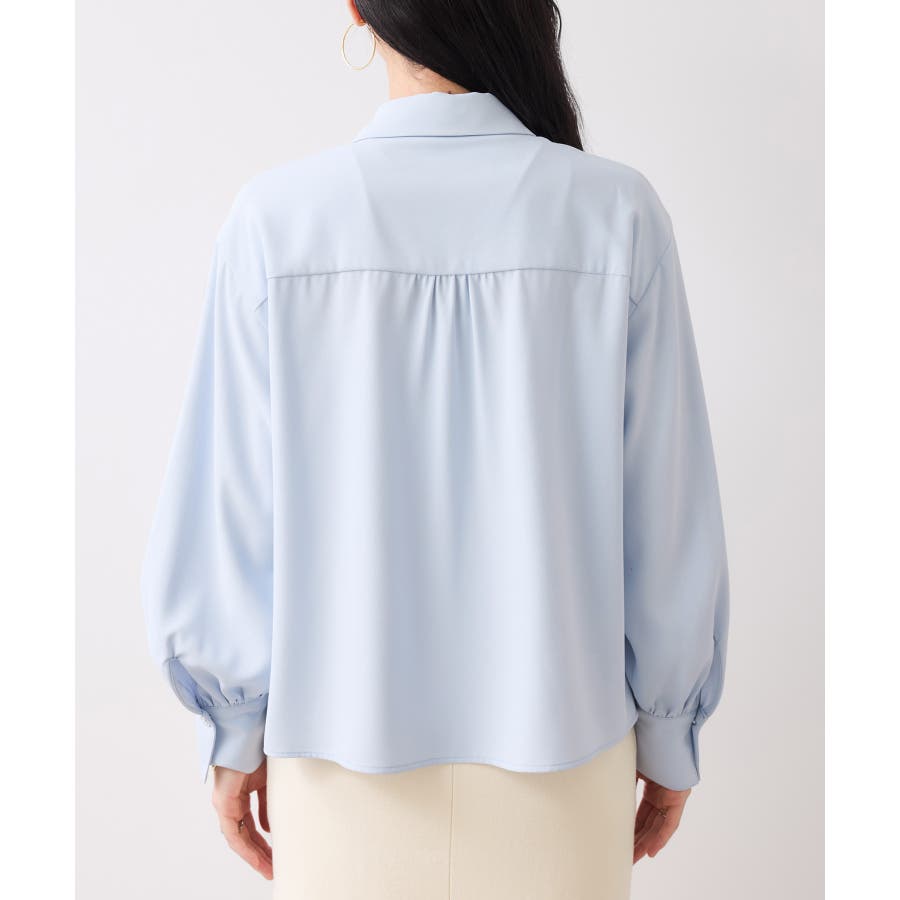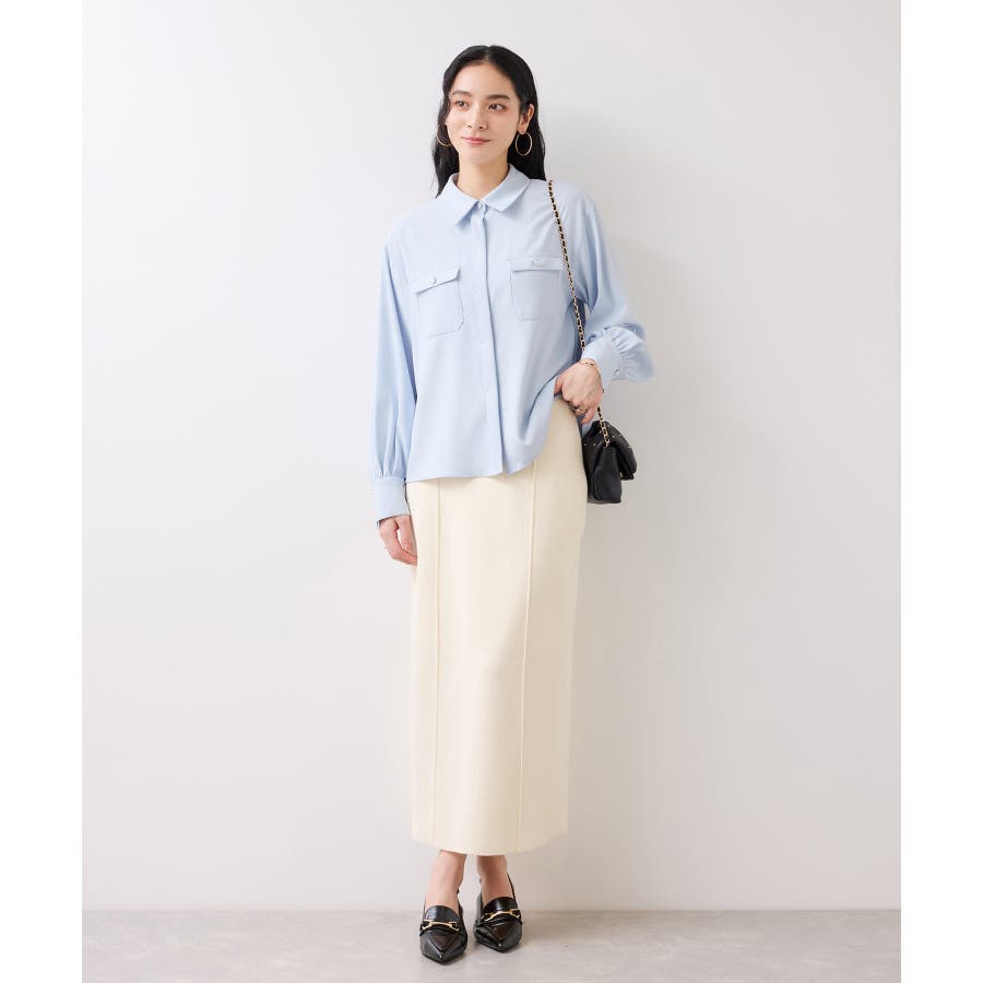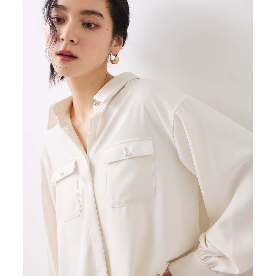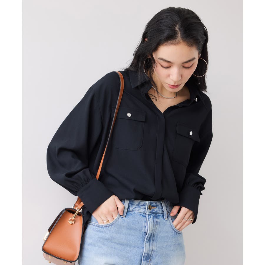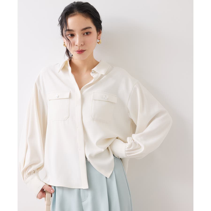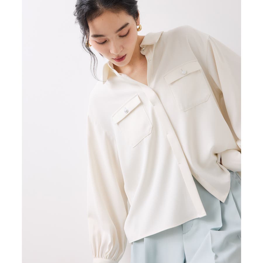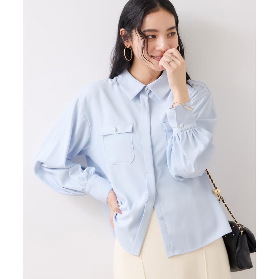 シルバーの紋章入りメタル釦がポイント。ベーシックなシャツ型ブラウスですが袖にボリュームを持たせており女性らしい印象に。