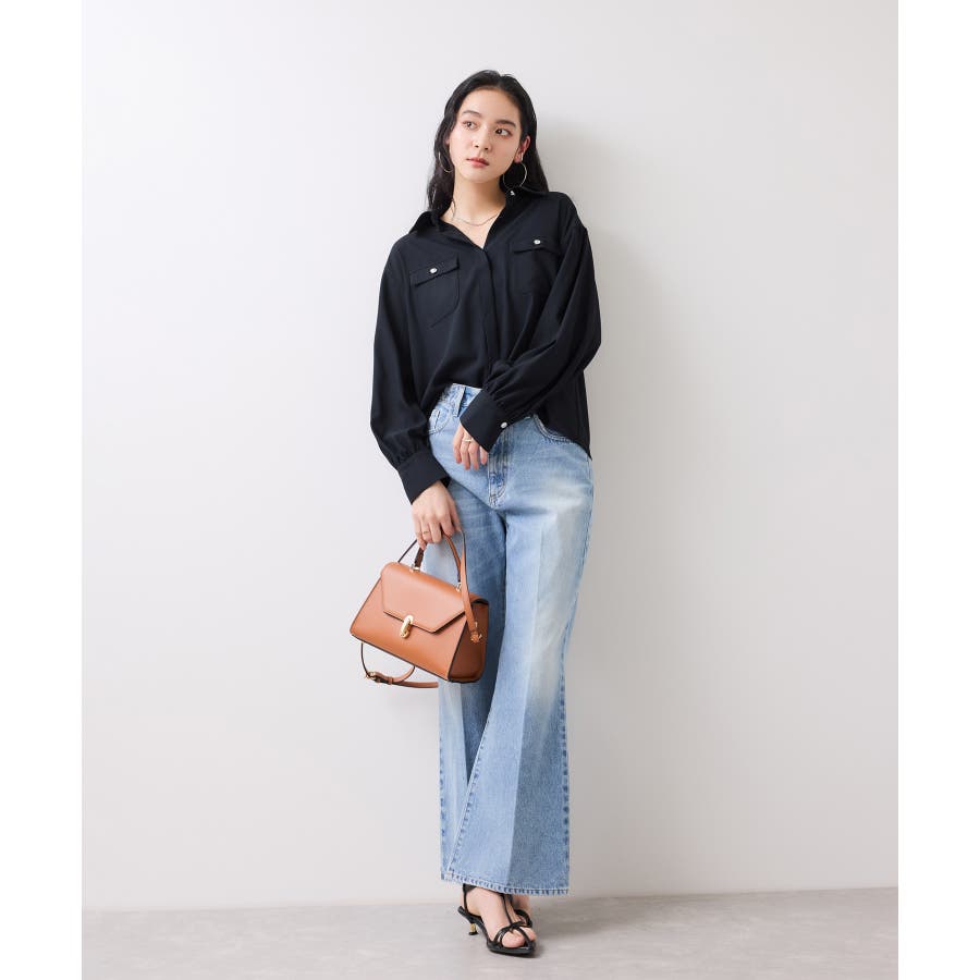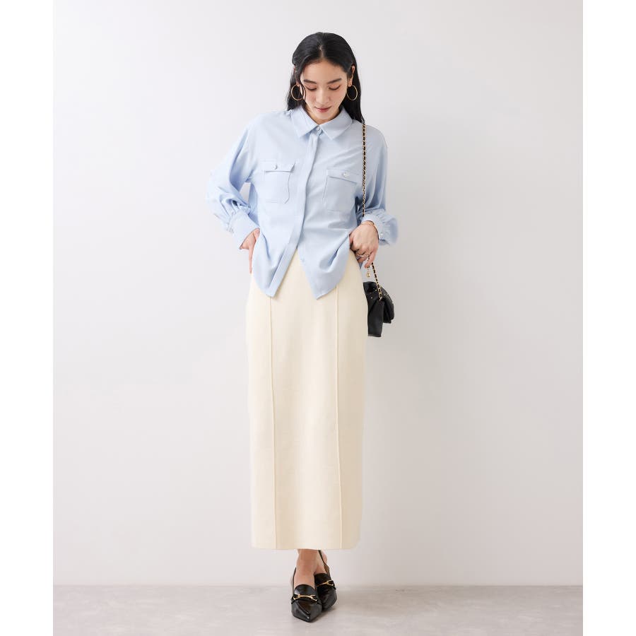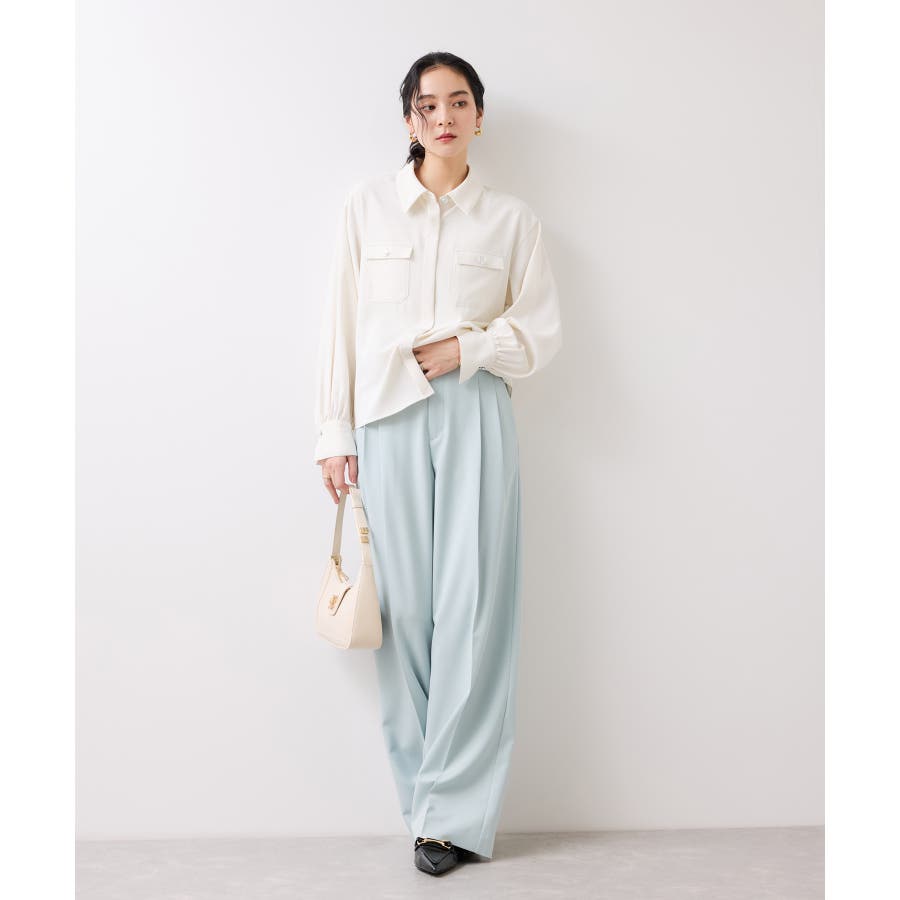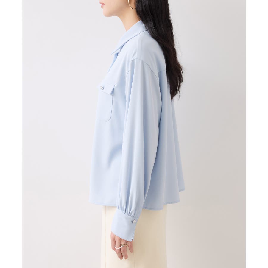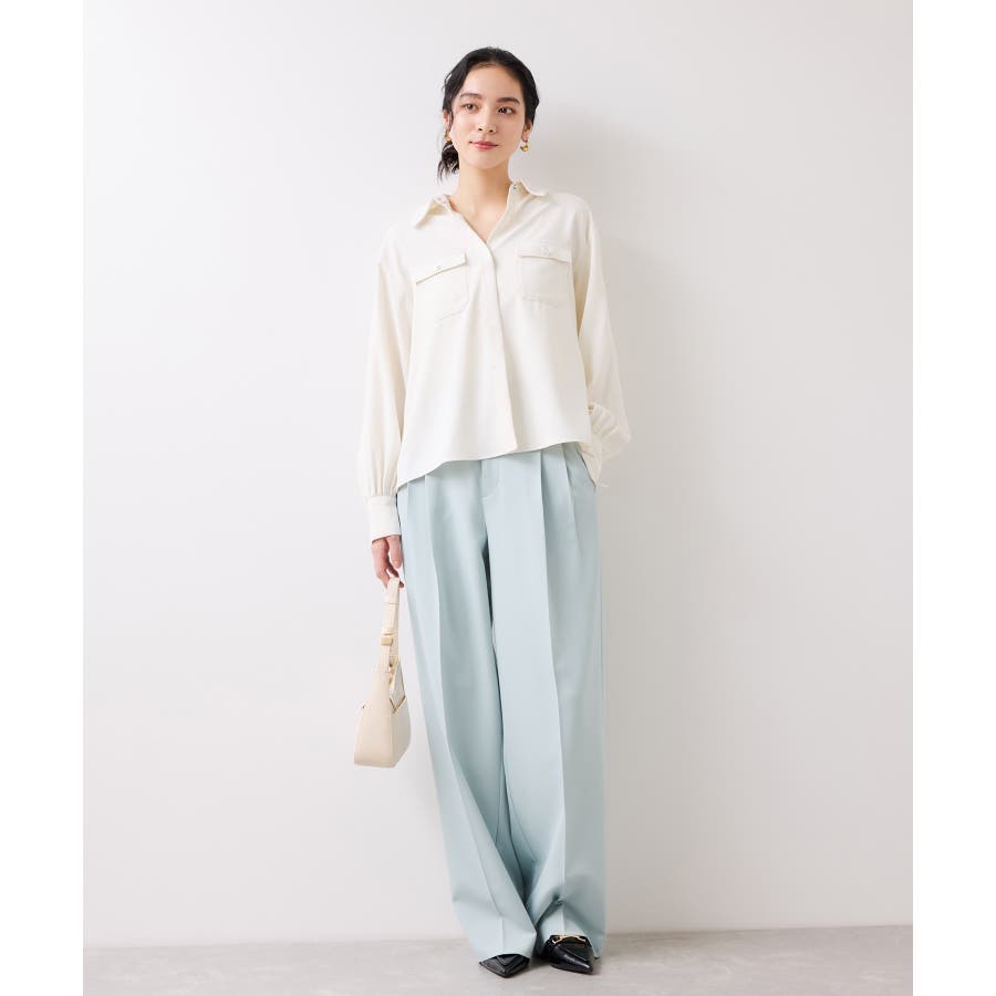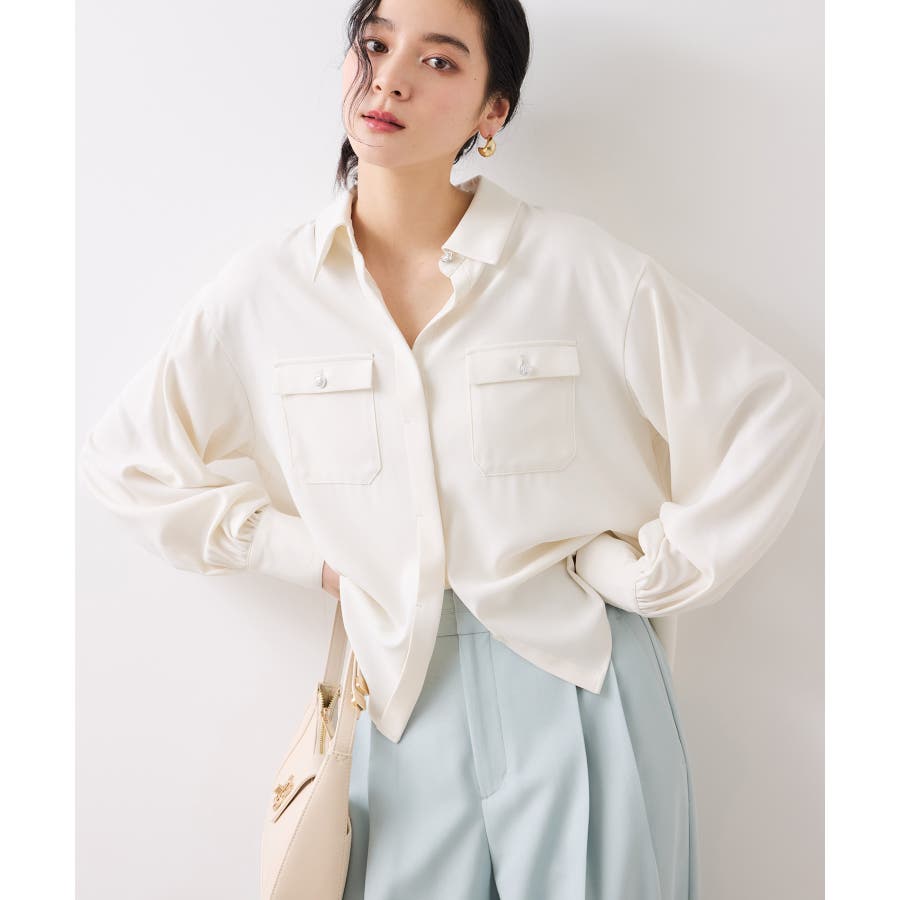 シルバーの紋章入りメタル釦がポイント。ベーシックなシャツ型ブラウスですが袖にボリュームを持たせており女性らしい印象に。