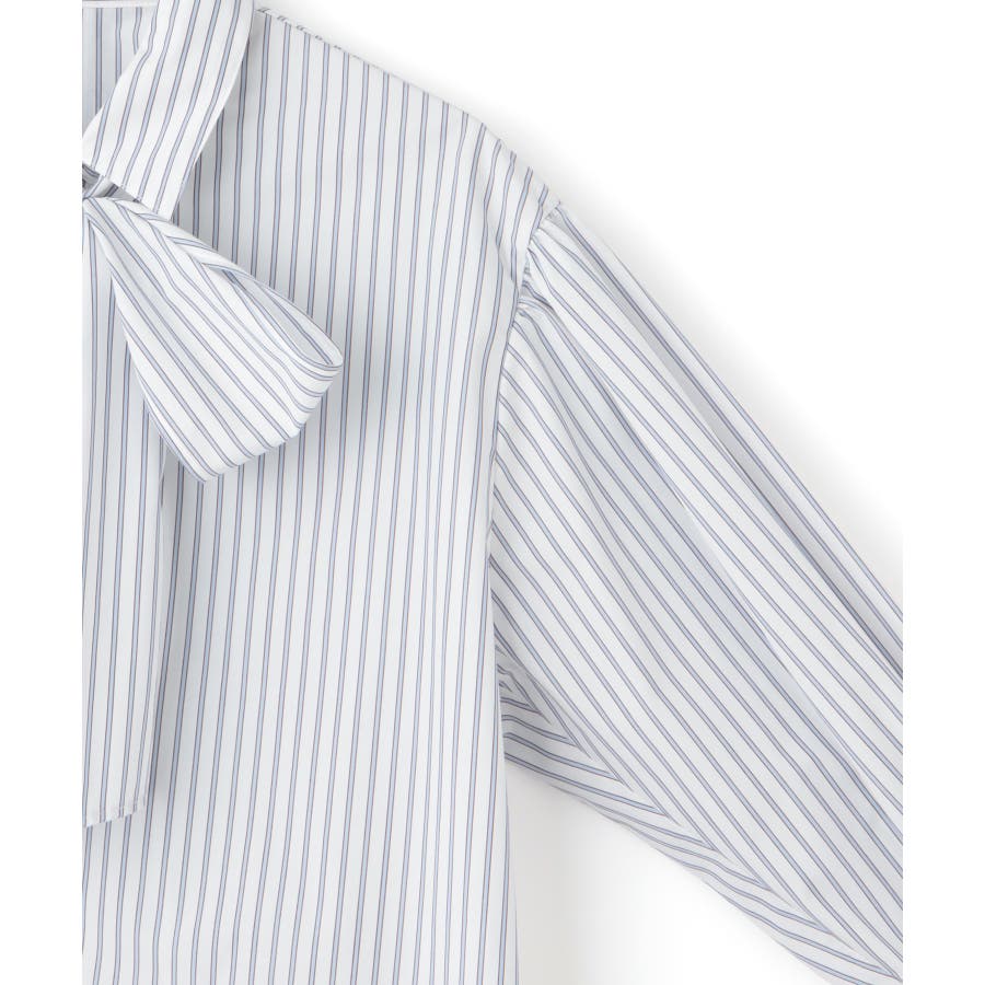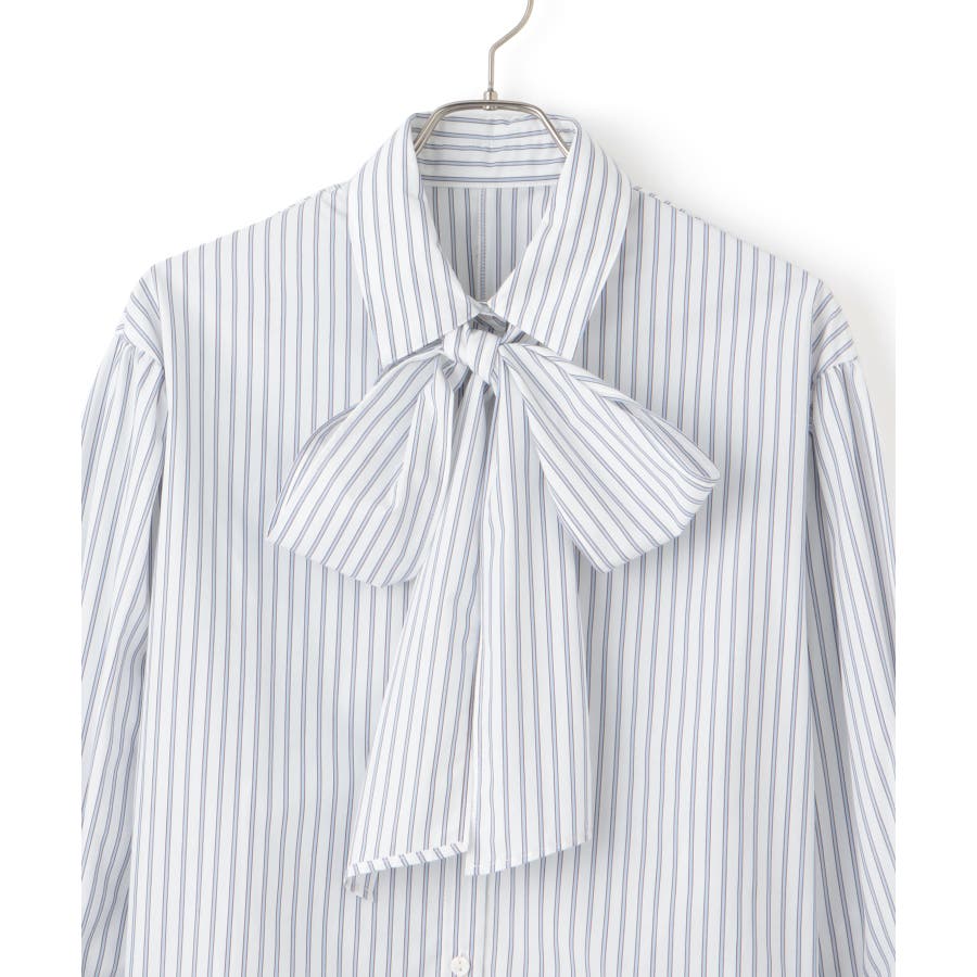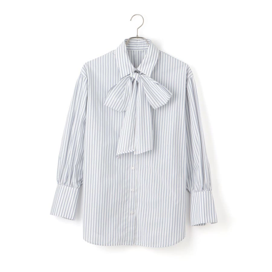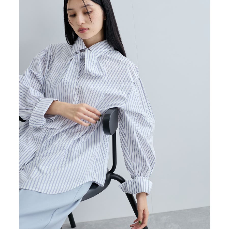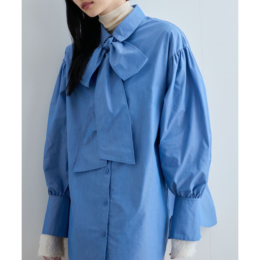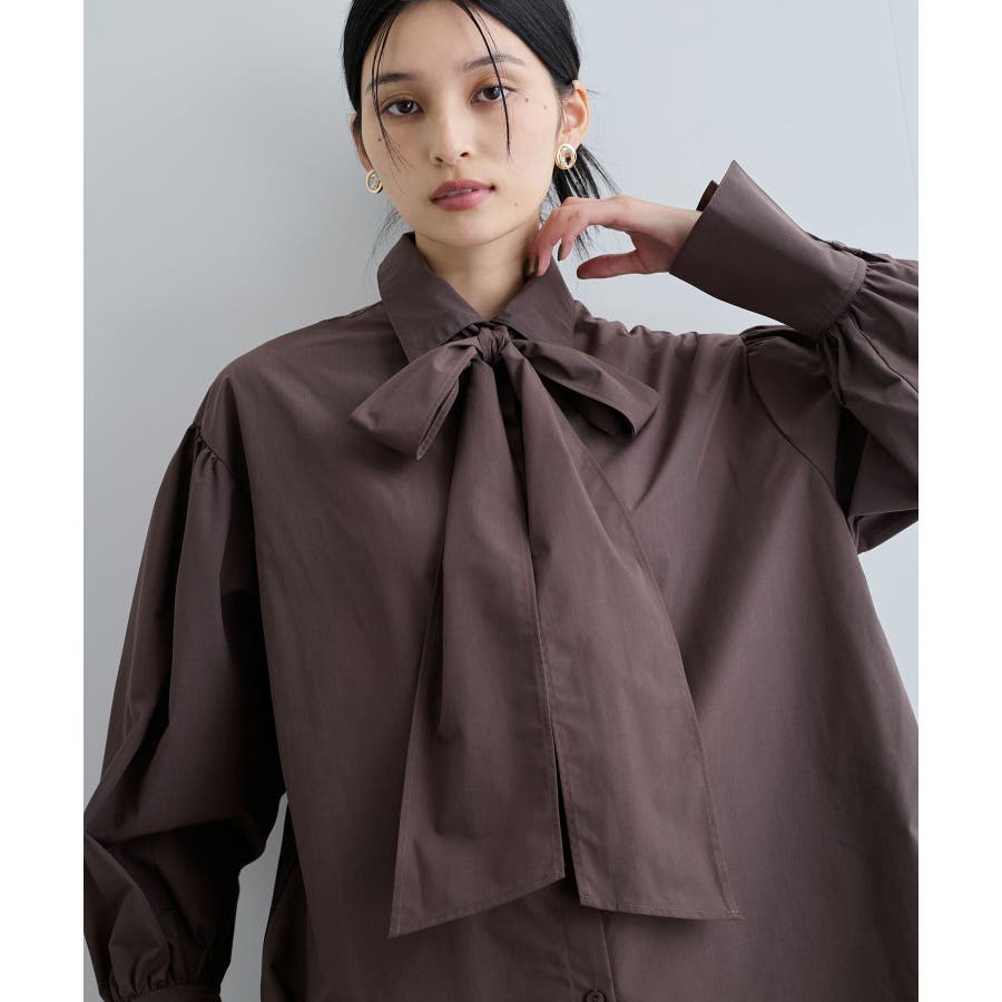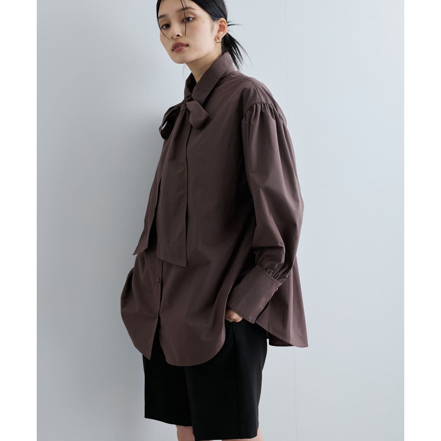 ◆2024-25秋冬◆ 【デザイン・シルエット】 ビッグリボンが目を引くシャツ。 バックにシャーリングを施すことでワイドな印象にならず、1枚ではもちろんニットなどのレイヤードでもすっきりと着用いただけます。