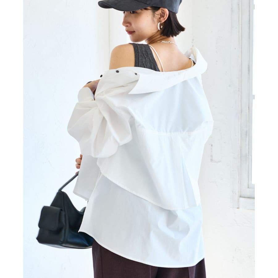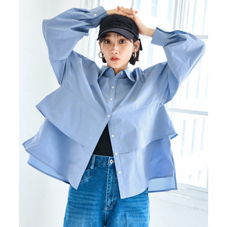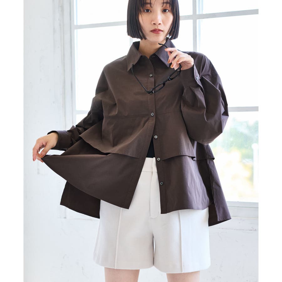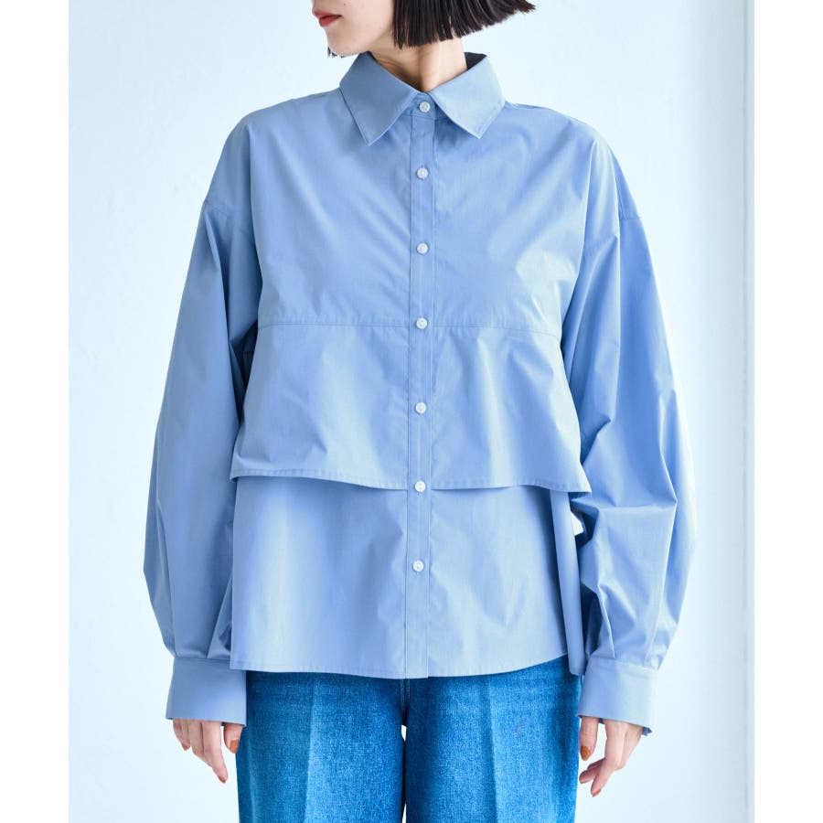 身頃が二重に重なったデザインシャツ。フレアの広がりが女性らしさを引き立て、一枚で着映える主役トップスです。