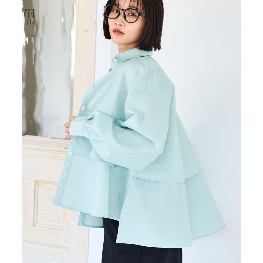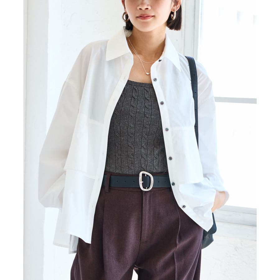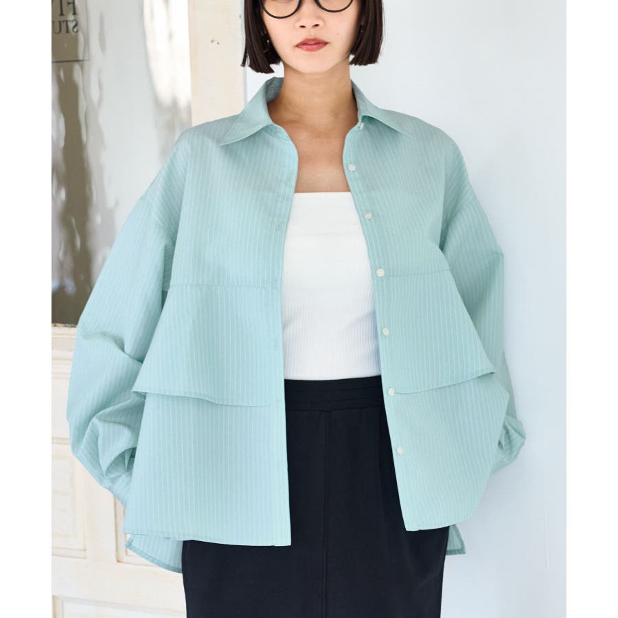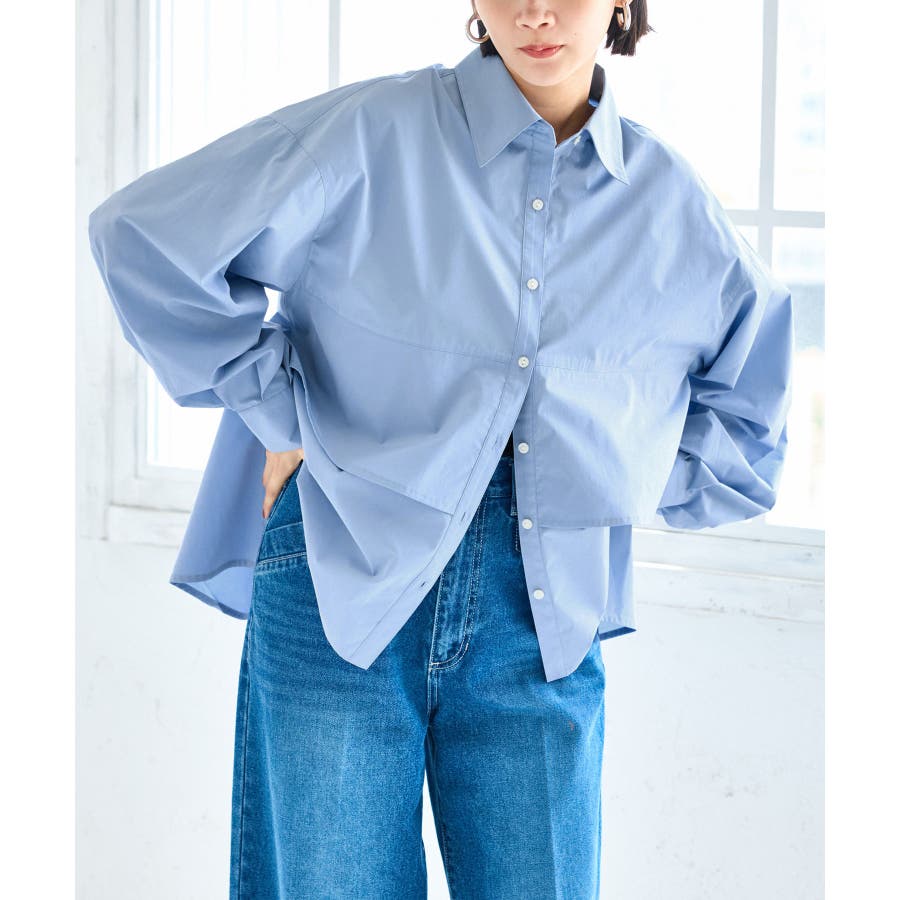 身頃が二重に重なったデザインシャツ。フレアの広がりが女性らしさを引き立て、一枚で着映える主役トップスです。