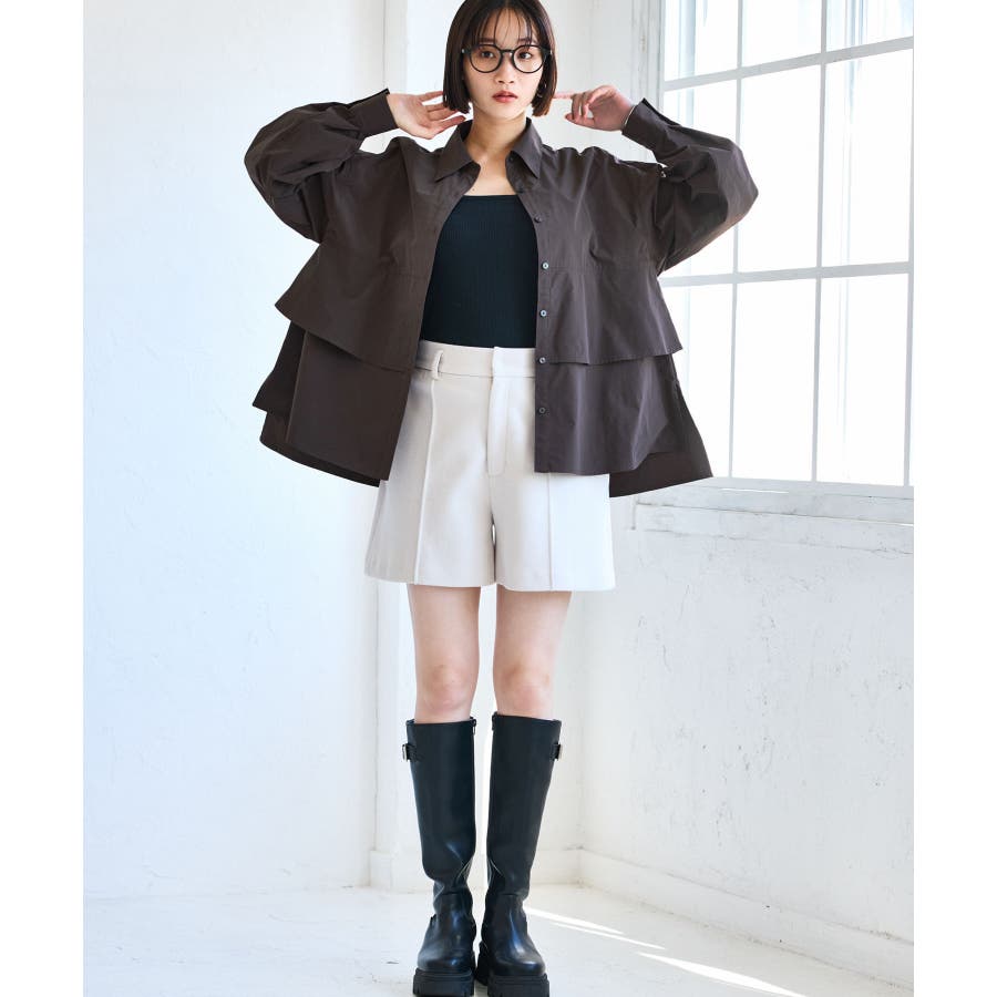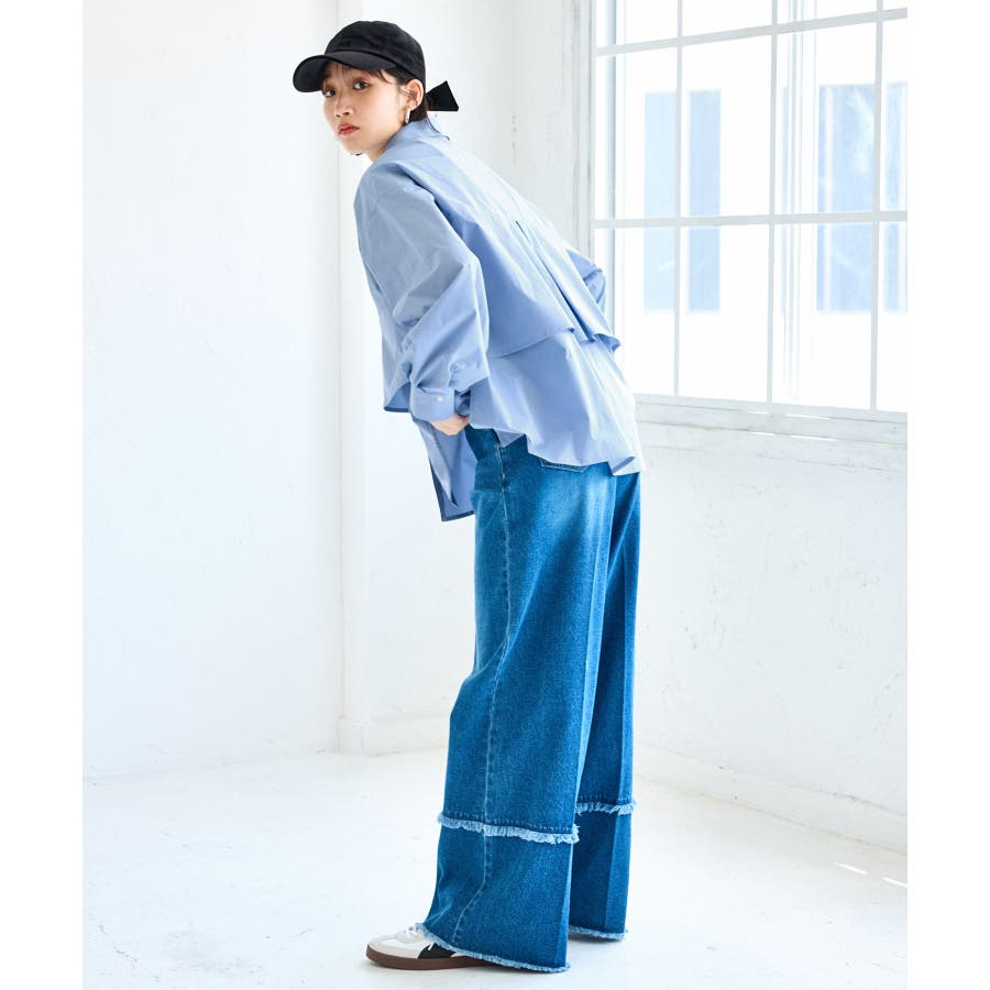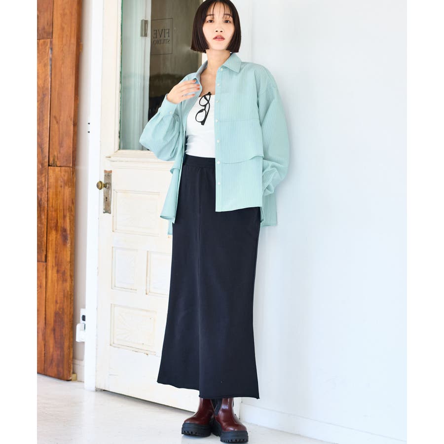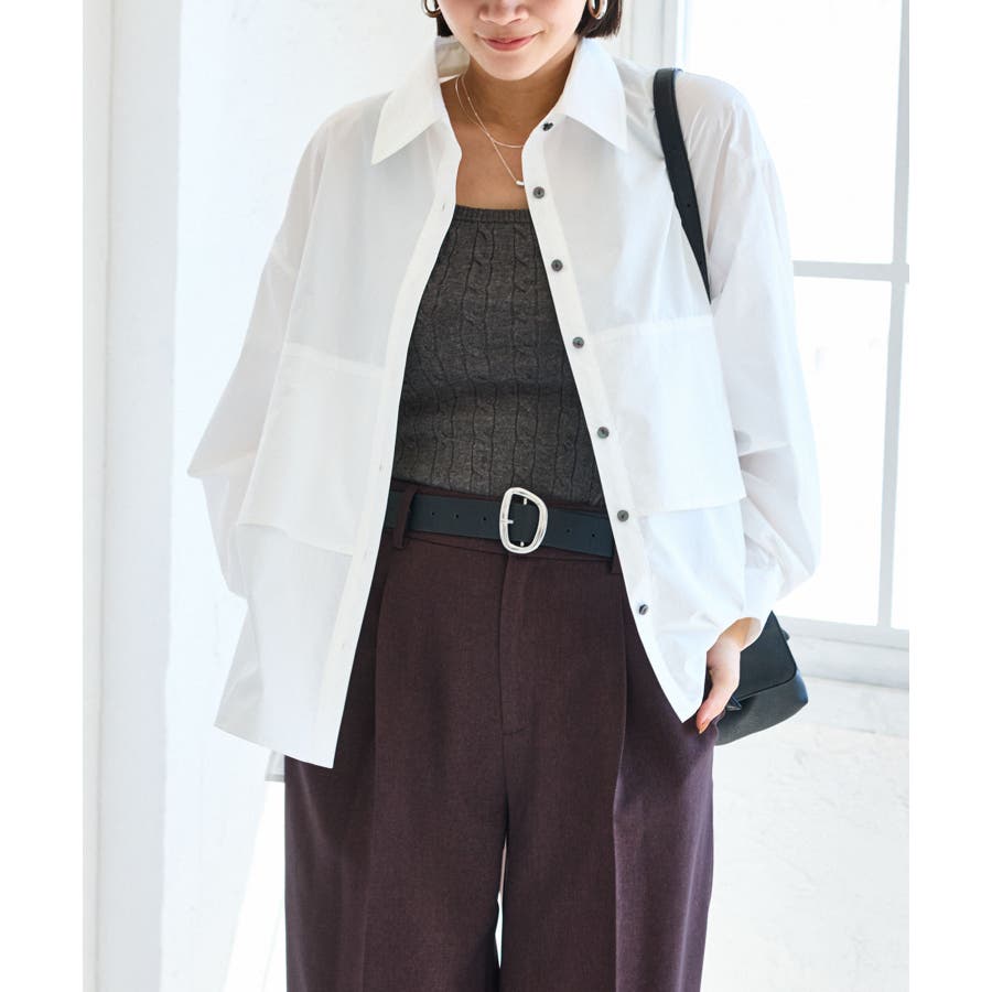 フロント開けて羽織としてミニ丈ボトムに合わせるとバランスよくスタイリングができます。美easyシリーズなどキレイめパンツとの相性も◎。もちろん釦を閉じてトップスとしても着回しの効くアイテムです。
