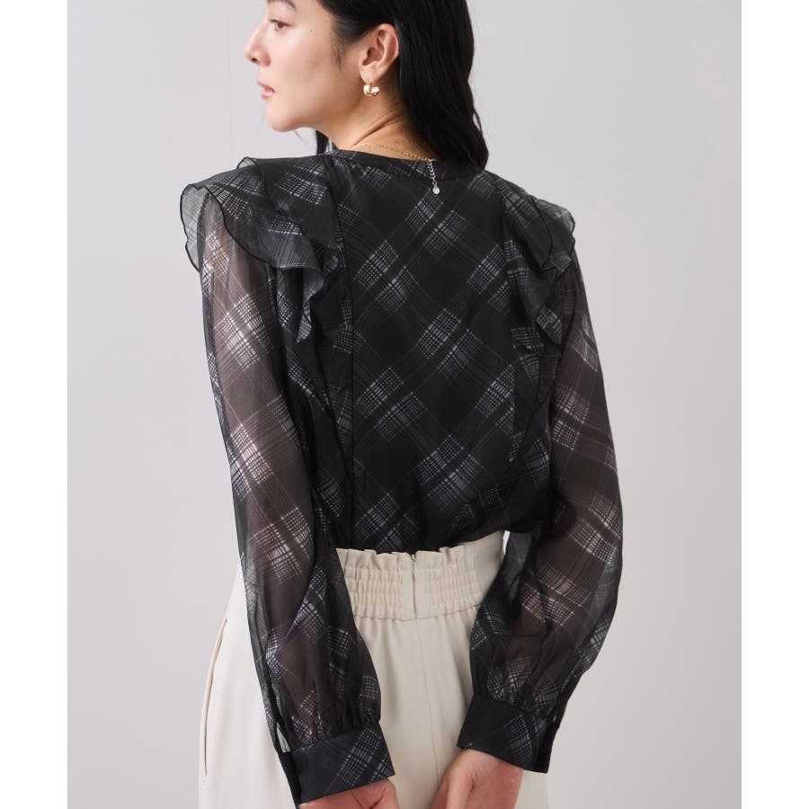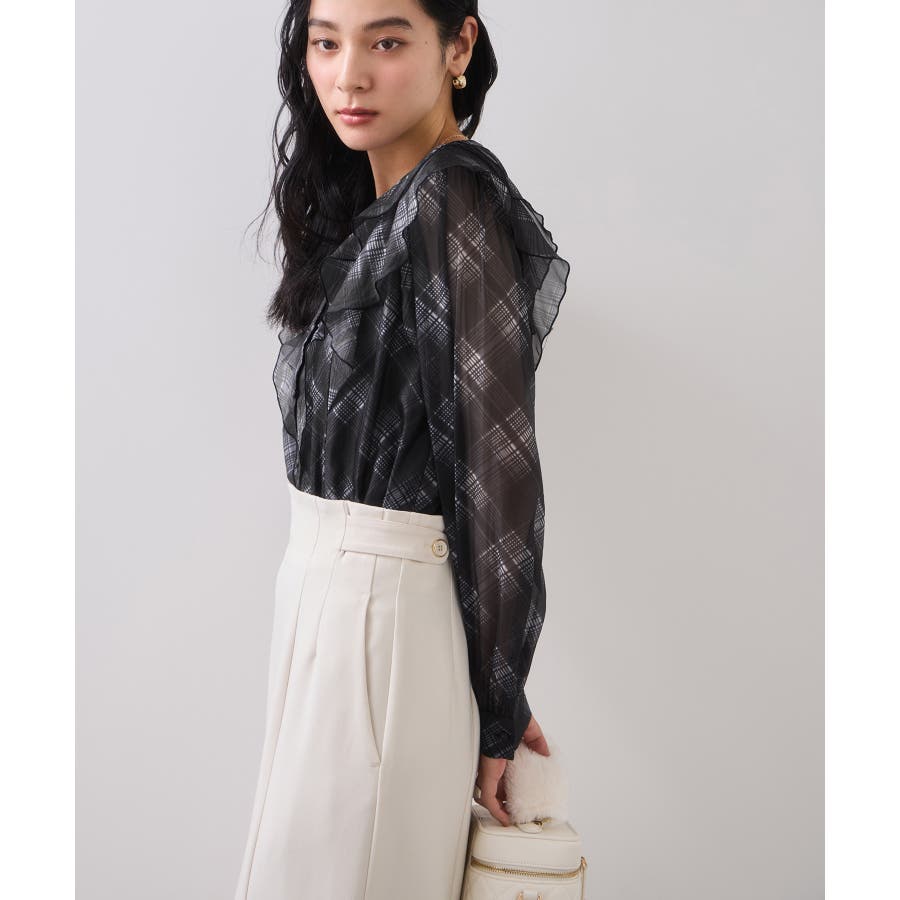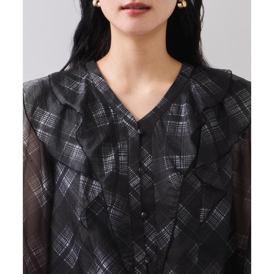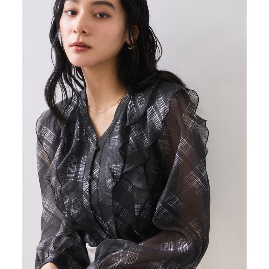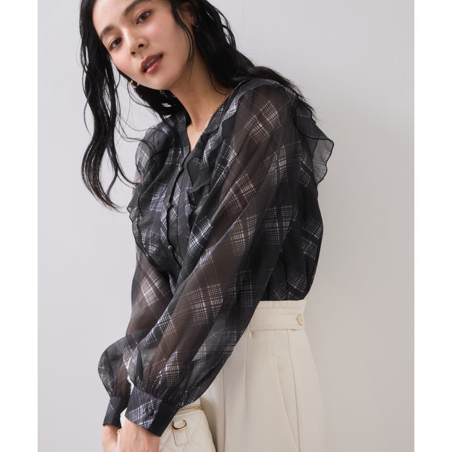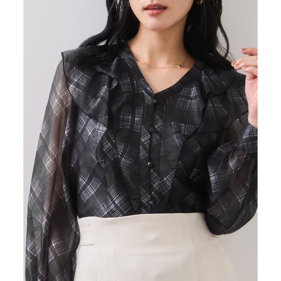 フロントに2重にフリルを重ねたデザインの1枚で着映える、コーディネートの主役トップス。インしやすい着丈感も嬉しいポイント!身頃のみ裏地付きなので安心してご着用いただけます。チェック柄はバイアスにプリントして表情を持たせました。トレンドと甘さのあるテイストをミックスさせた今秋冬にぴったりなブラウスです!