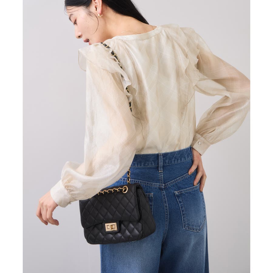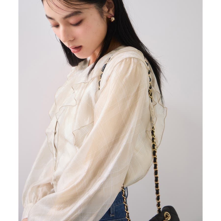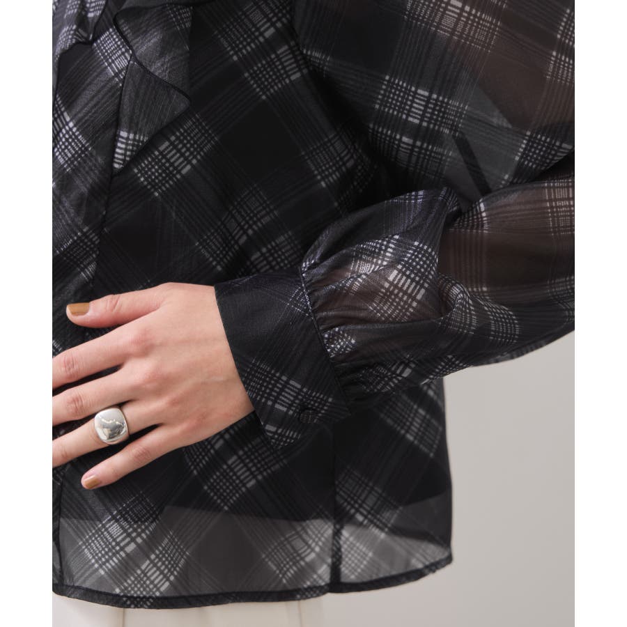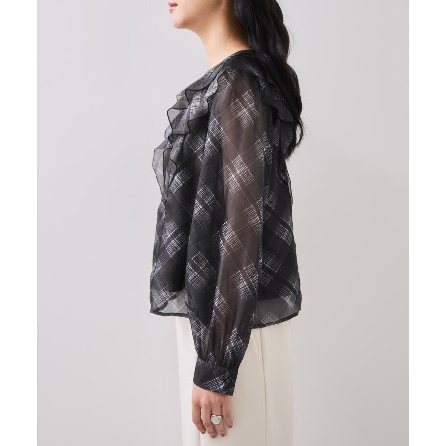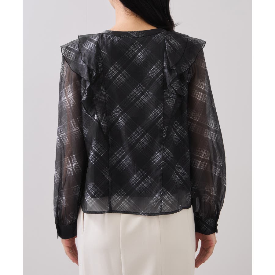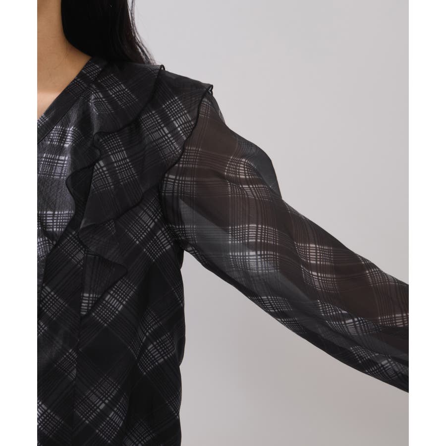 フロントに2重にフリルを重ねたデザインの1枚で着映える、コーディネートの主役トップス。インしやすい着丈感も嬉しいポイント!身頃のみ裏地付きなので安心してご着用いただけます。チェック柄はバイアスにプリントして表情を持たせました。トレンドと甘さのあるテイストをミックスさせた今秋冬にぴったりなブラウスです!