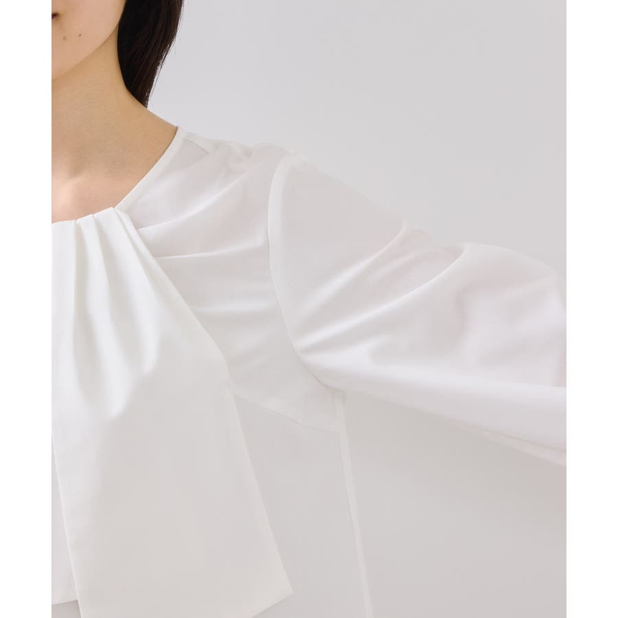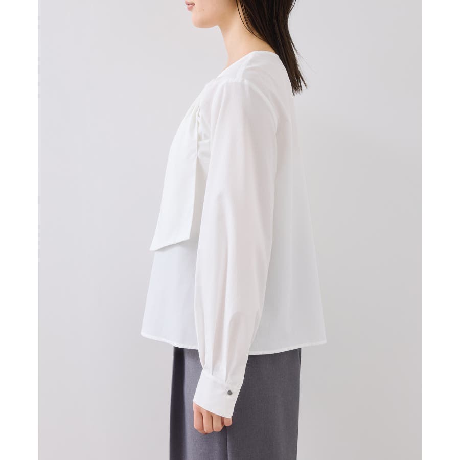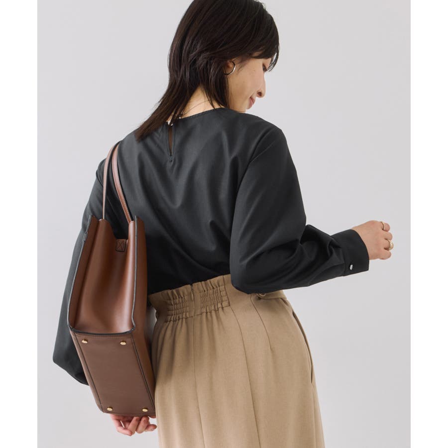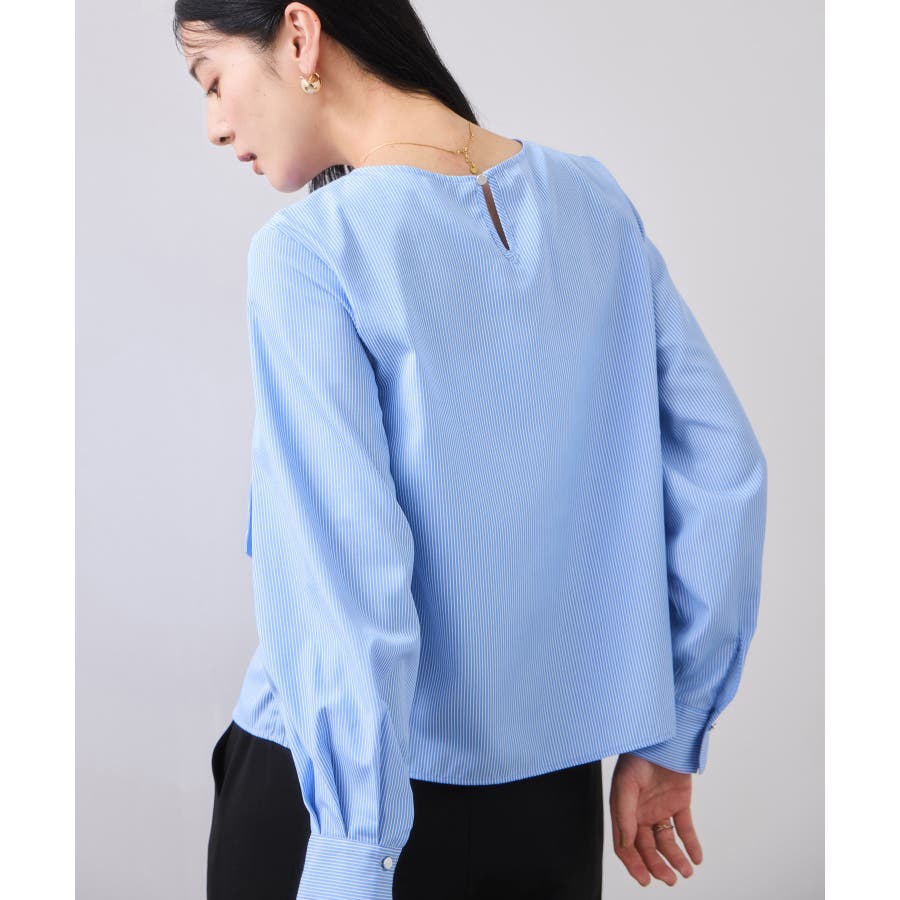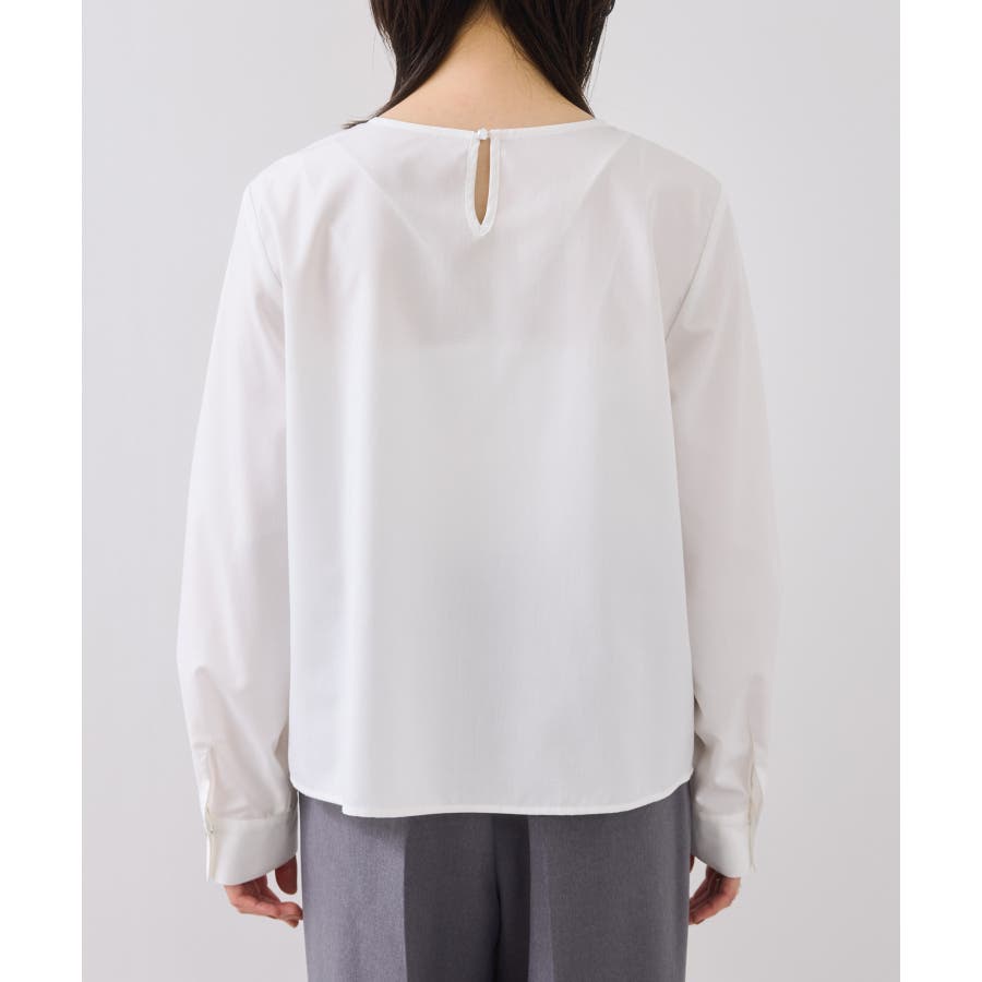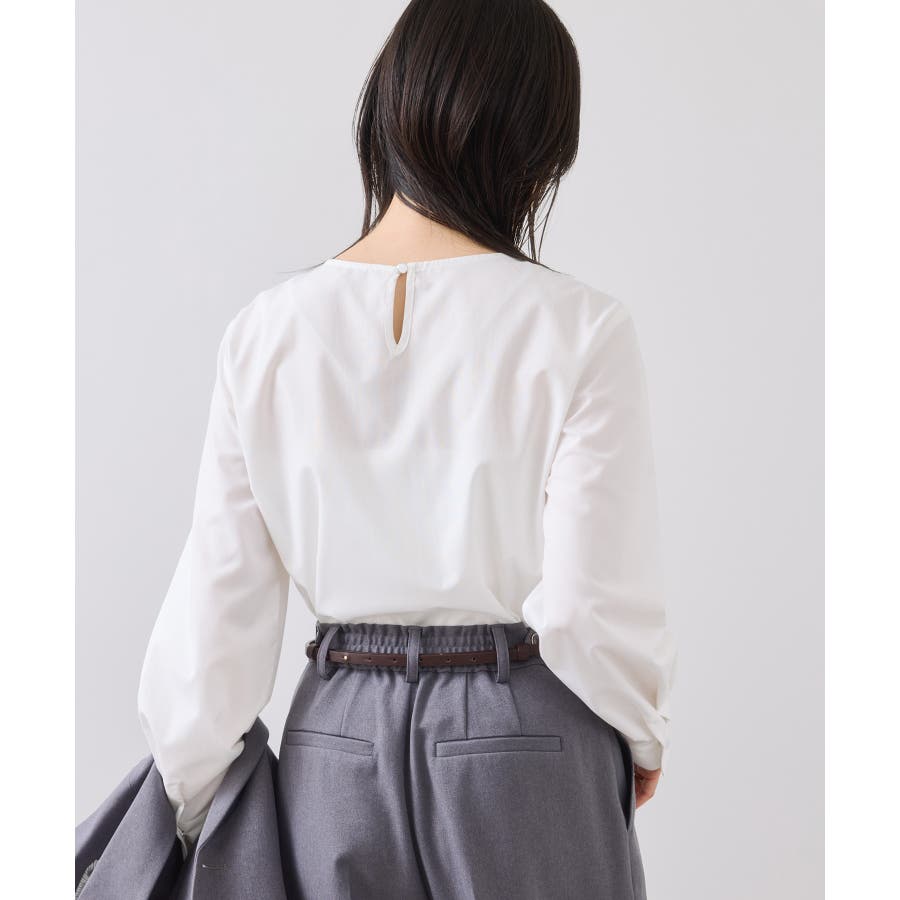 インスタイルで着用しやすいサイズ感です。シルエットは裾に向かって程よく広がり、着用しやすいプルオーバーブラウス。