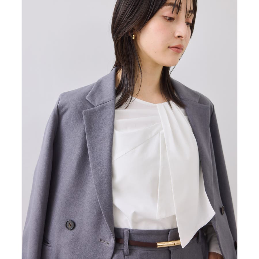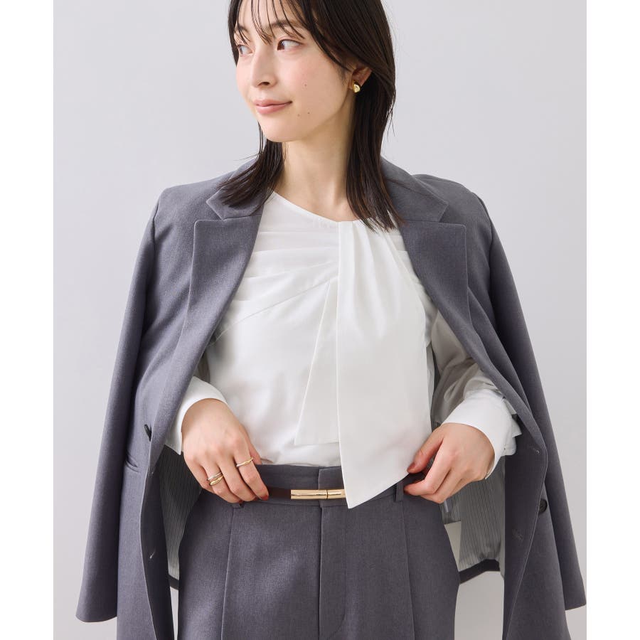 フロントのねじりデザインは顔周りを華やかに見せるのと、ジャケットインの季節にスタイリングに表情を与えます。