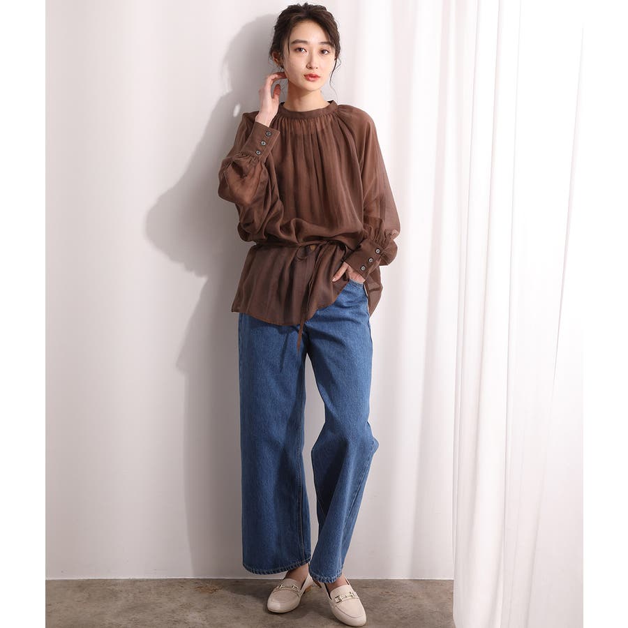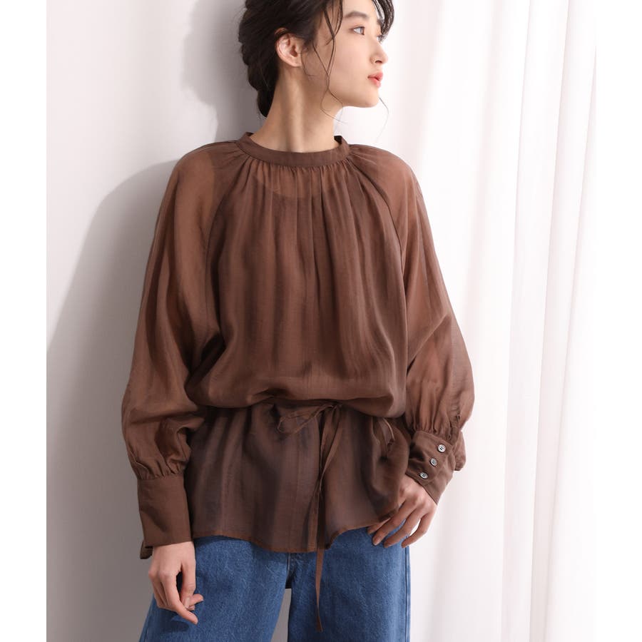 シアーな透け感とシルエットにこだわったブラウス。旬なボリューム袖、ブラウジングできる共布紐付きで女性らしく印象的な1枚です。トップスを主役にしたコーデはもちろん、カーディガンやジャンパースカートのインナーにも◎WEB店舗でしか手に入らないイチオシアイテムです。 ※素材補足 無地:ポリエステル 100% 柄:再生繊維(セルロース) 76%ナイロン 24% (モノフィラメント糸使用)