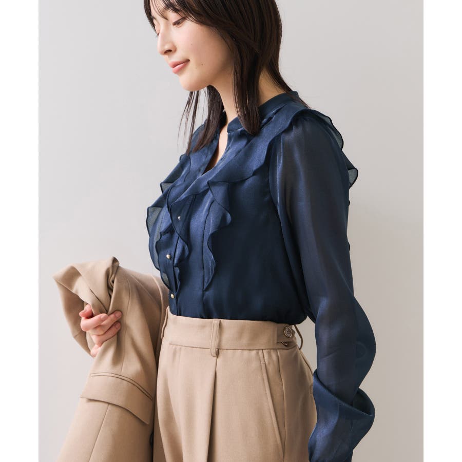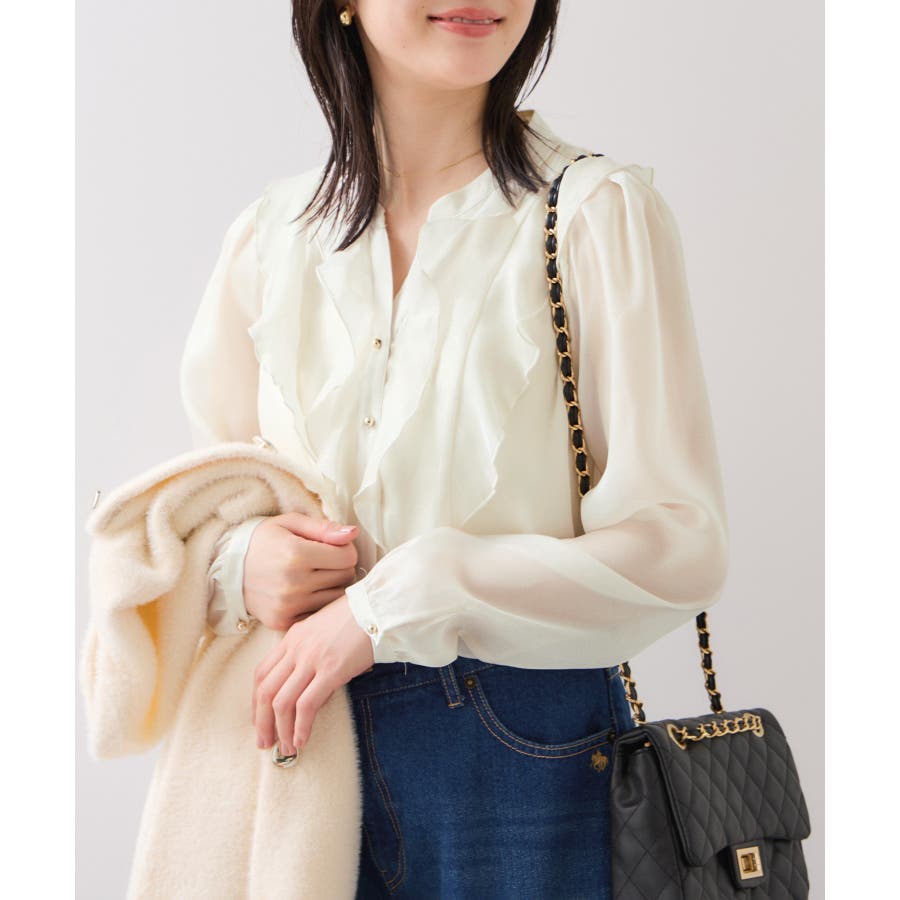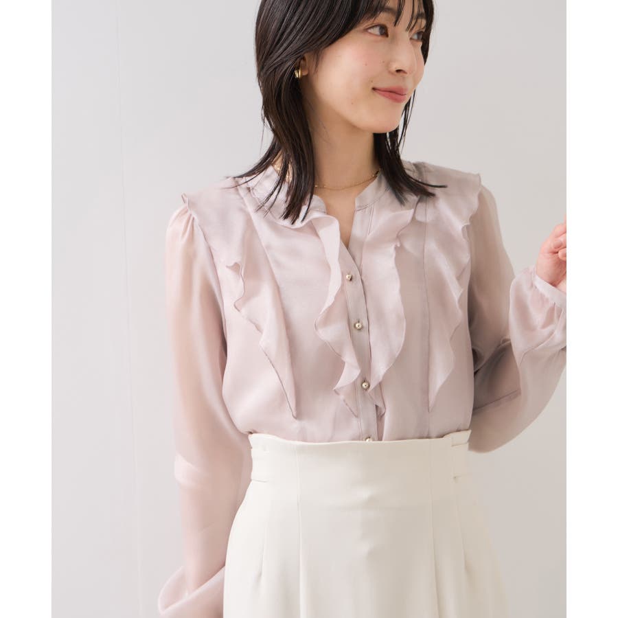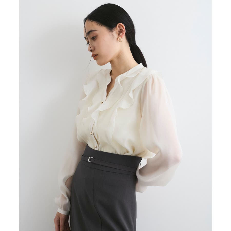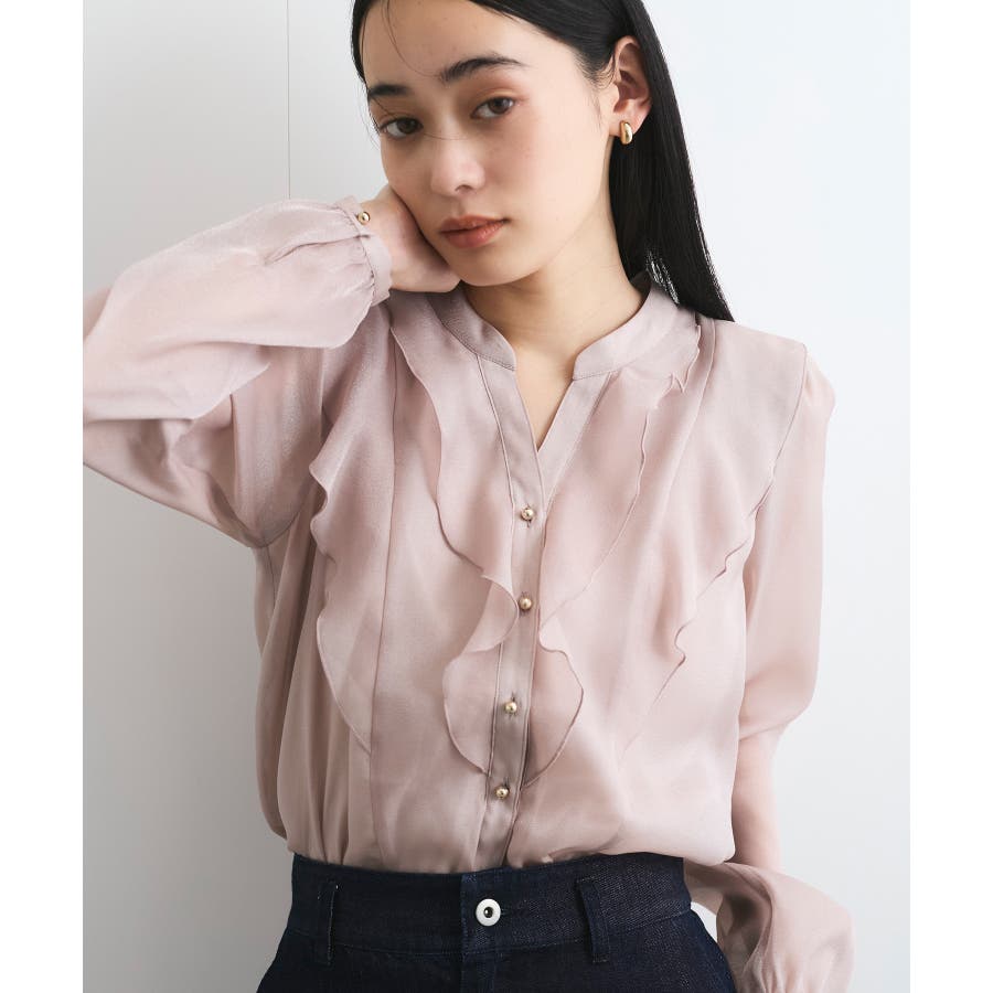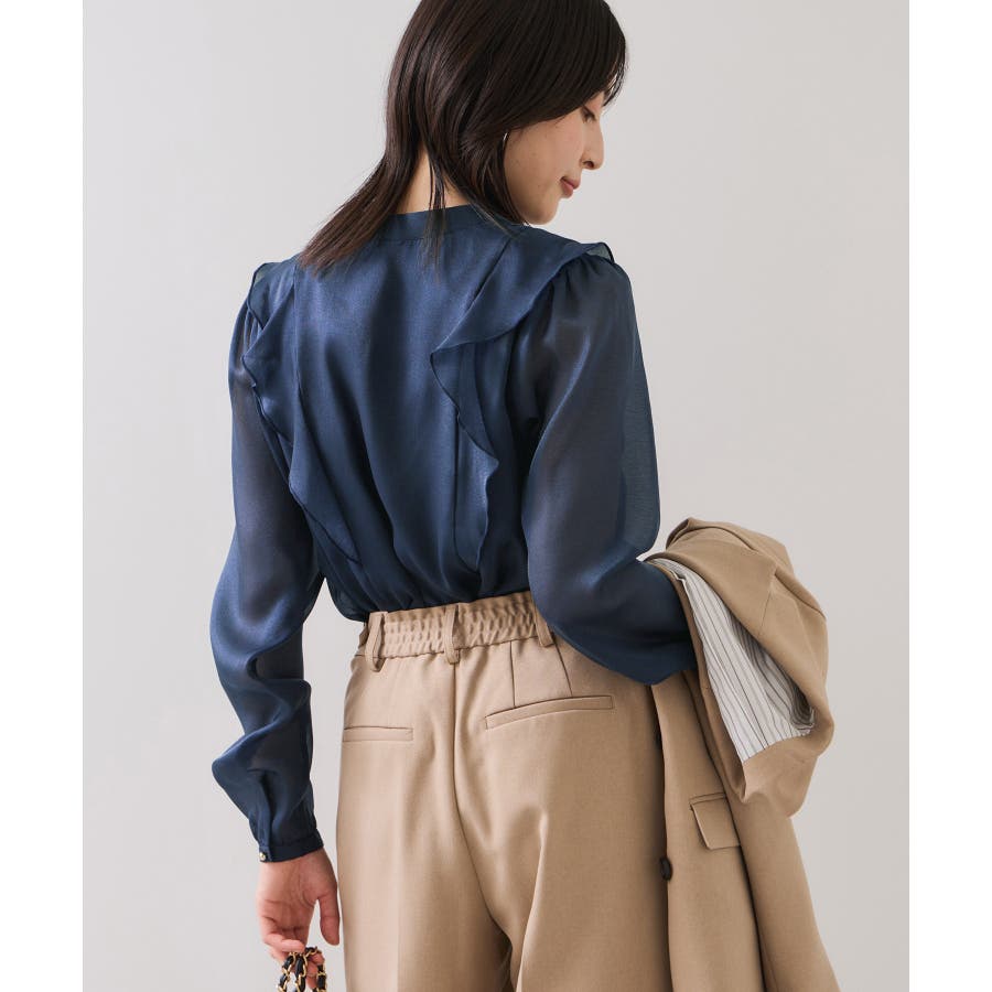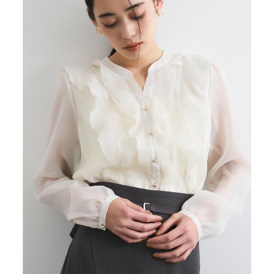 ひらりとしたシアーフリルがフェミニンな雰囲気を引き立たせるブラウス。