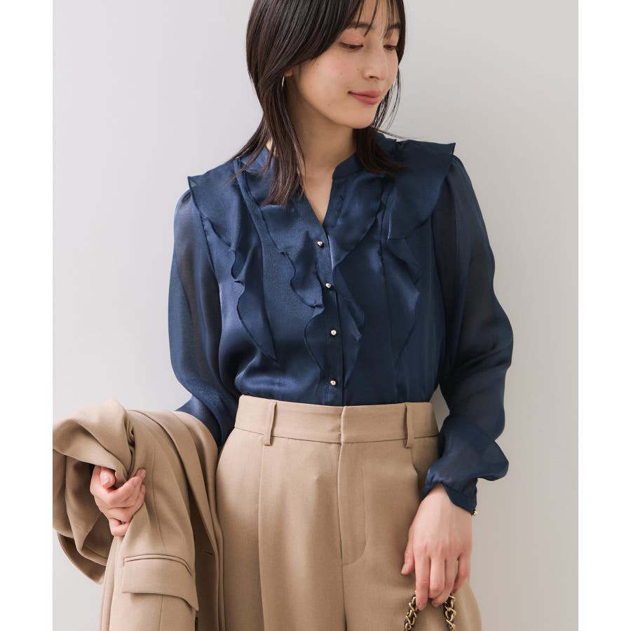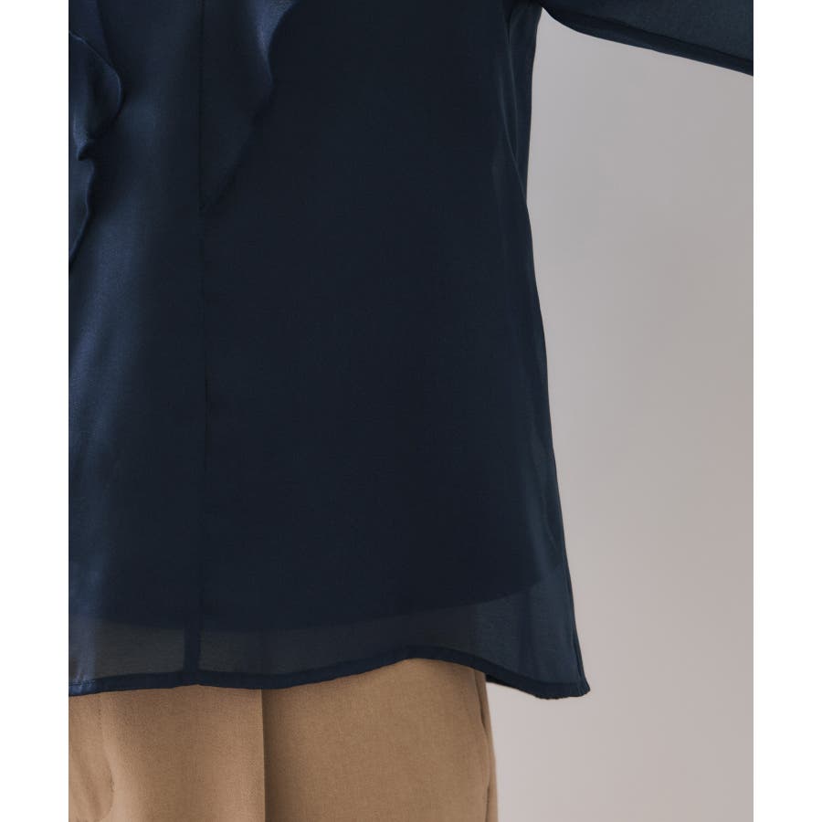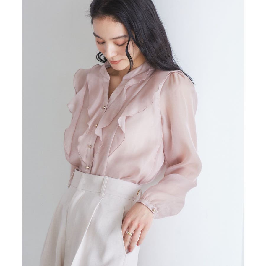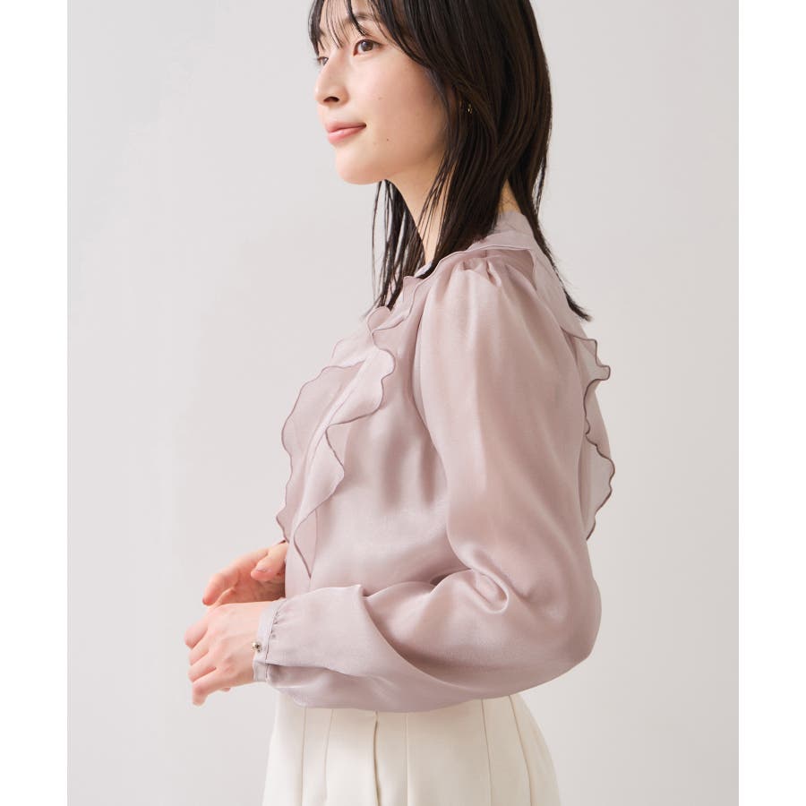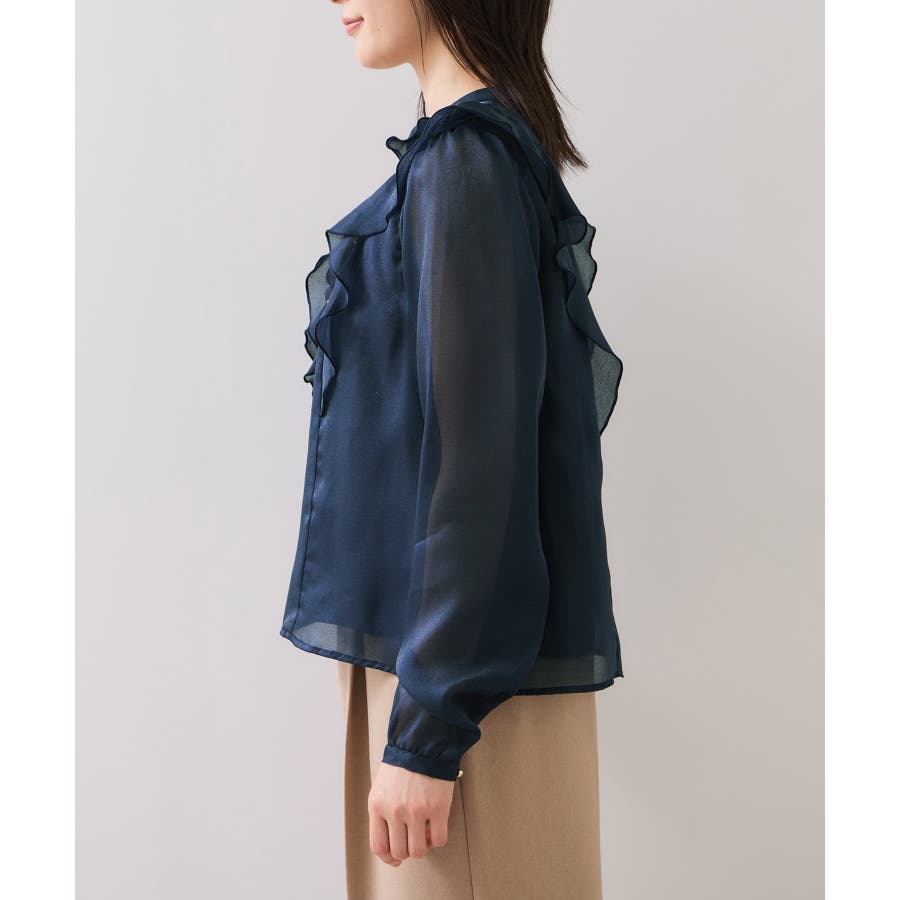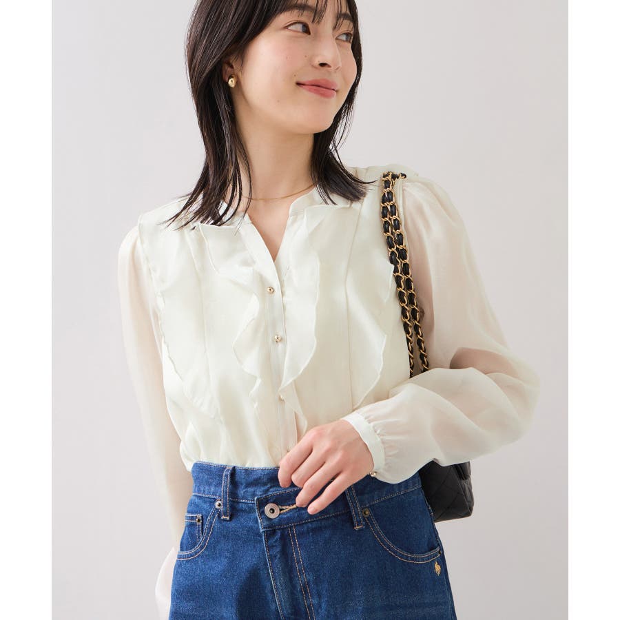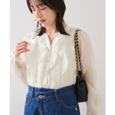 ひらりとしたシアーフリルがフェミニンな雰囲気を引き立たせるブラウス。
