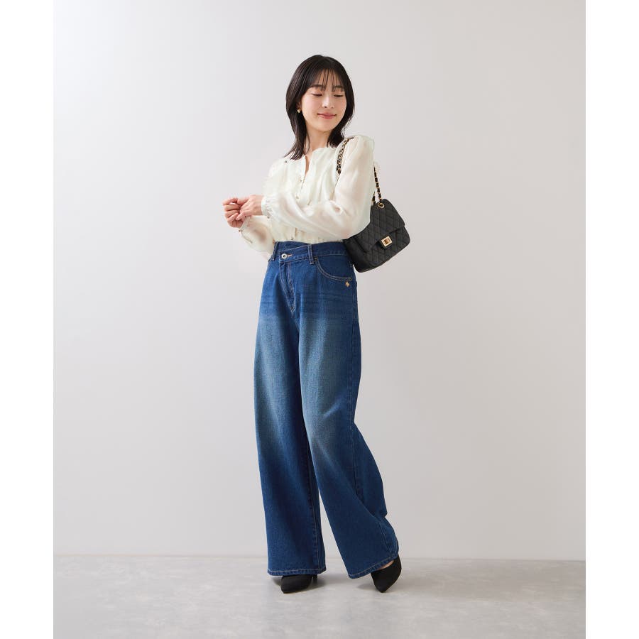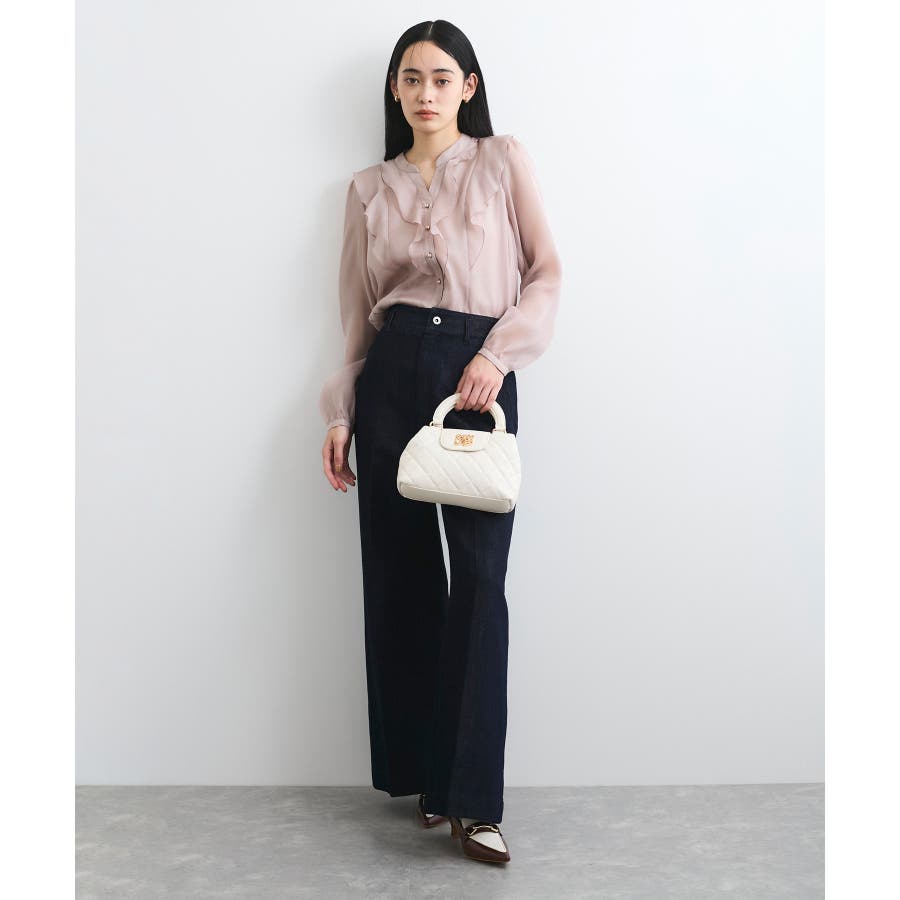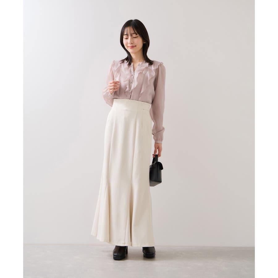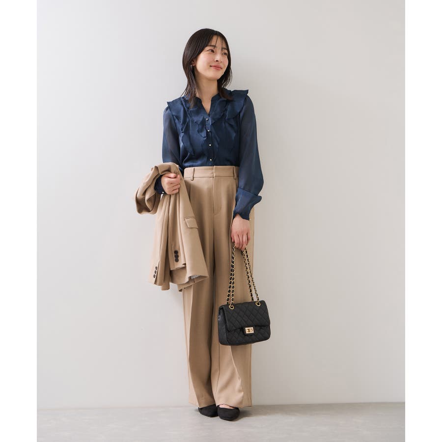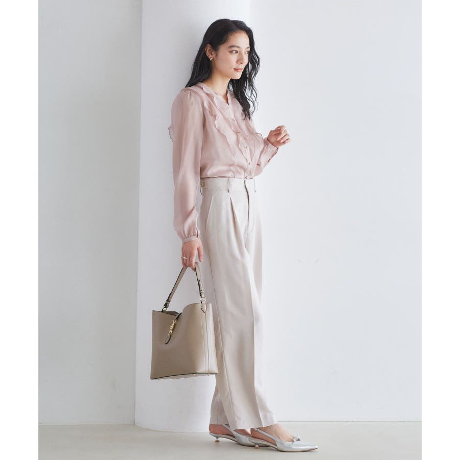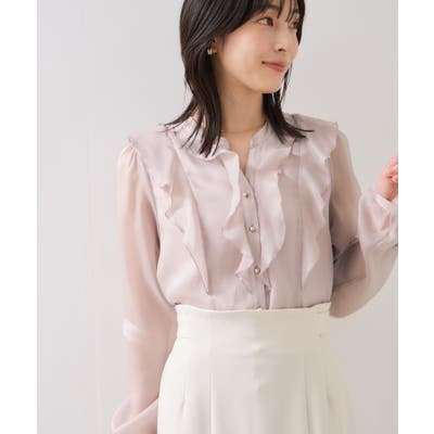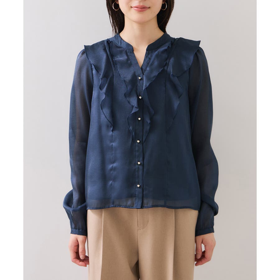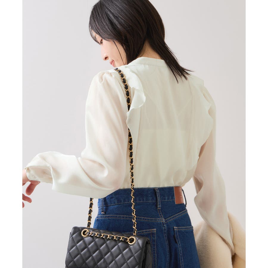 ひらりとしたシアーフリルがフェミニンな雰囲気を引き立たせるブラウス。