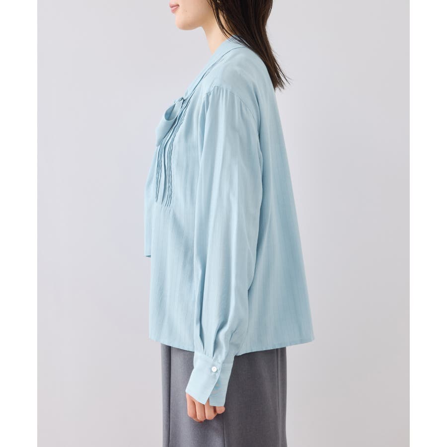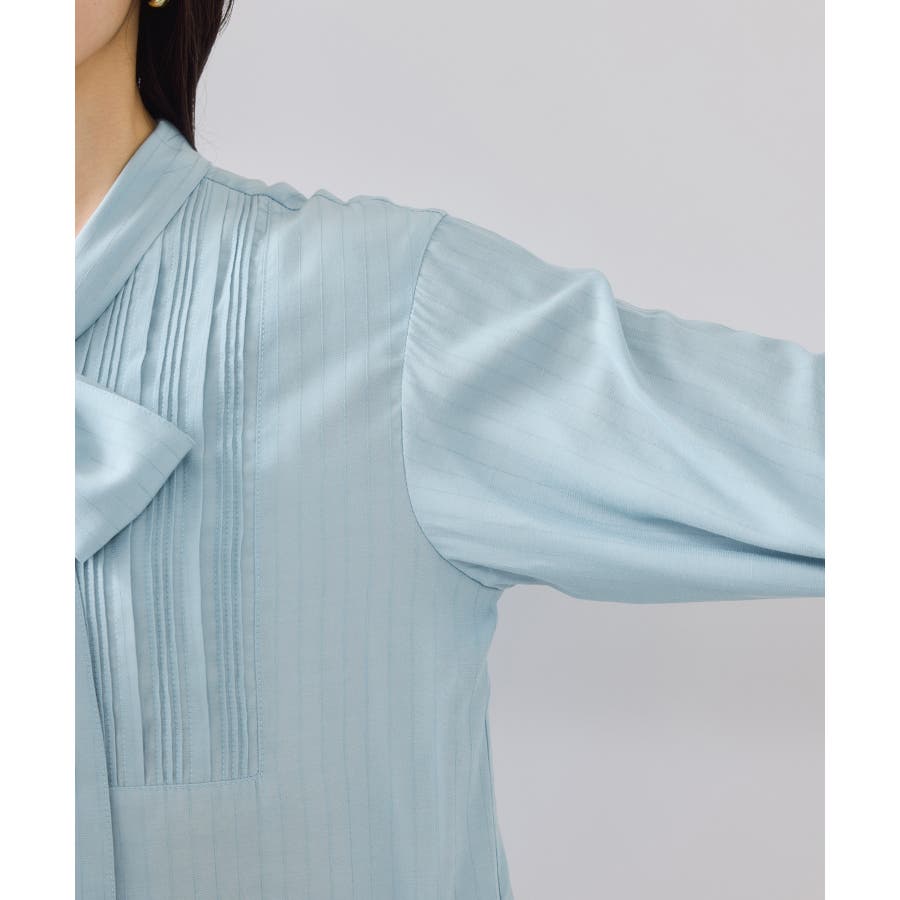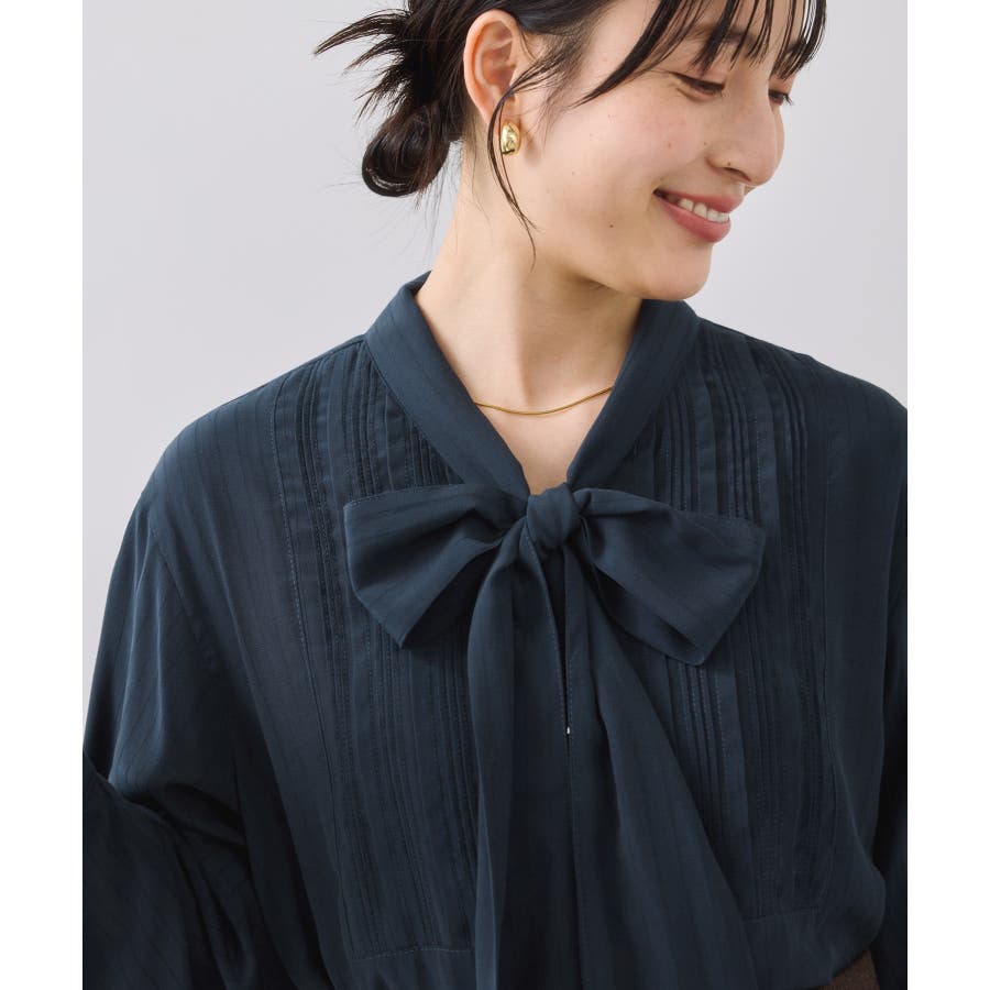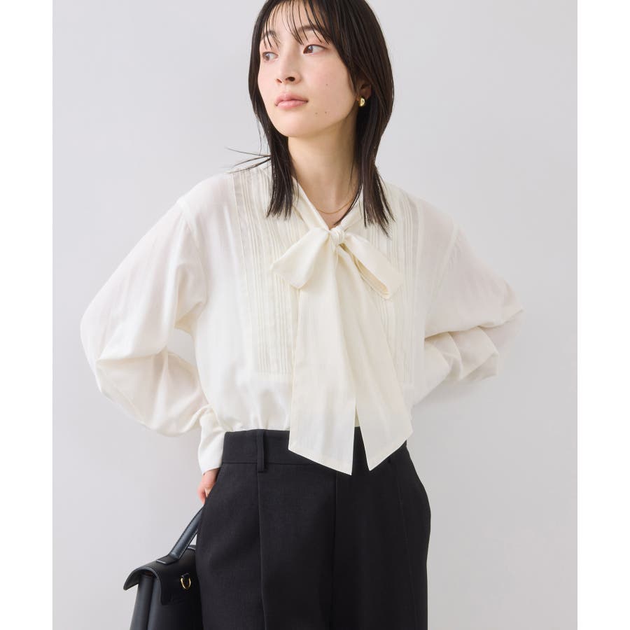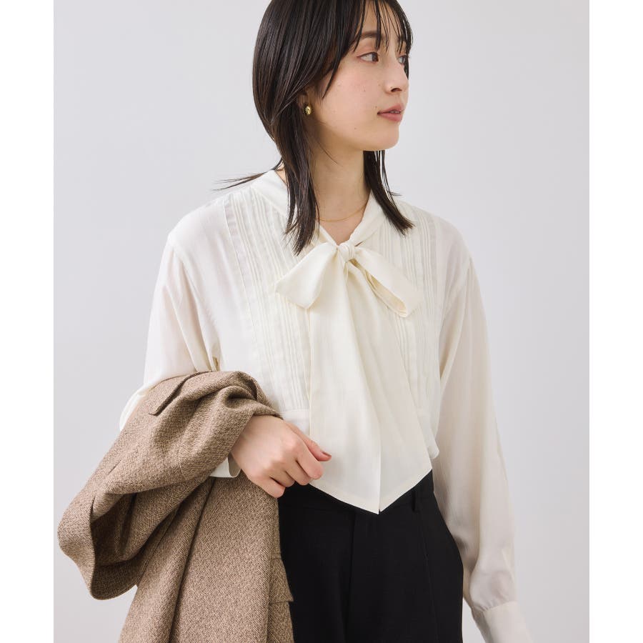 アウターのインにすることを想定し、フロントにデザインを入れました。ランダムピッチで施したピンタックはシャープさがありますが、ボウタイで緩和するよう甘さをプラスしよりレディなブラウスに。袖にはやや丸みはあり、首回りにも程よく抜け感を持たせています。お仕事やお休みの日にも来ていただきたいブラウスです!