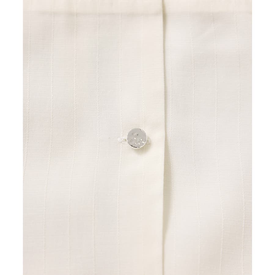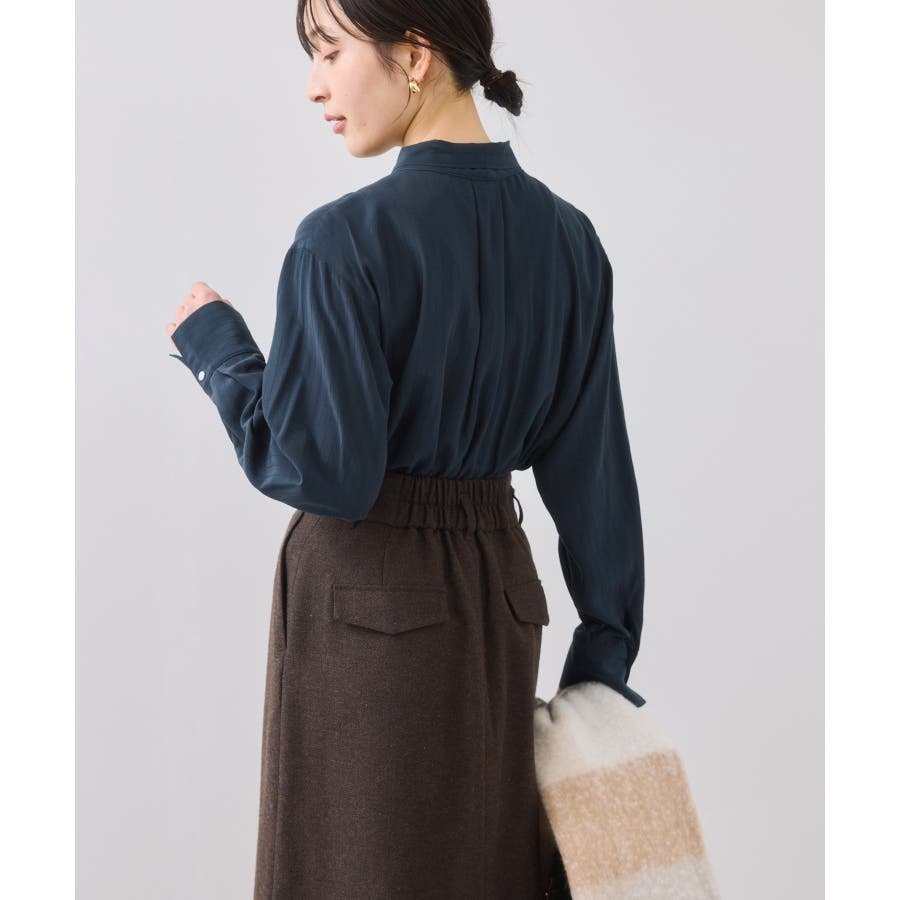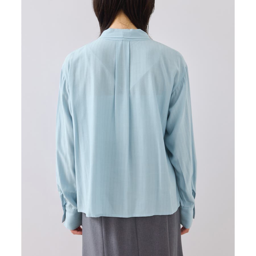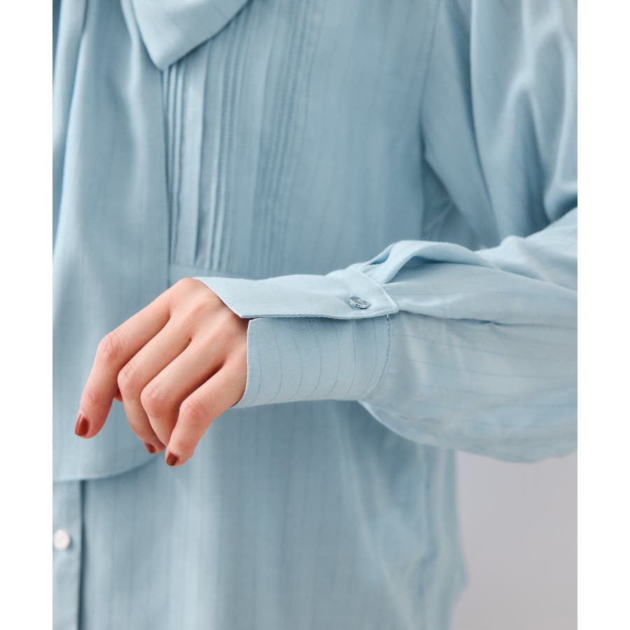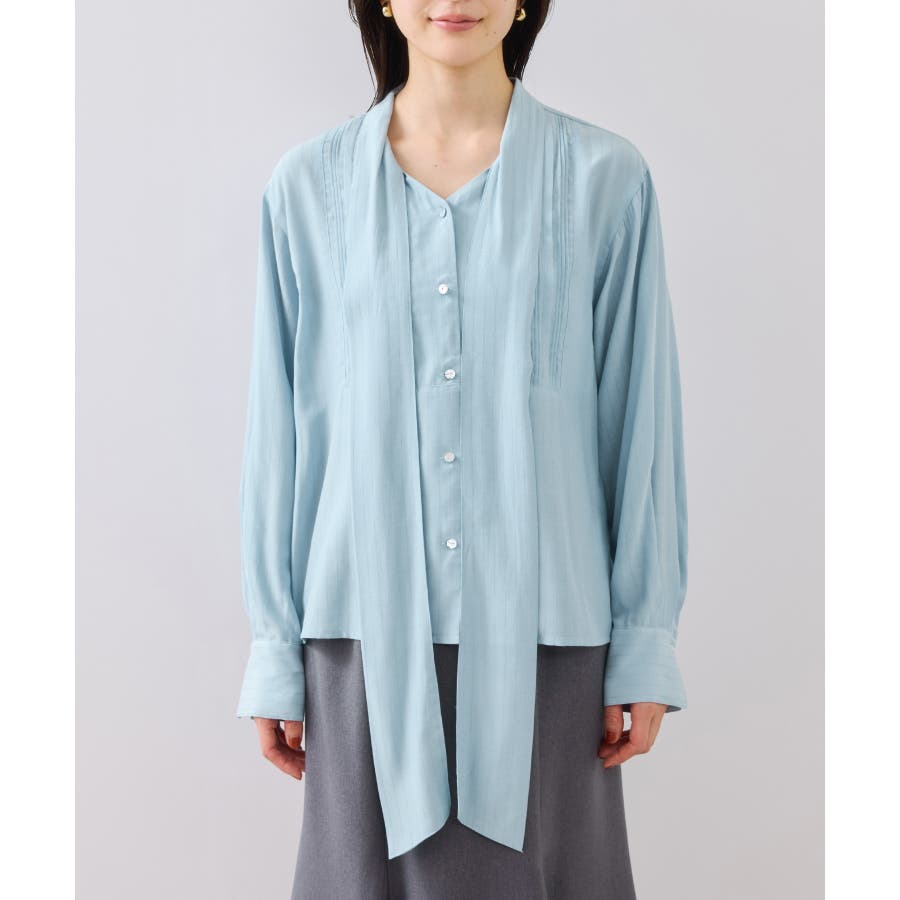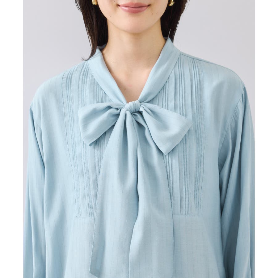 アウターのインにすることを想定し、フロントにデザインを入れました。ランダムピッチで施したピンタックはシャープさがありますが、ボウタイで緩和するよう甘さをプラスしよりレディなブラウスに。袖にはやや丸みはあり、首回りにも程よく抜け感を持たせています。お仕事やお休みの日にも来ていただきたいブラウスです!