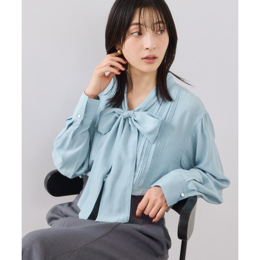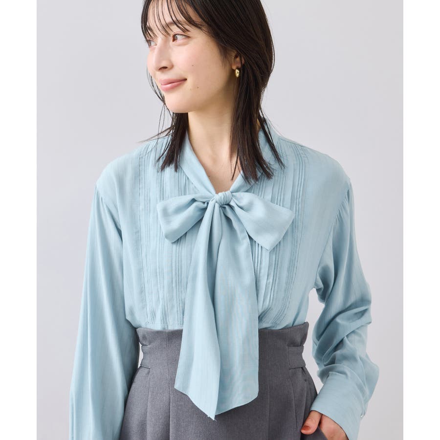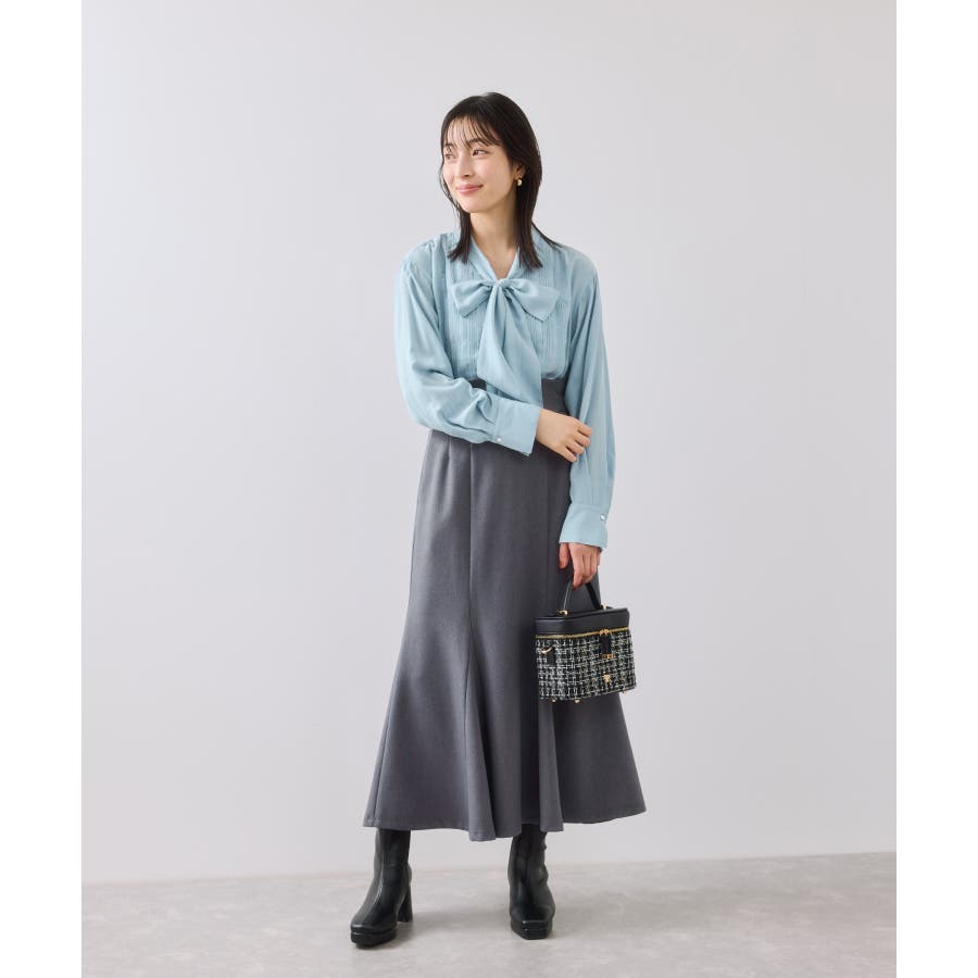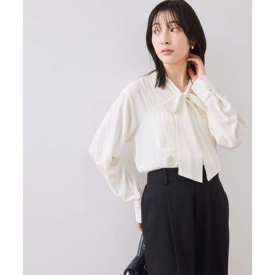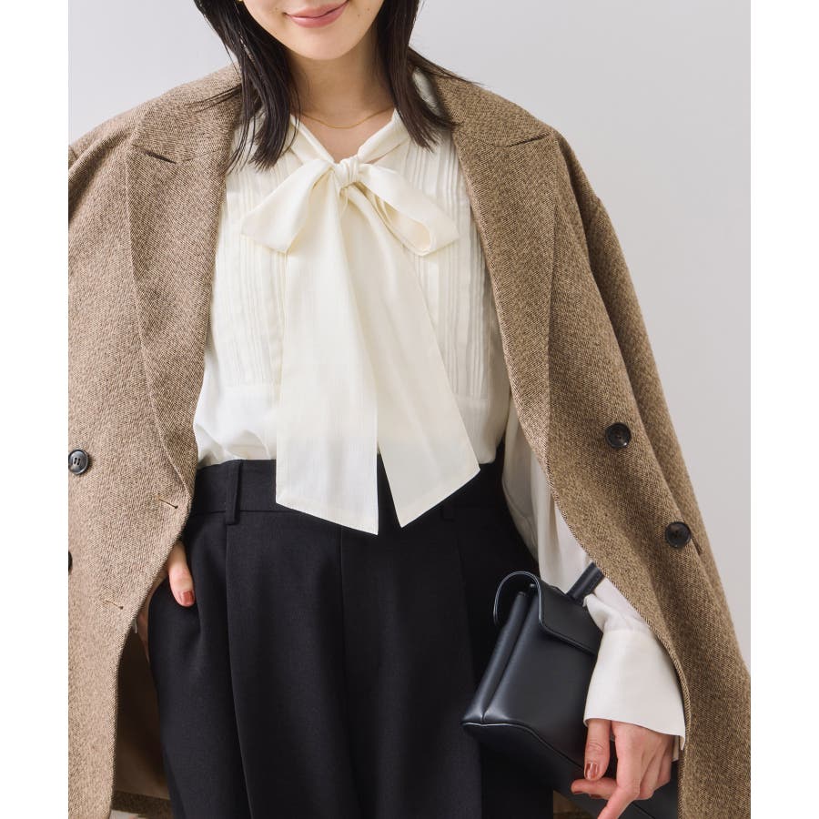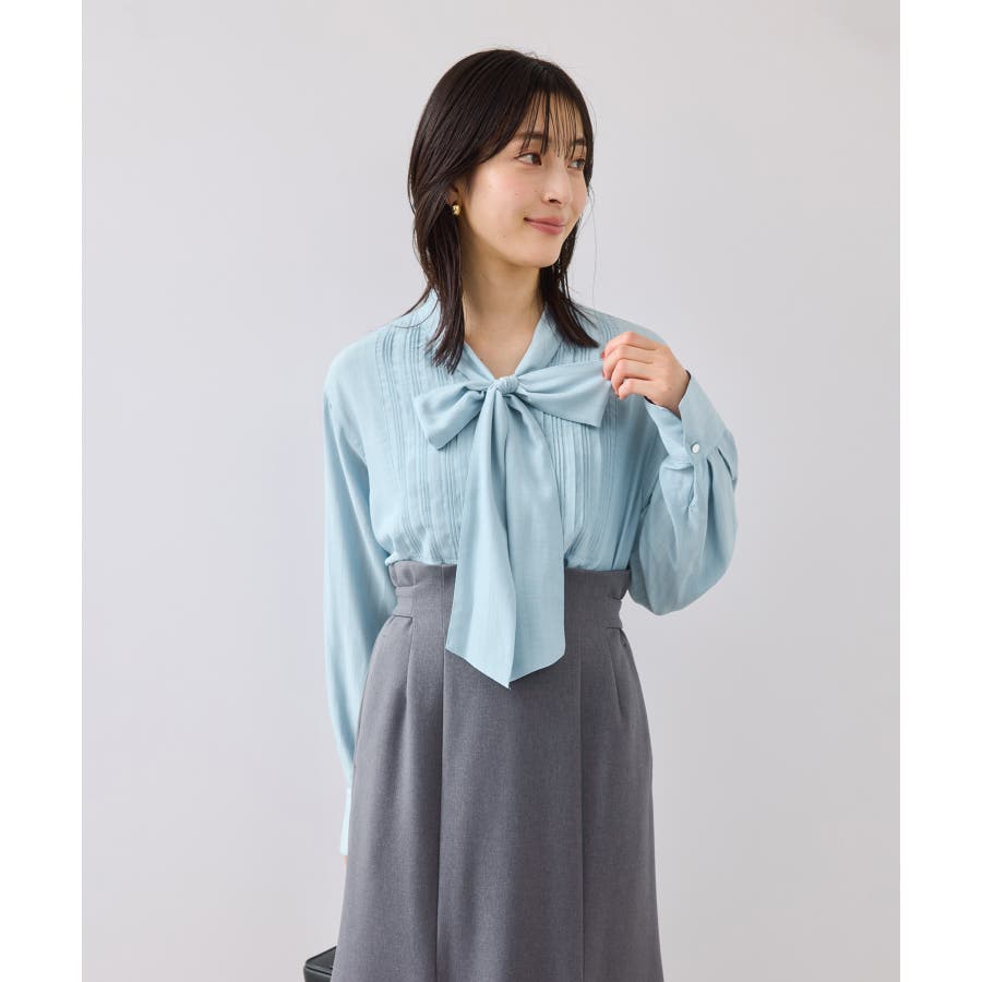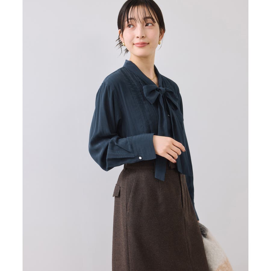 ジャケットやカーディガンの中からボウタイを出すスタイリングが可愛い!また、ファーベストなど表面感のあるアイテムとのレイヤードがおすすめです。ボトムはスカート・パンツ選ばずスタイリングできるブラウスです。