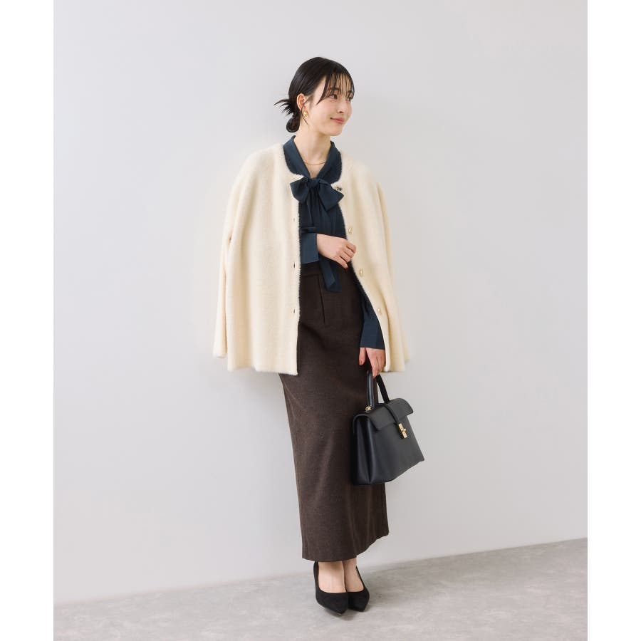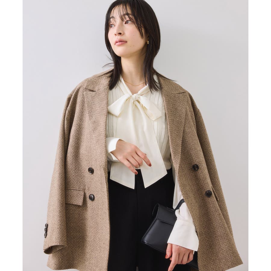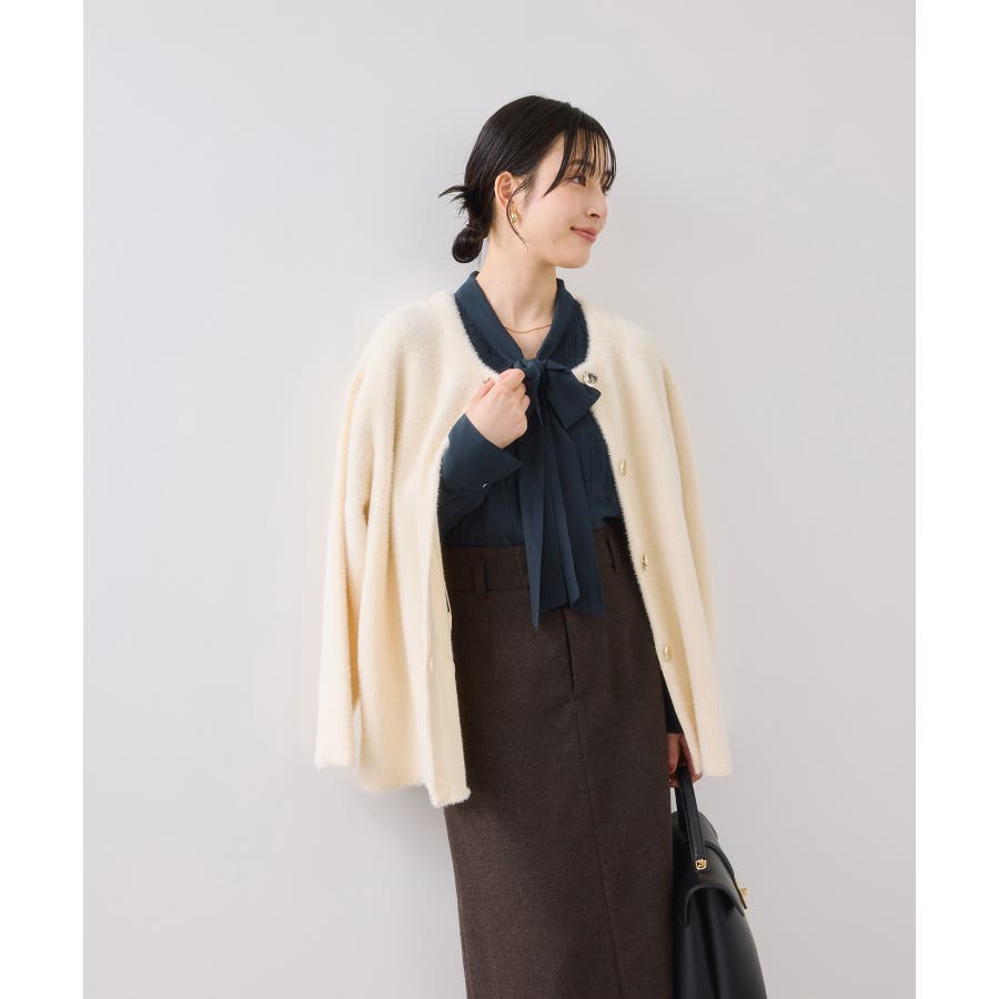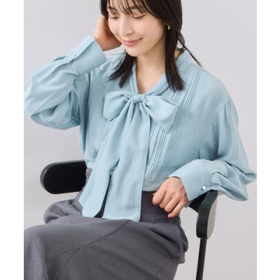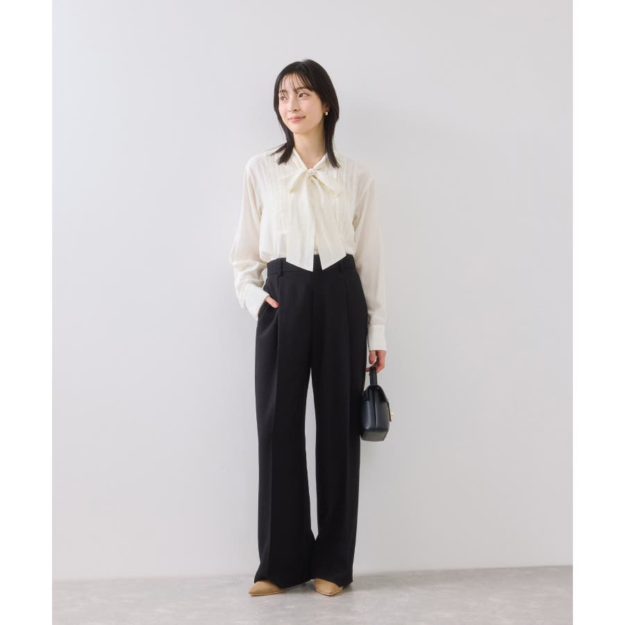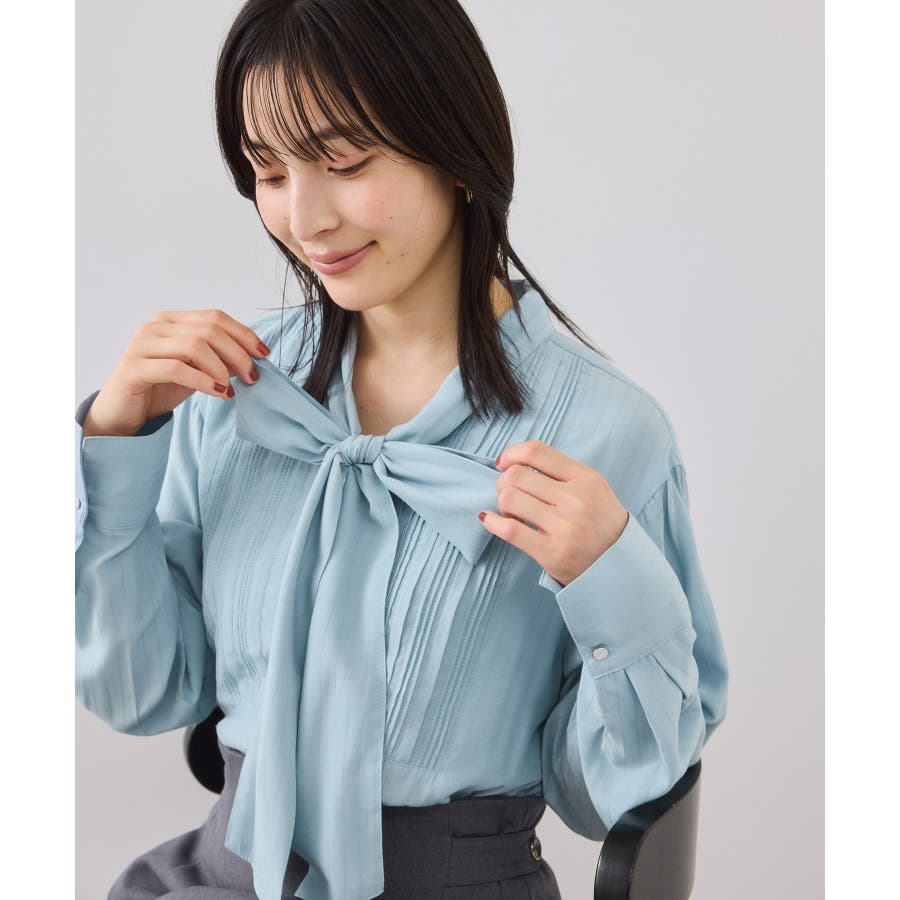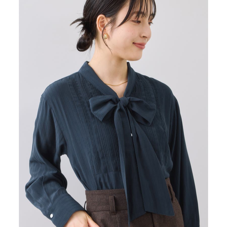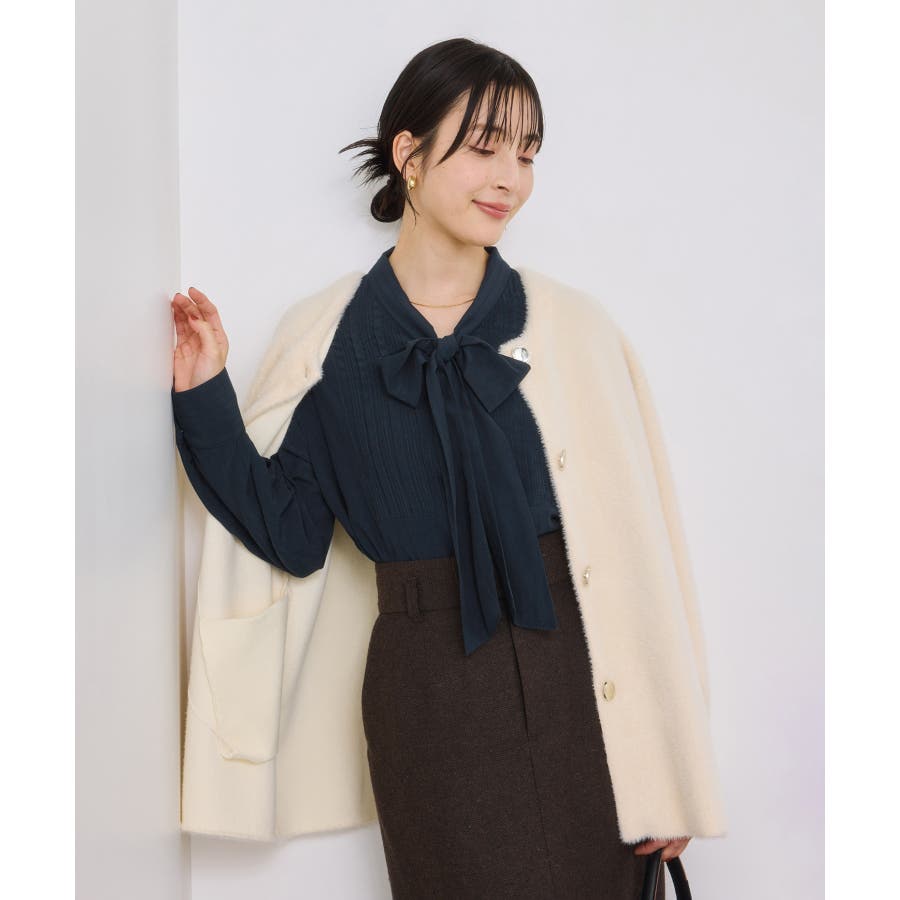 ジャケットやカーディガンの中からボウタイを出すスタイリングが可愛い!また、ファーベストなど表面感のあるアイテムとのレイヤードがおすすめです。ボトムはスカート・パンツ選ばずスタイリングできるブラウスです。