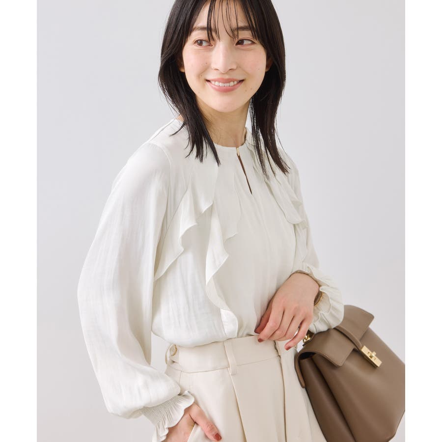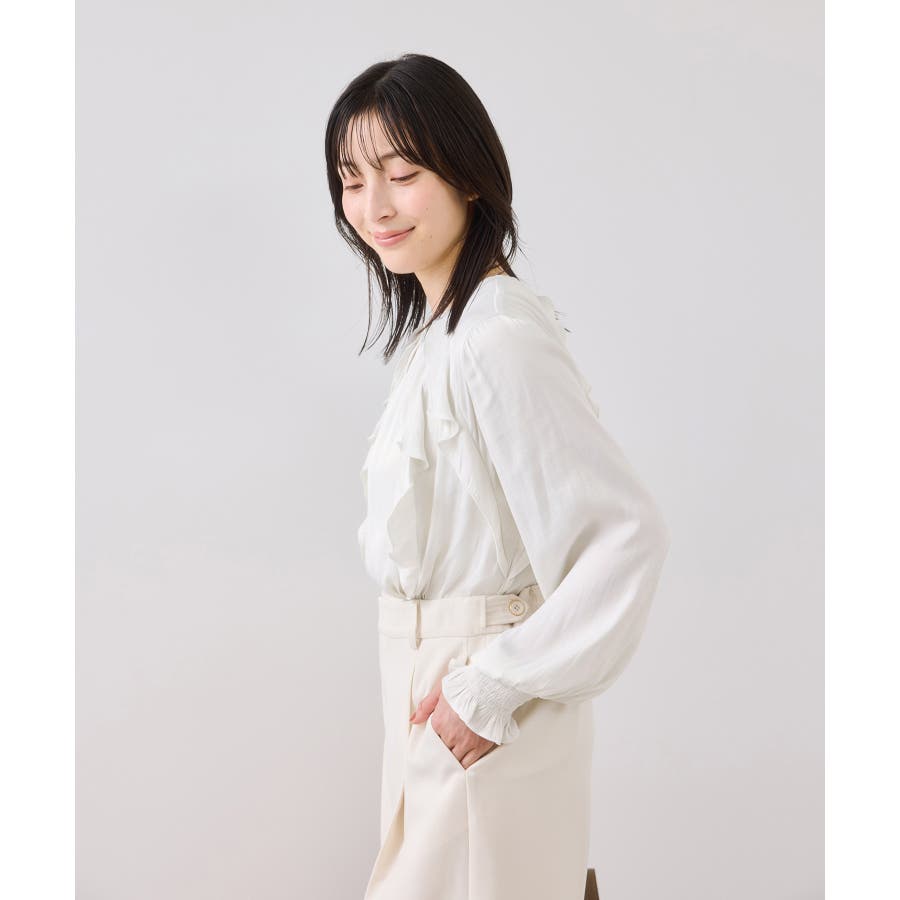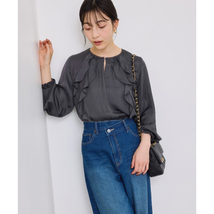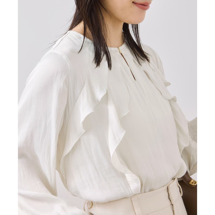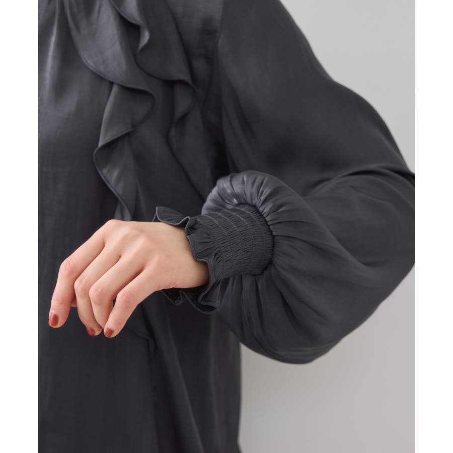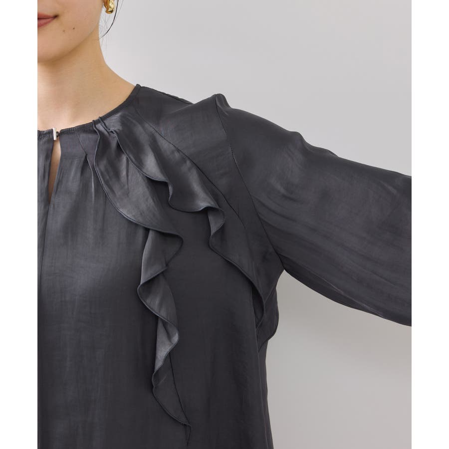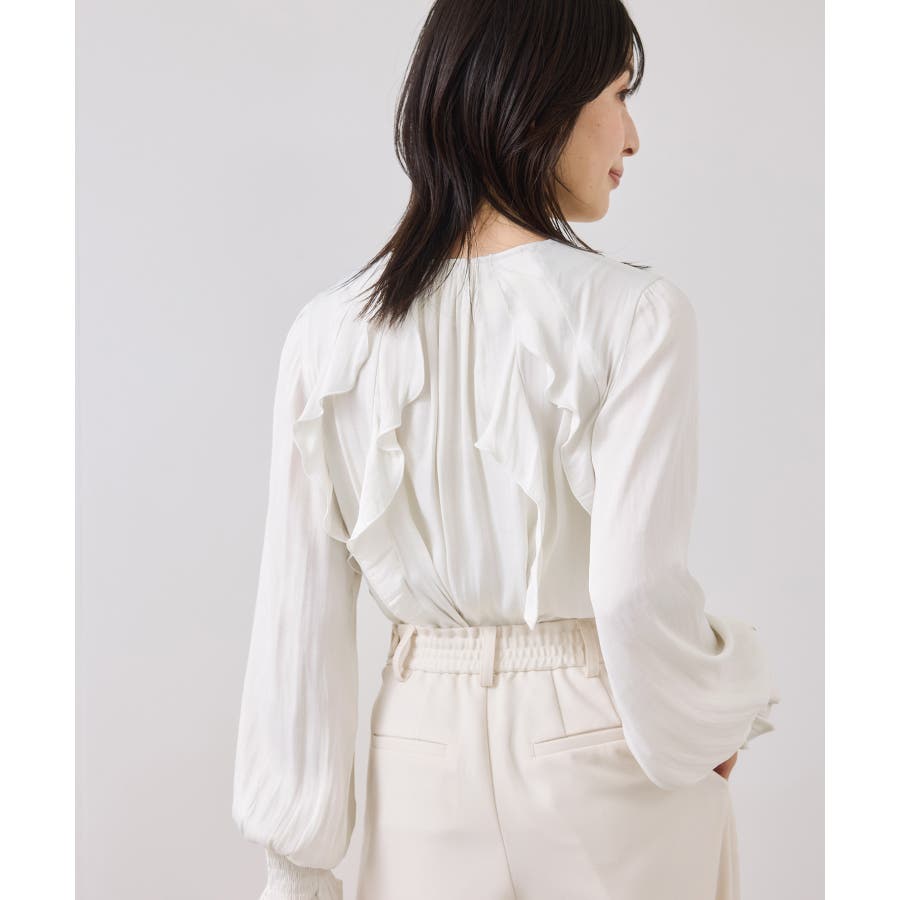 ナナメに配置されたラッフルフリルが大人っぽく着こなして頂けます。袖はキャンデースリーブで、邪魔にならないボリューム感ときちんと止まるシャーリング仕様。
