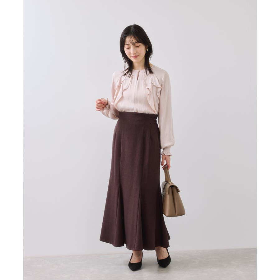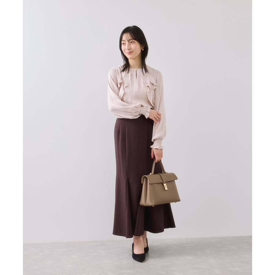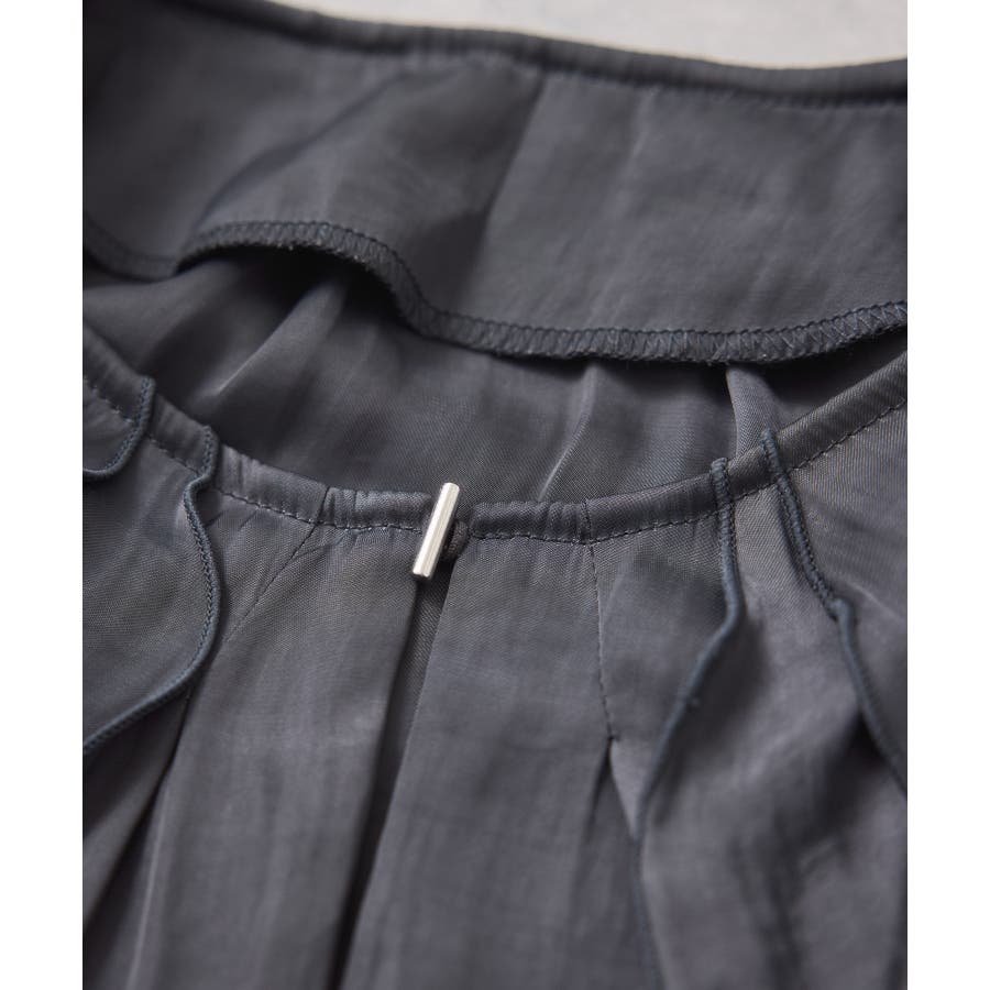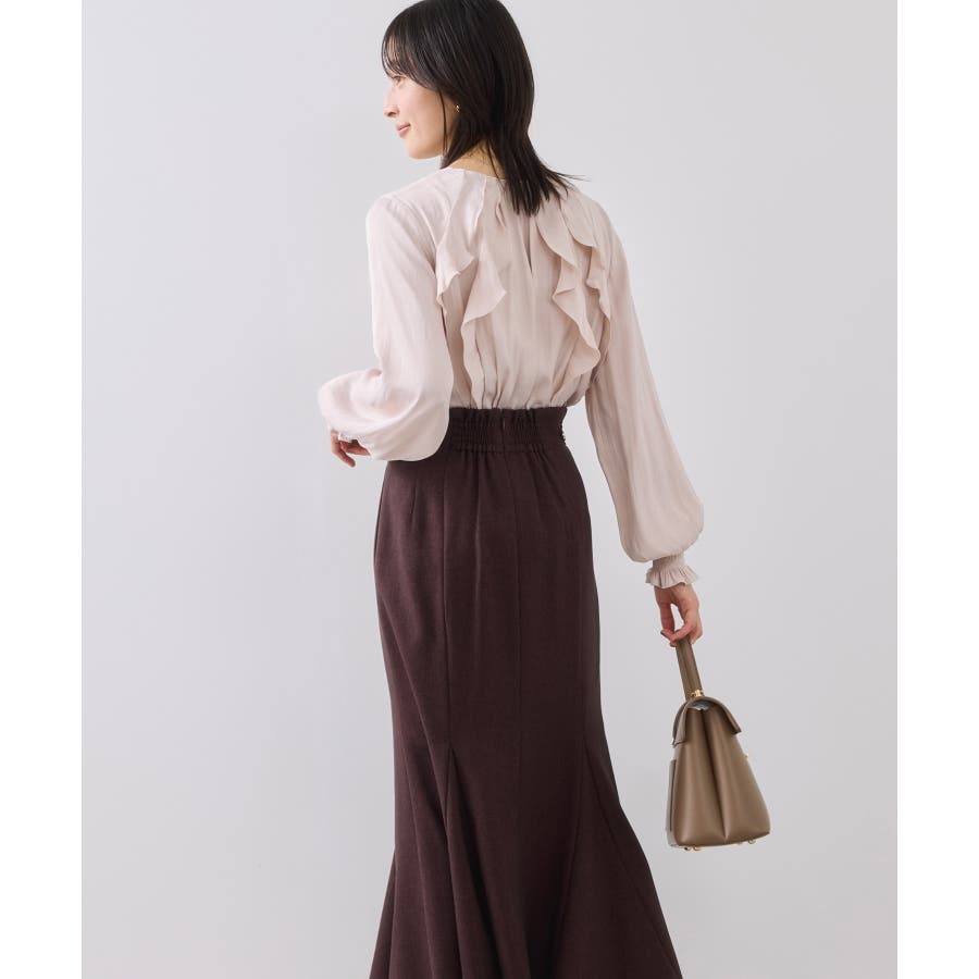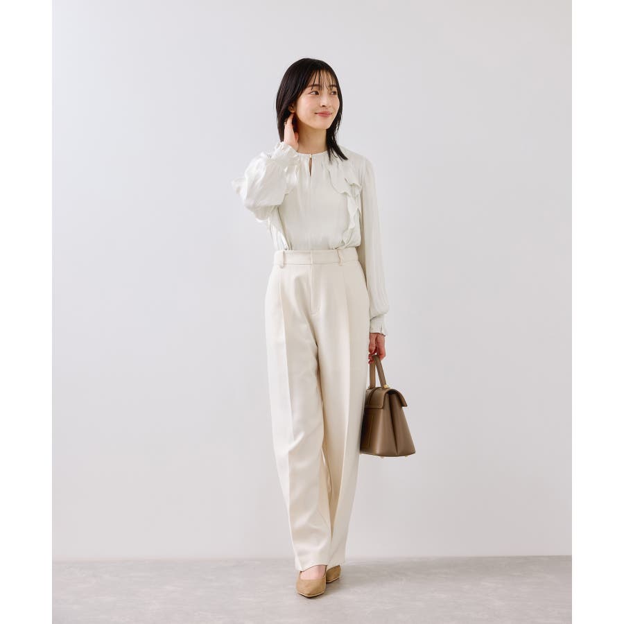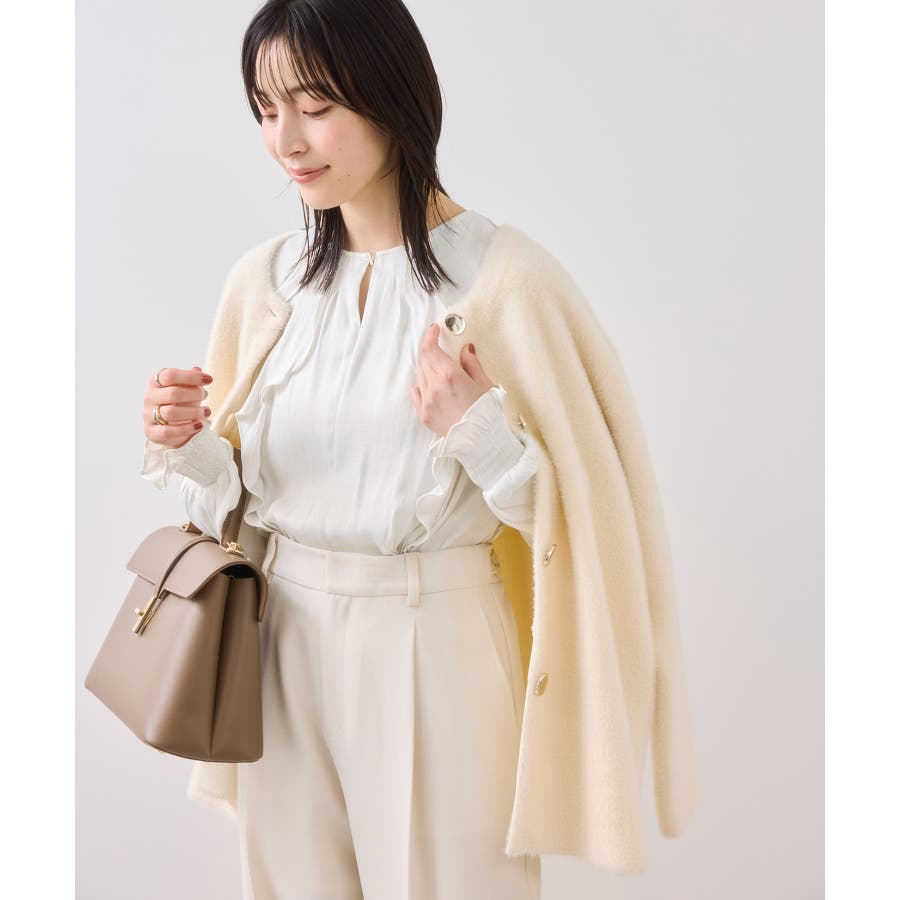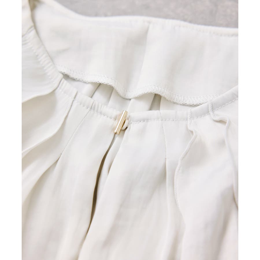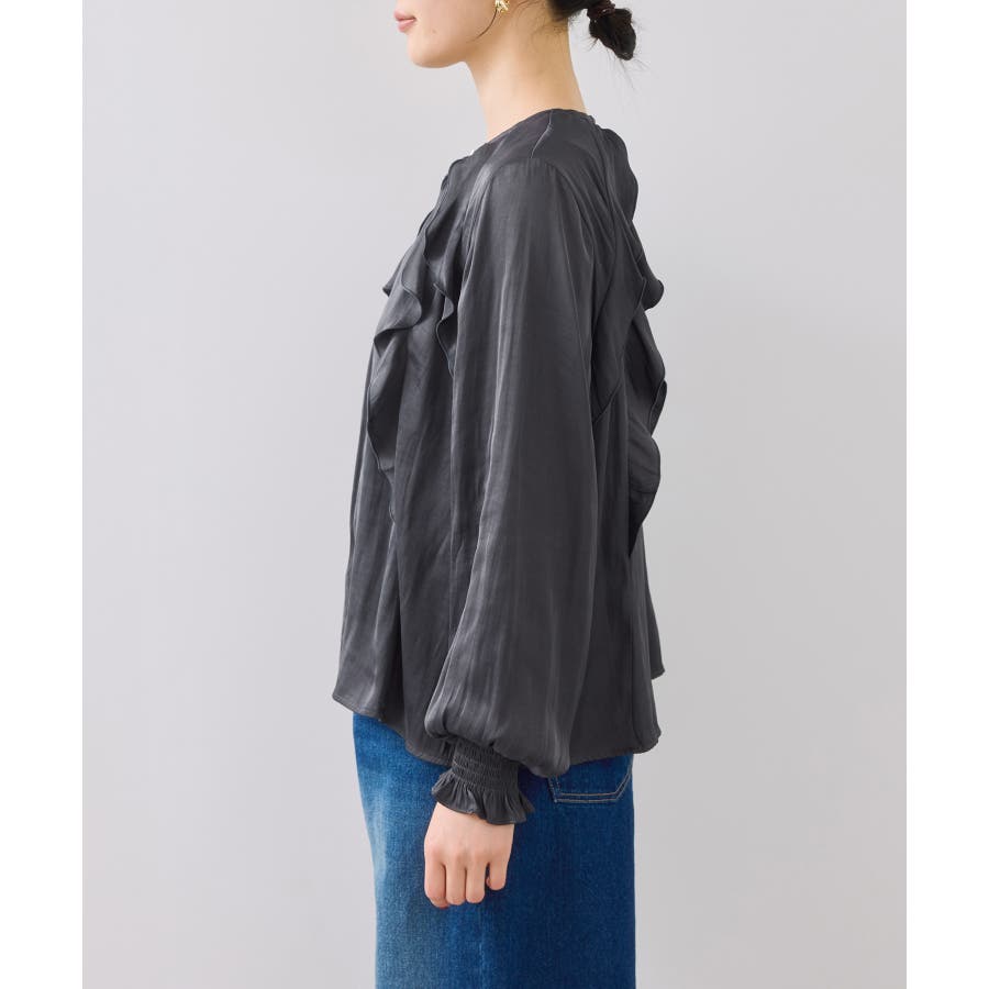ナナメに配置されたラッフルフリルが大人っぽく着こなして頂けます。袖はキャンデースリーブで、邪魔にならないボリューム感ときちんと止まるシャーリング仕様。