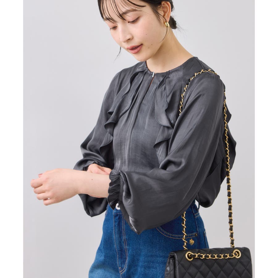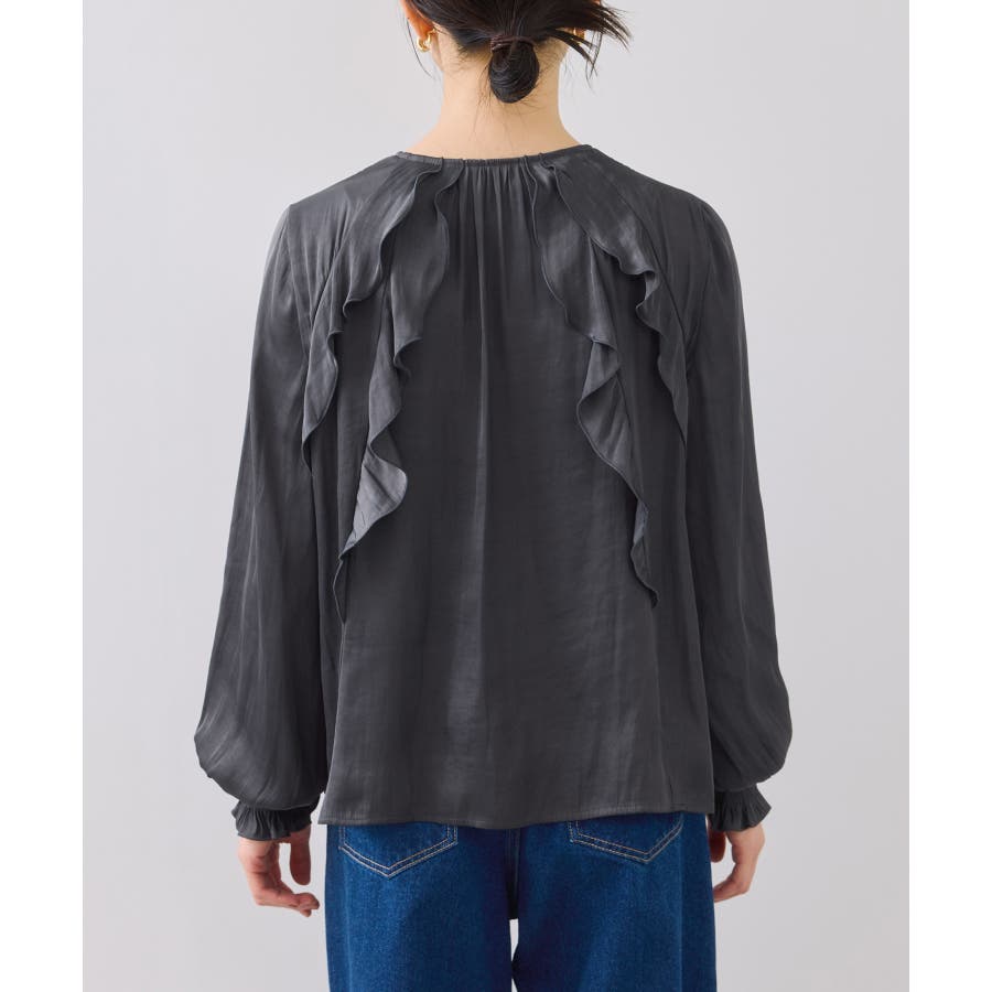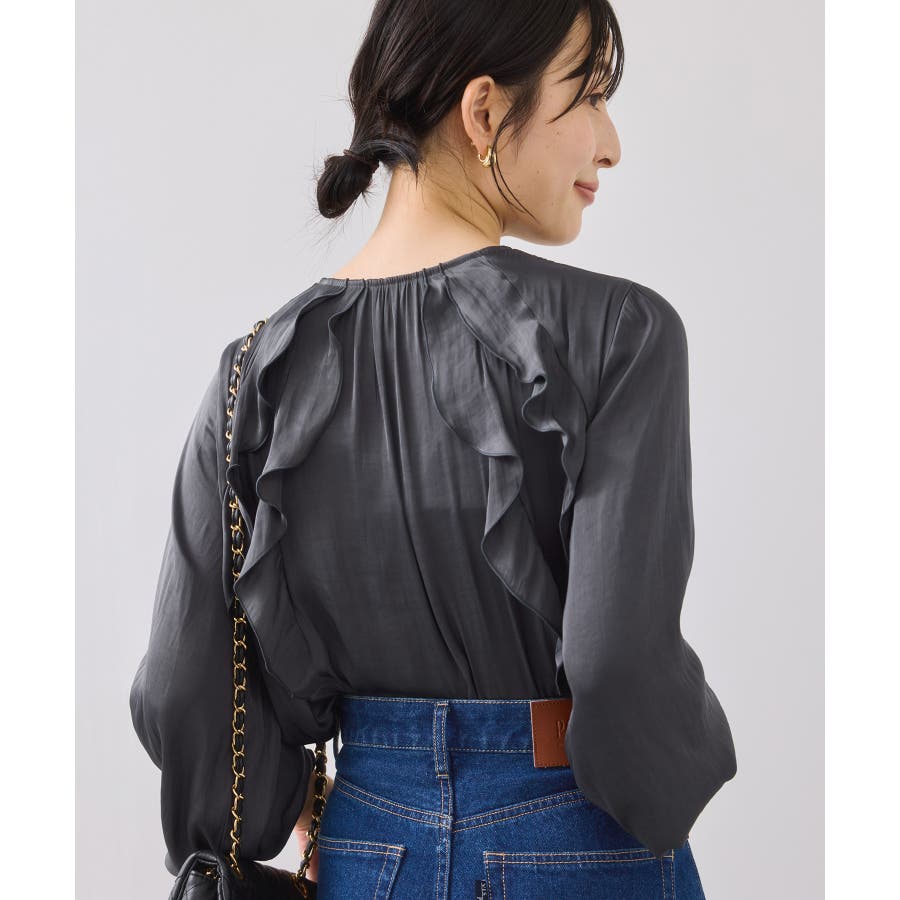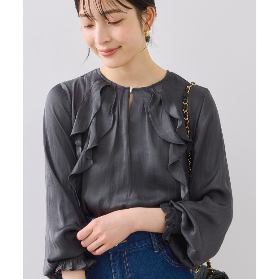 程よい光沢と前後のフリルで、1枚でサマになるブラウスです。