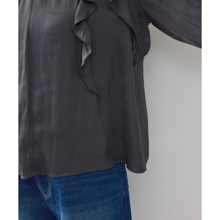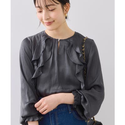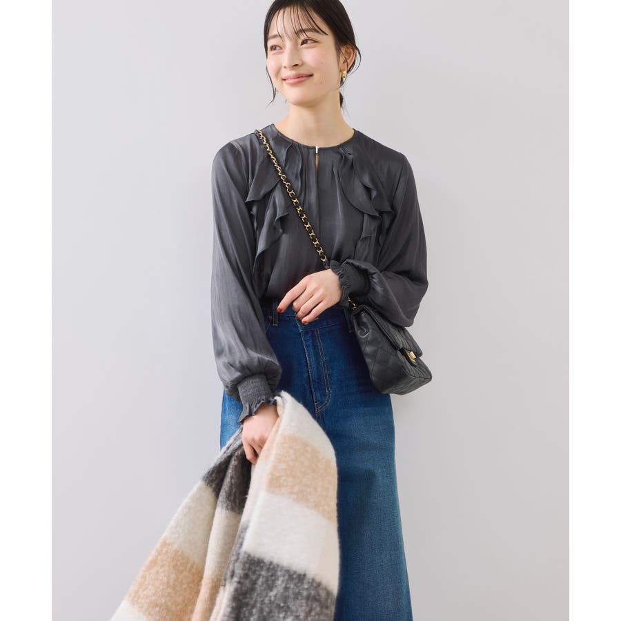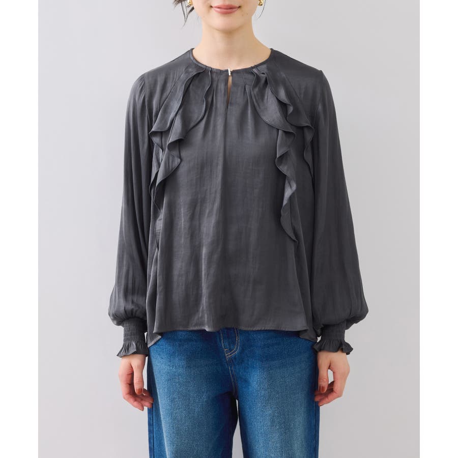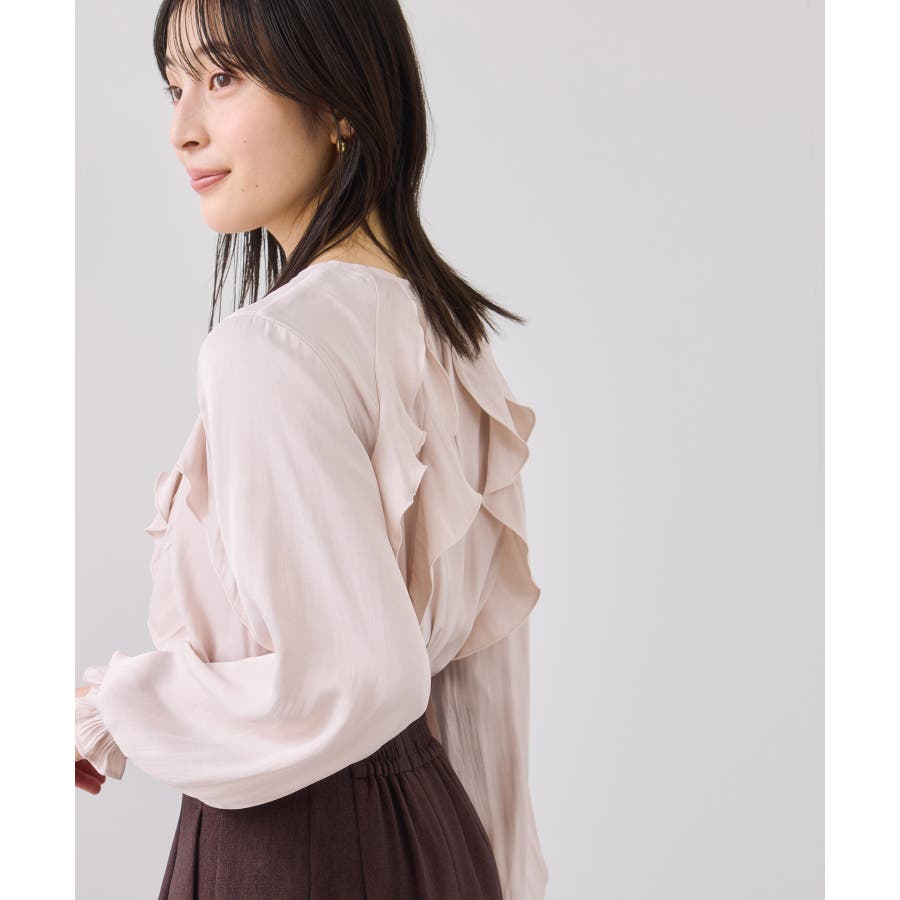 程よい光沢と前後のフリルで、1枚でサマになるブラウスです。