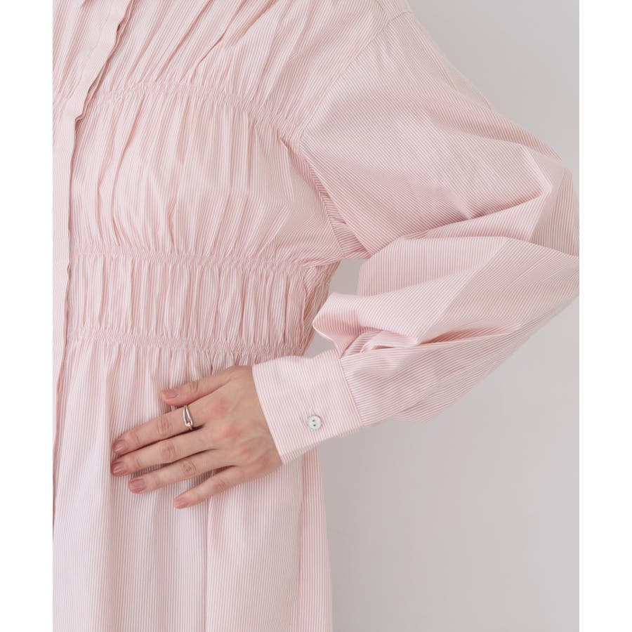 後見頃にもシャーリングデザインを施し、ウエストマークされて全体的に細見えするようにデザインされています。