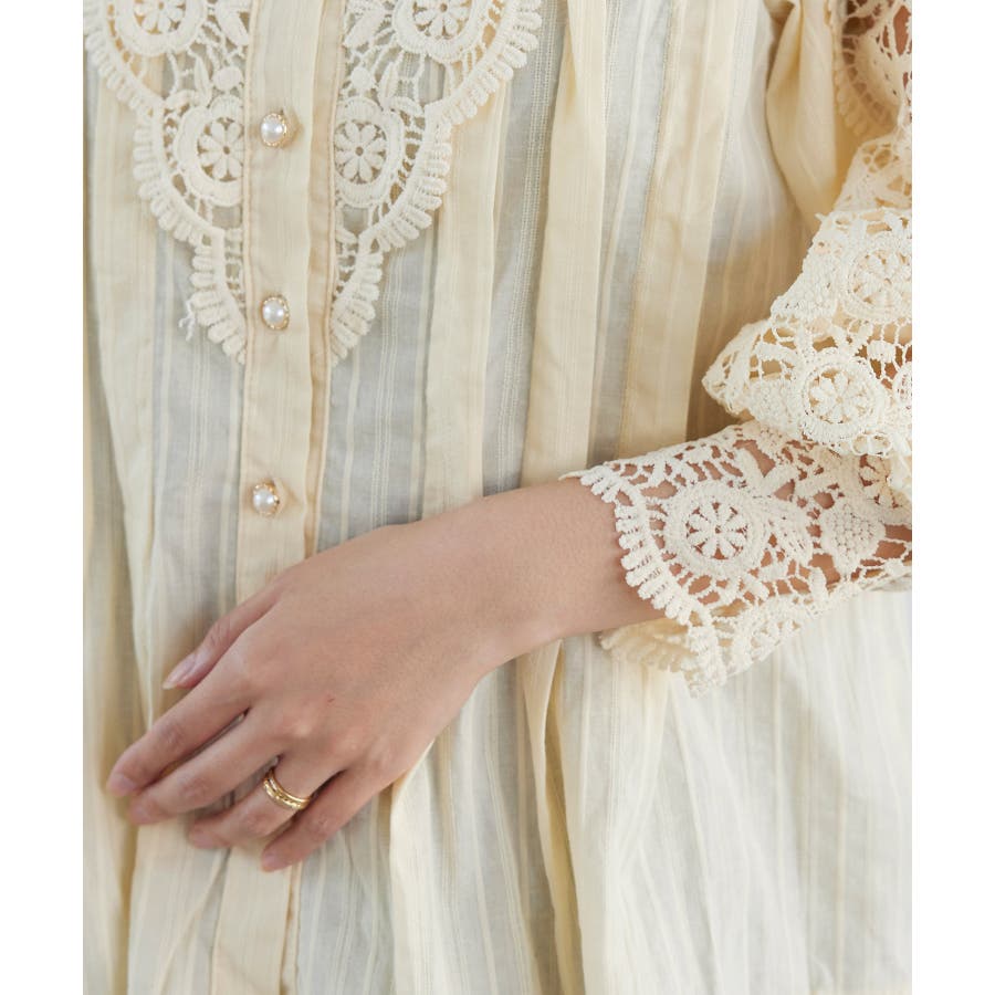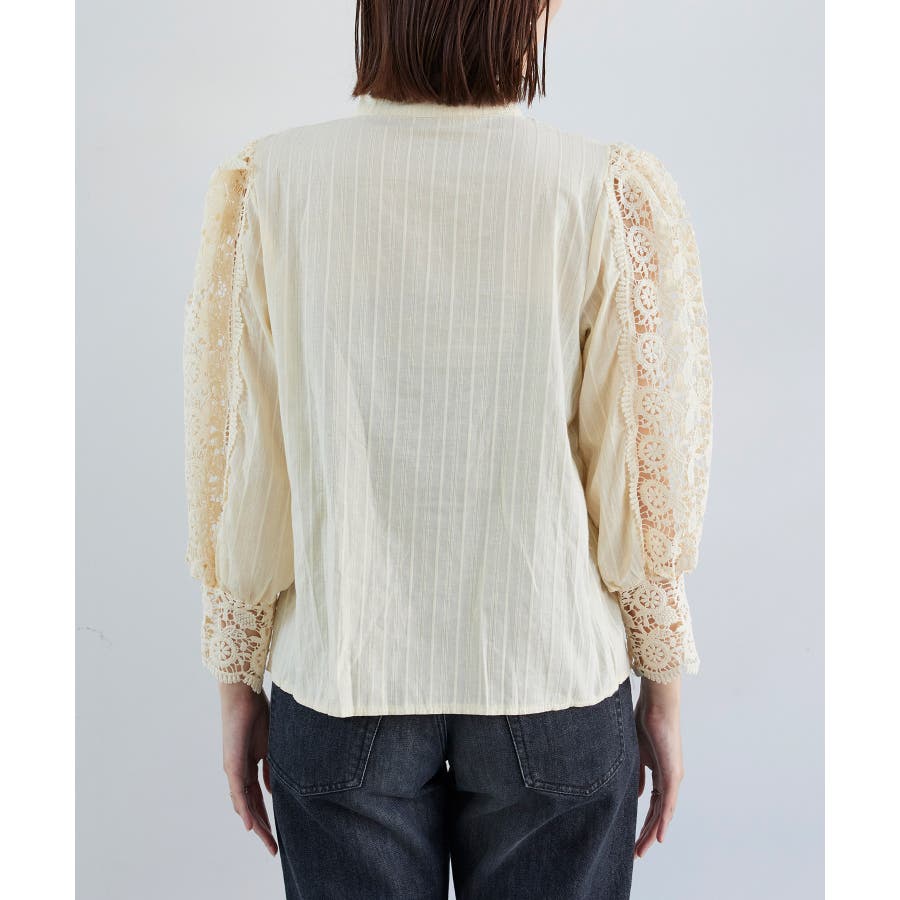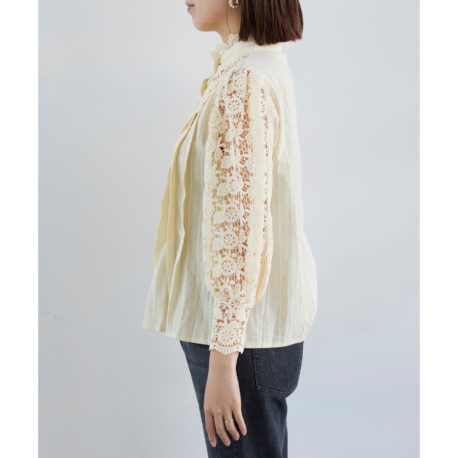 【デザイン・シルエット】 大胆なレース使いが大人可愛いブラウスです。 ・キラっとパール釦がアクセントで、華やかな印象に。 ・透け感のあるレースデザインは、お出かけやパーティーシーンにもおすすめ◎ ・身頃部分に細かなレースが付いているのもこだわりポイント。 【素材】 ロングシーズン使える、さらっとした綿100%素材。 【カラー】 華やかな印象のブラック・クリーンなホワイト・大人なクリームベージュの3色展開です。 【おすすめのスタイリング】 Iラインスカートやテーパードパンツに合わせてレディライクな着こなしが◎ デニムやワイドパンツに合わせてカジュアルダウンするのもおすすめです。 ----------------------------- 裏地:身頃あり(デコルテ部分はなし) 光沢感:なし 透け感:袖とデコルテ部分あり 伸縮性:なし 生地の厚さ:普通 季節:秋、冬、春 ----------------------------- 【モデル着用サイズ】 全色スタッフ身長:164cm、着用サイズ:F ※こちらはWEBサイト限定のお取り扱いとなります。実店舗では販売しておりません。 ※画像の商品はサンプルです。 実際の商品と仕様、加工、サイズが若干異なる場合がございます。