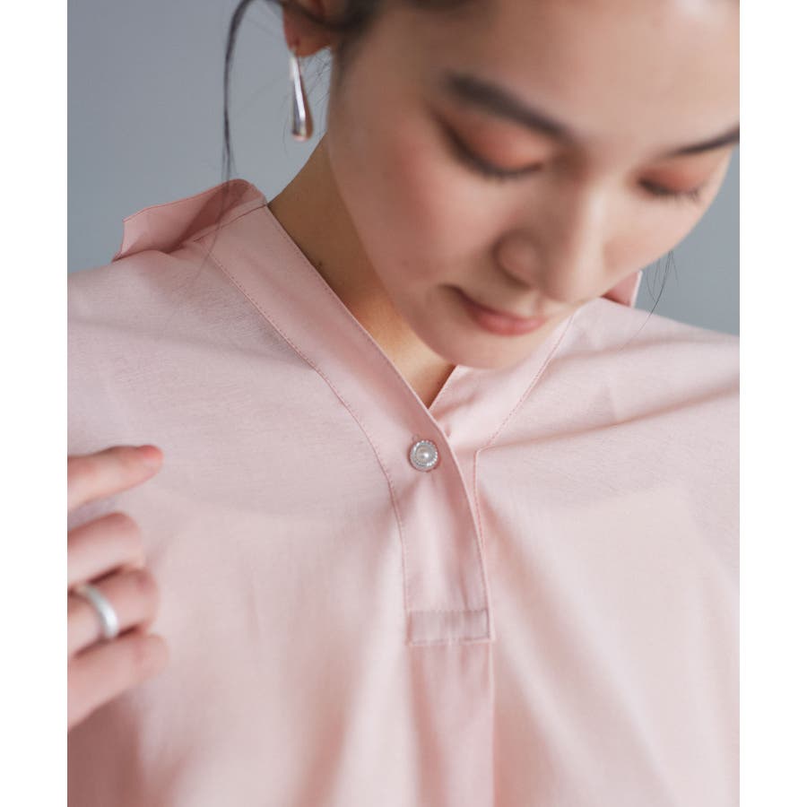 パールボタンを閉めてボタンをポイントにして着るのはもちろん、しっかり締めてブラウスとしてのスタイリングもおすすめです。