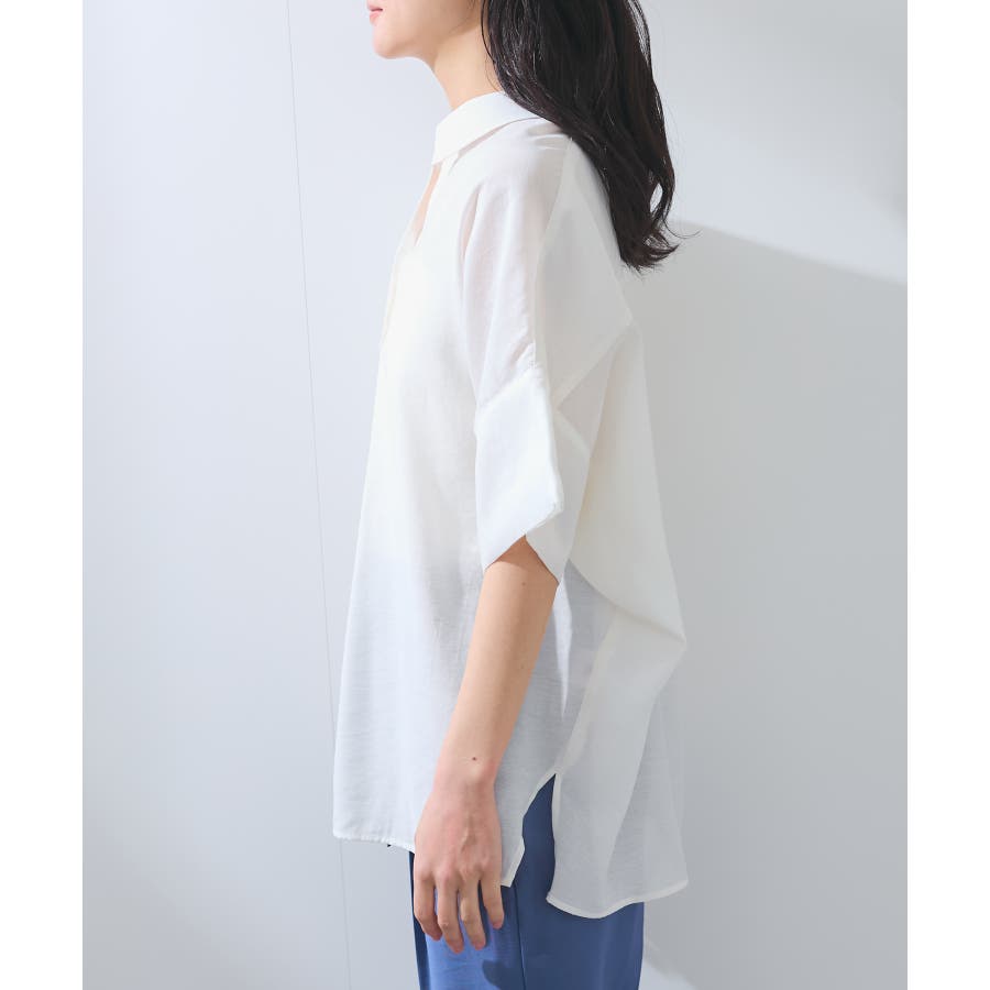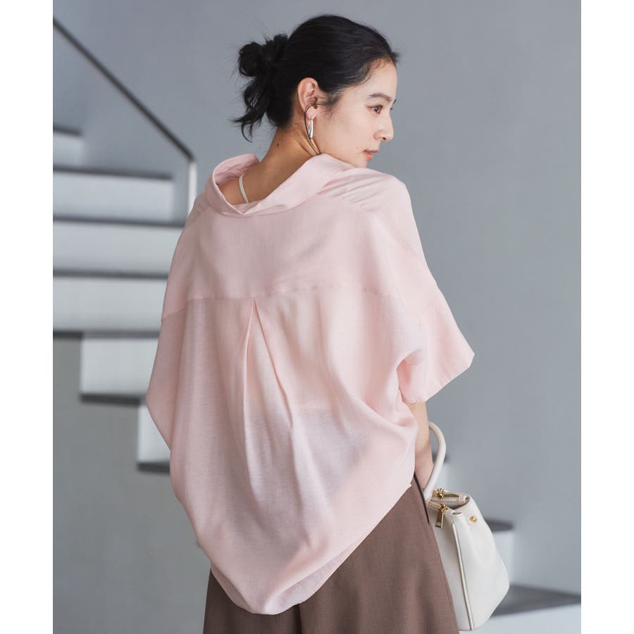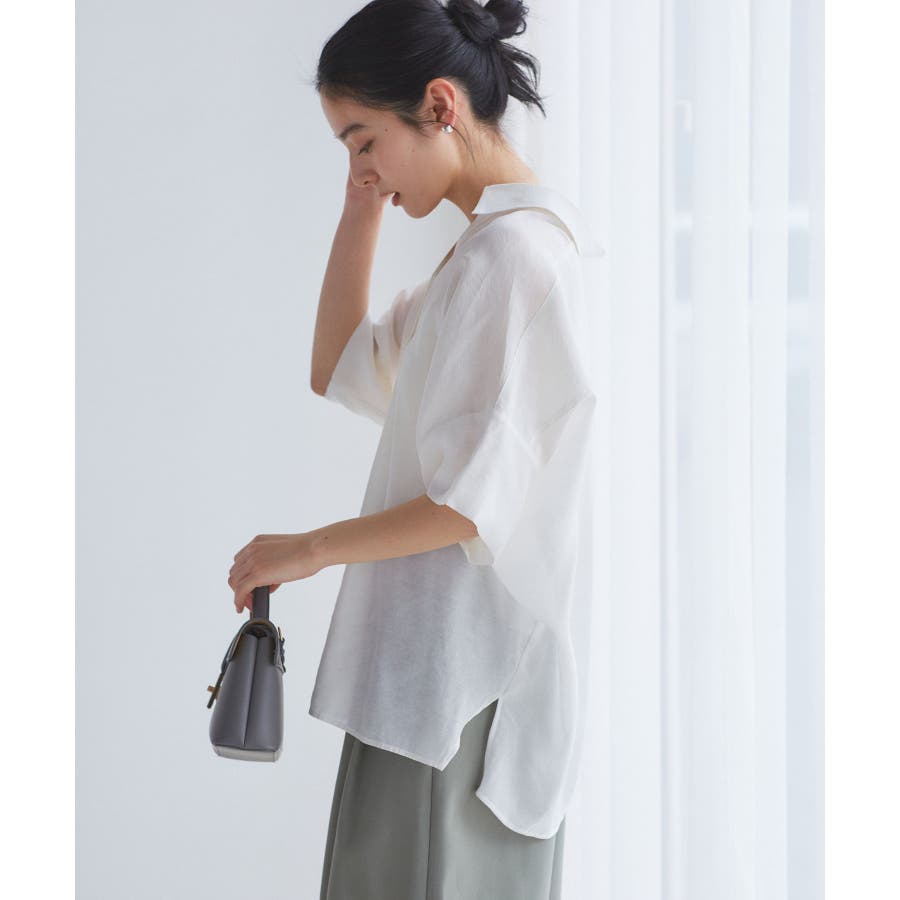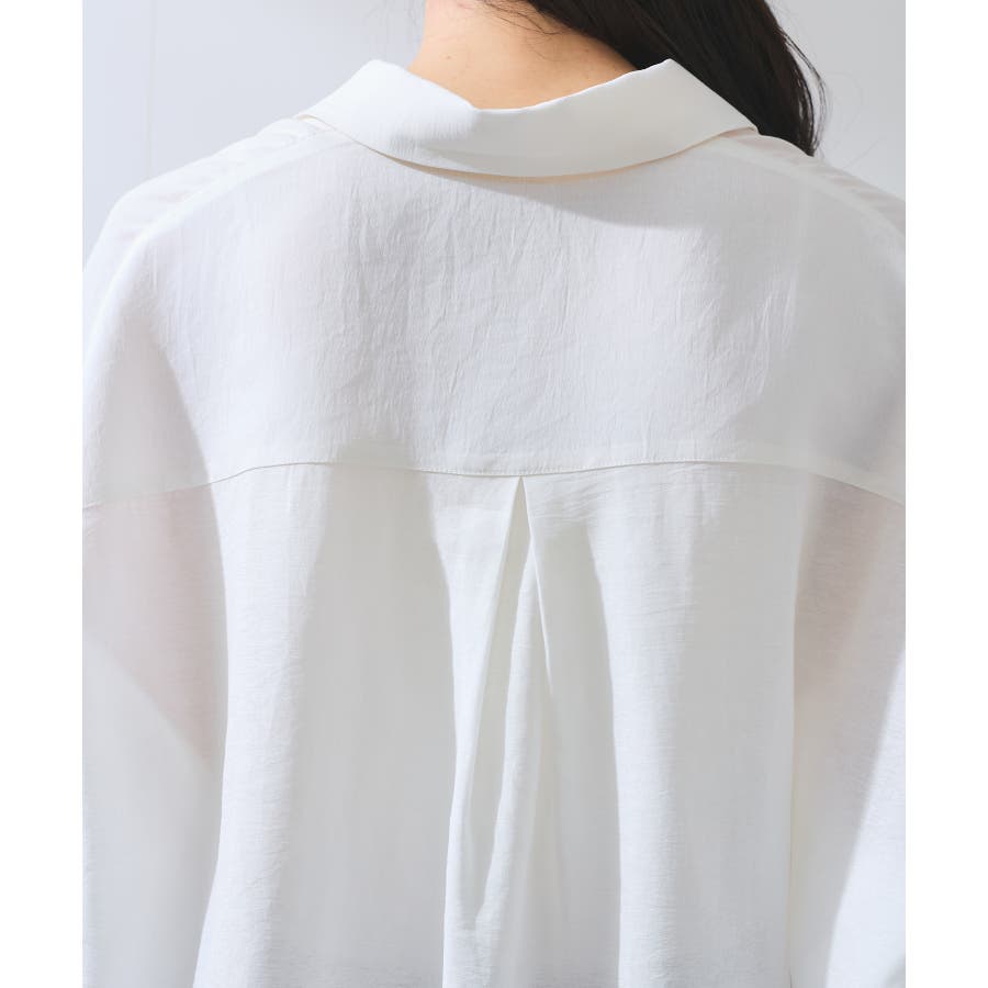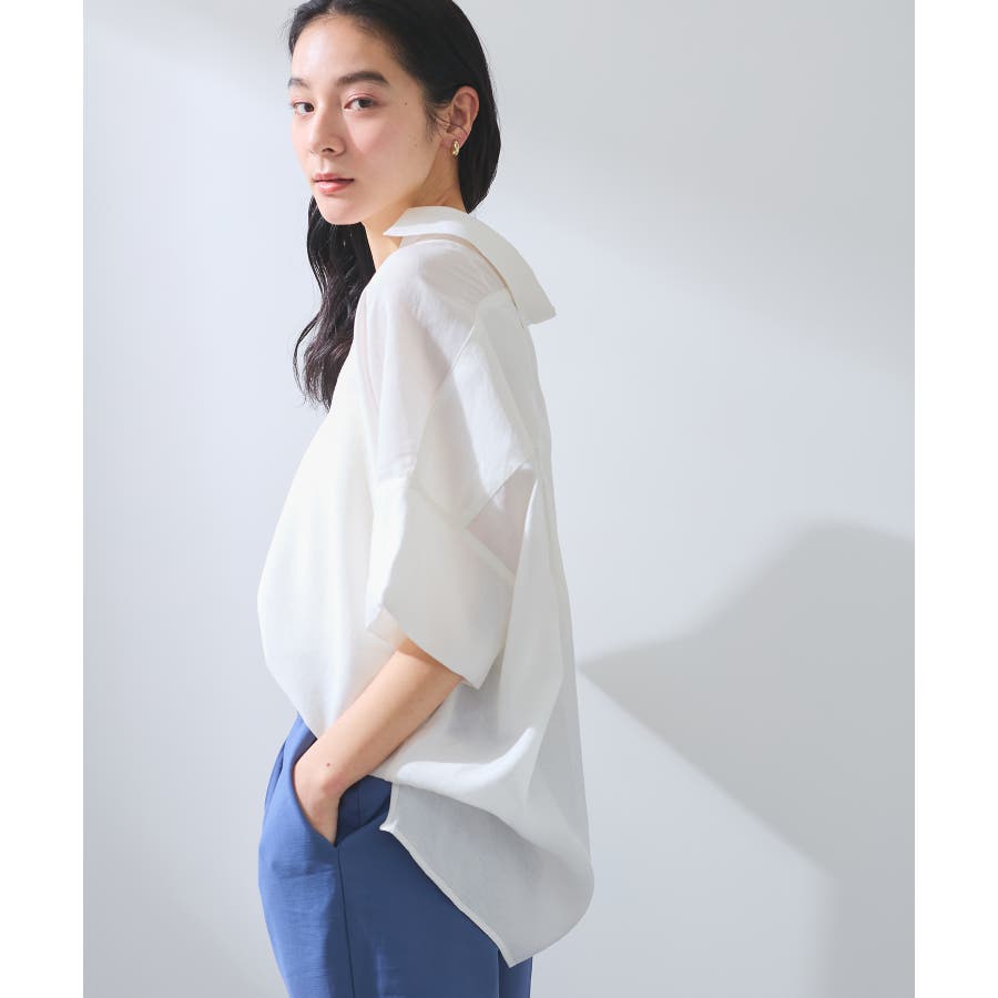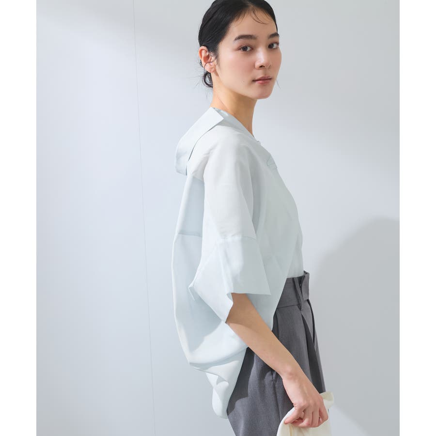 ・女性らしく落ち感のあるシルエットで、程よい透け感のある上品な光沢のある素材で仕上げた涼しげなシャツ