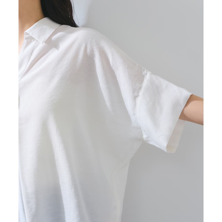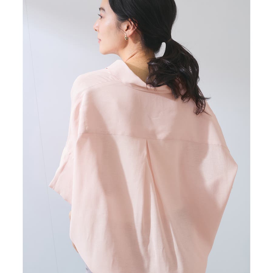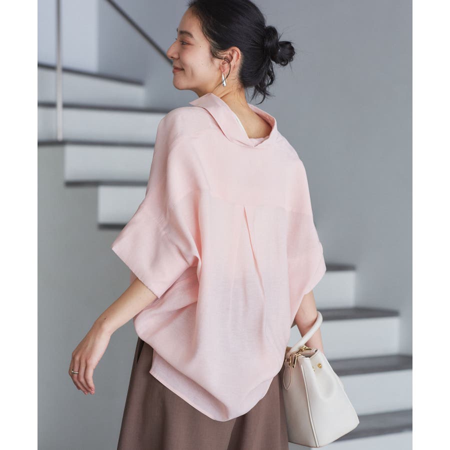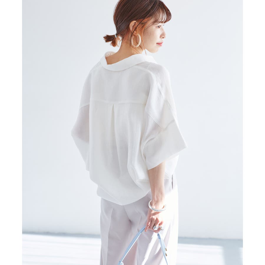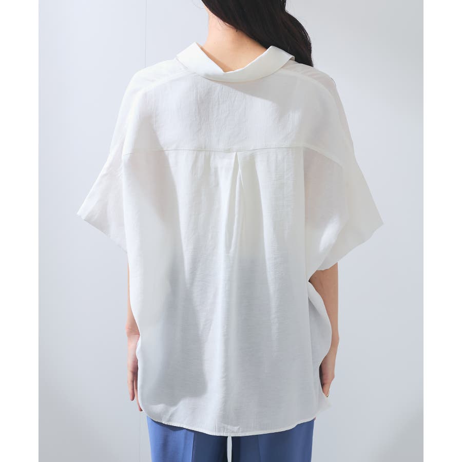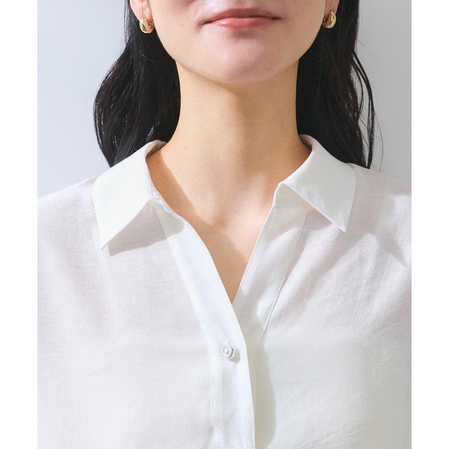 ・女性らしく落ち感のあるシルエットで、程よい透け感のある上品な光沢のある素材で仕上げた涼しげなシャツ