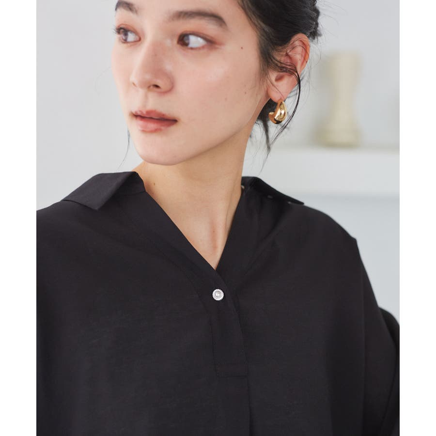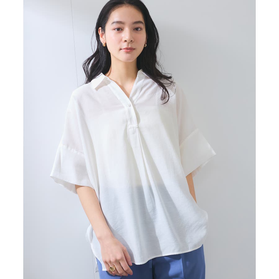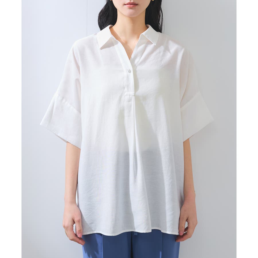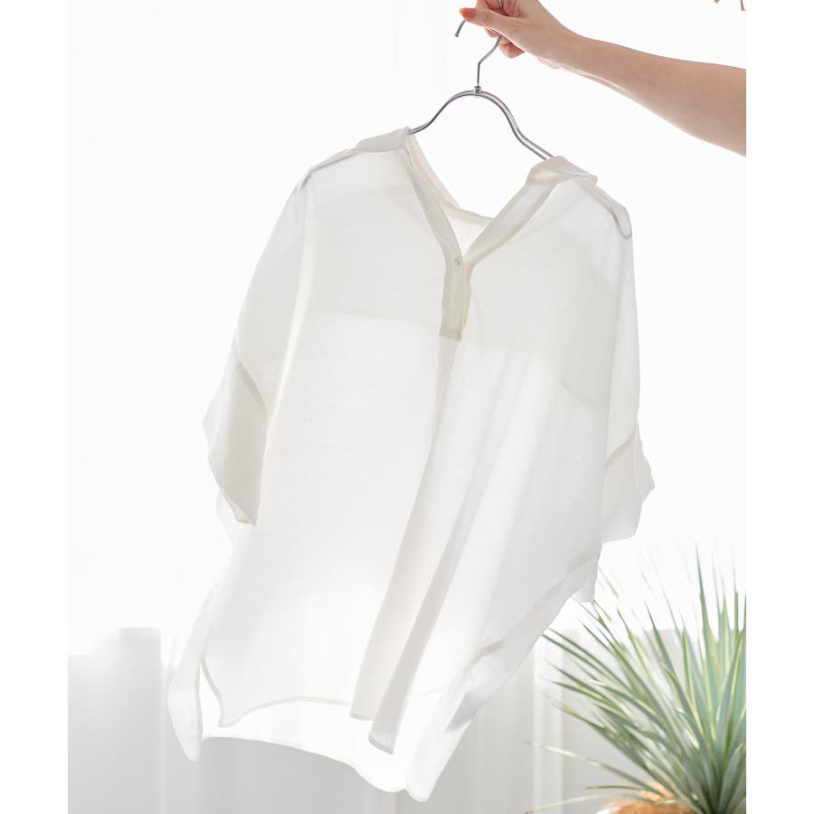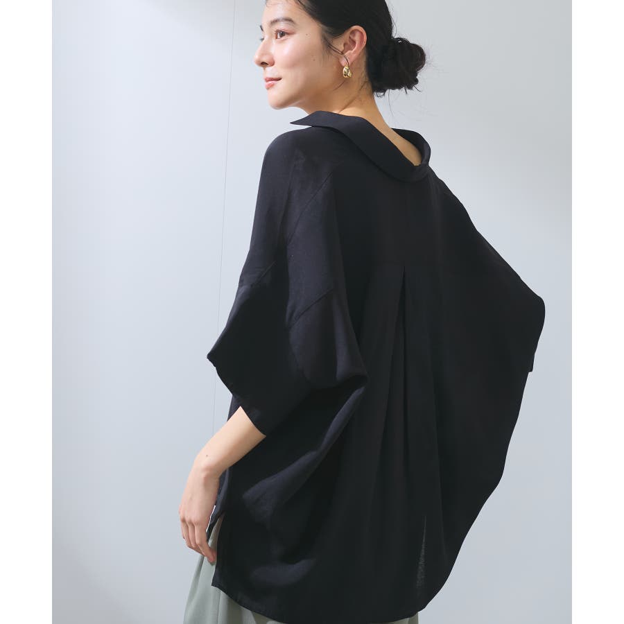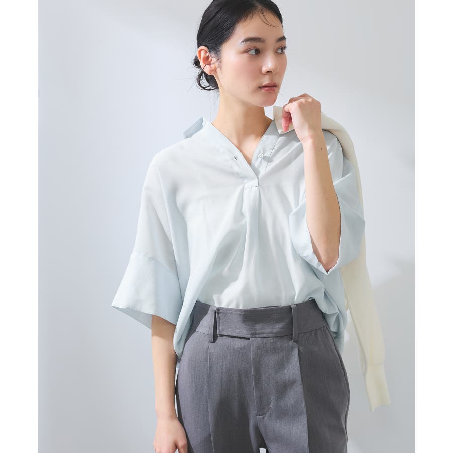 ・女性らしく落ち感のあるシルエットで、程よい透け感のある上品な光沢のある素材で仕上げた涼しげなシャツ