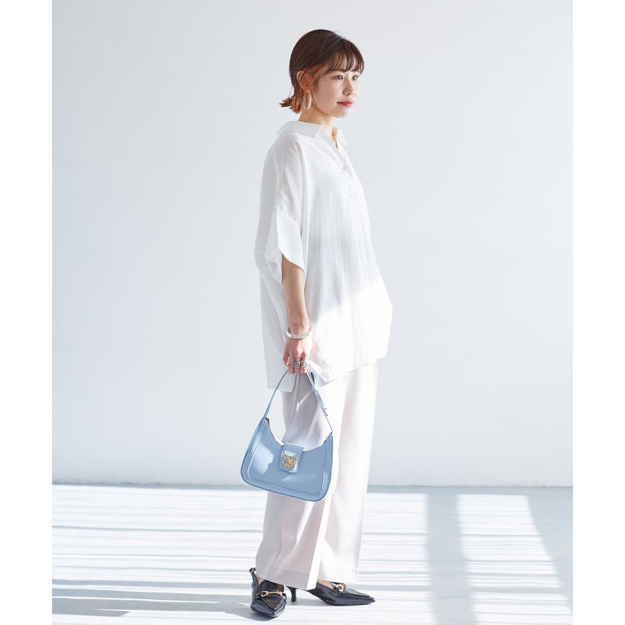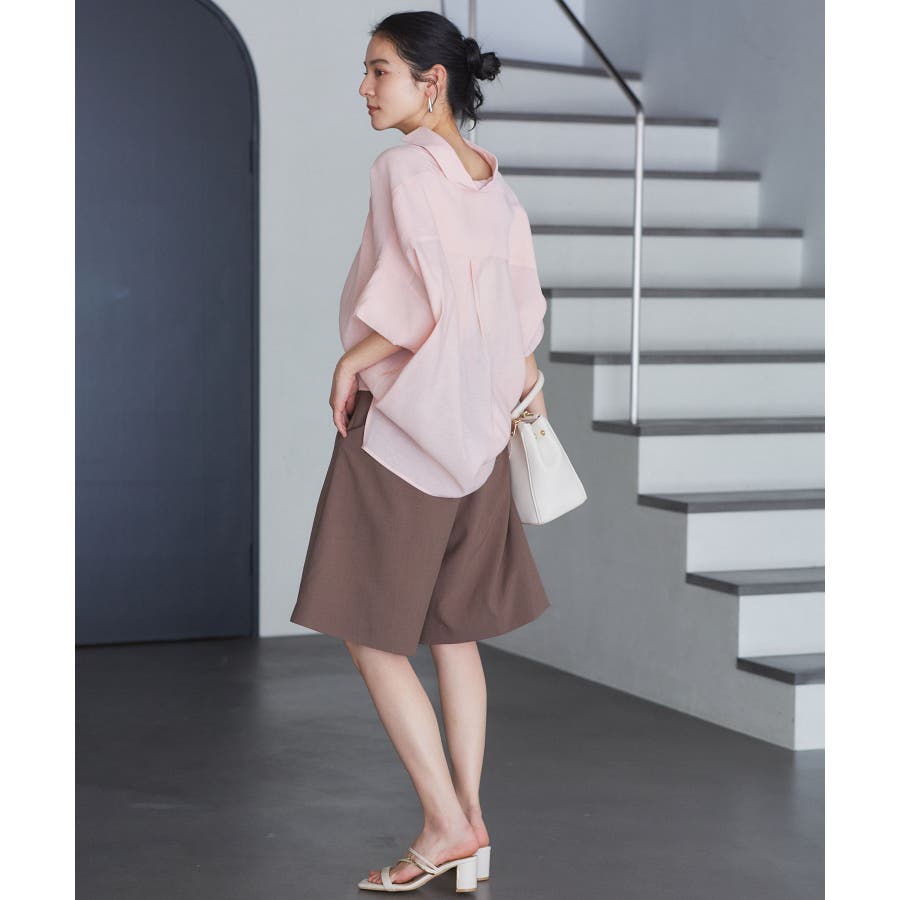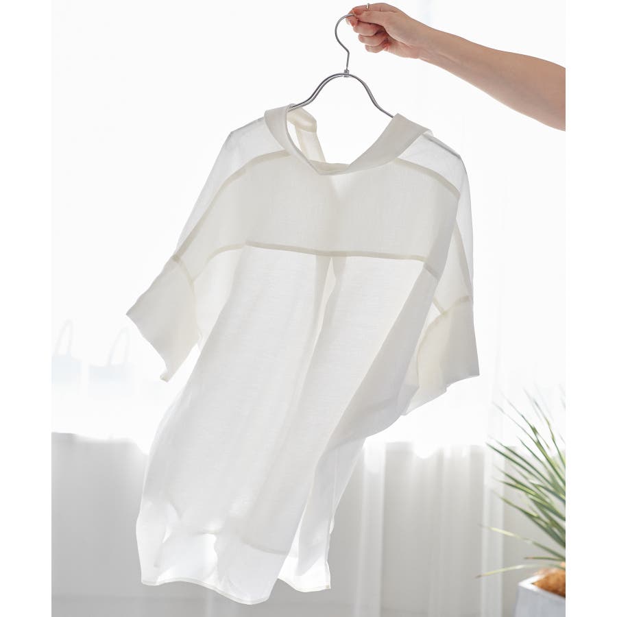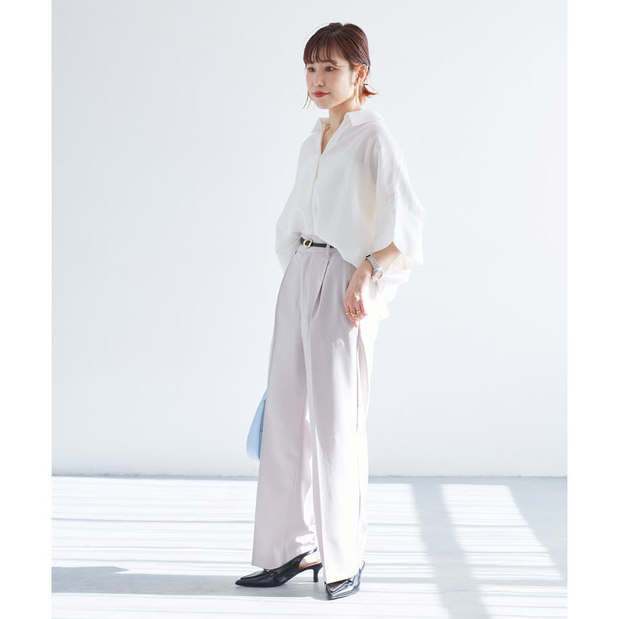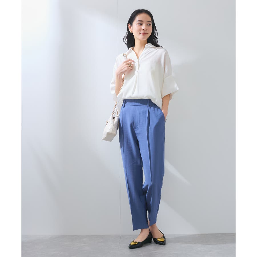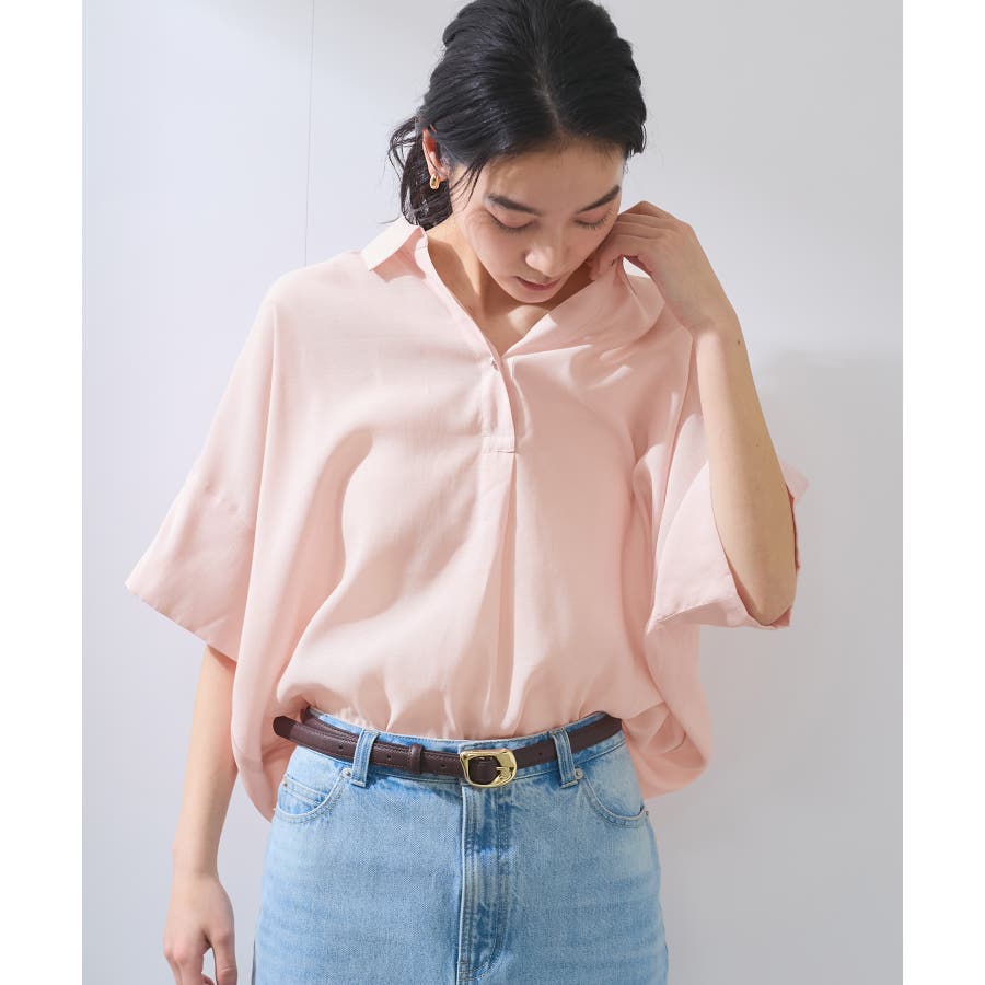 ・女性らしく落ち感のあるシルエットで、程よい透け感のある上品な光沢のある素材で仕上げた涼しげなシャツ