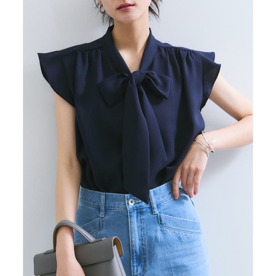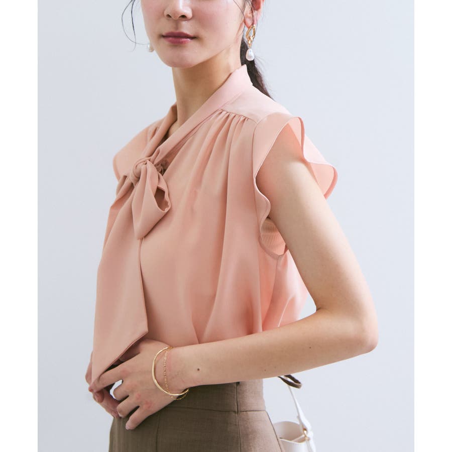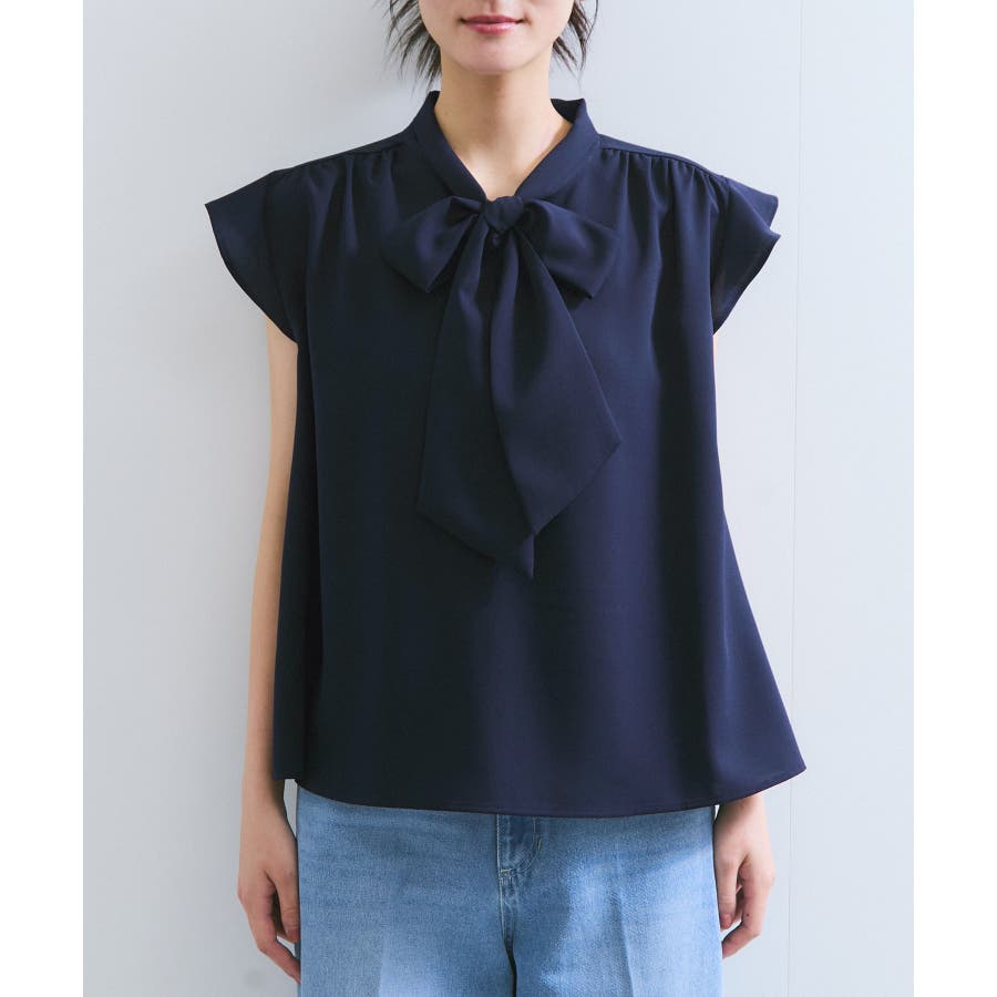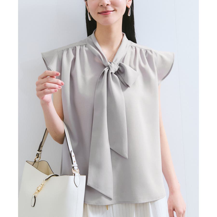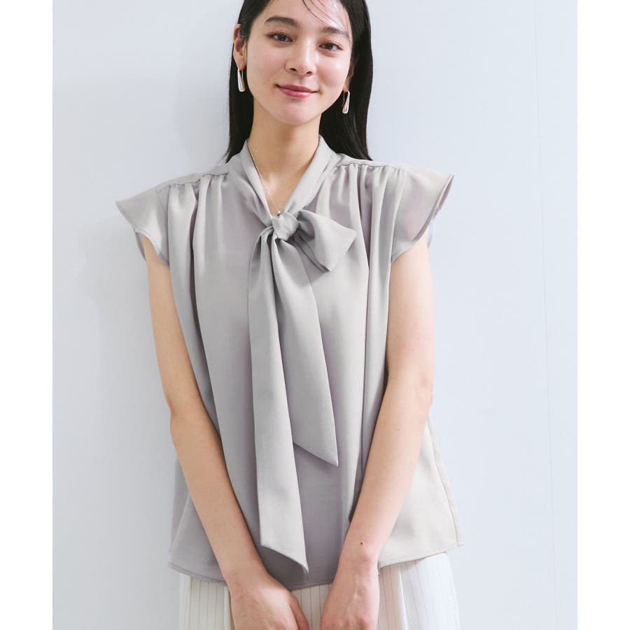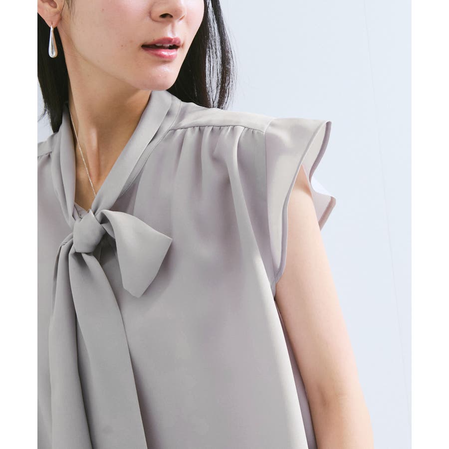 首元のボウタイが顔まわりを華やかに見せてくれる、大人のためのノースリーブブラウス。