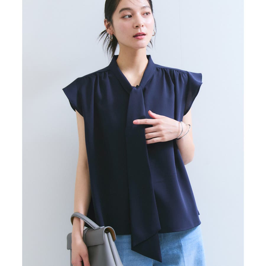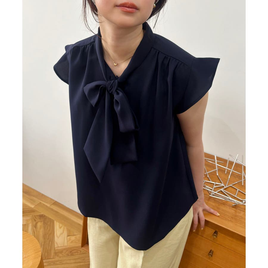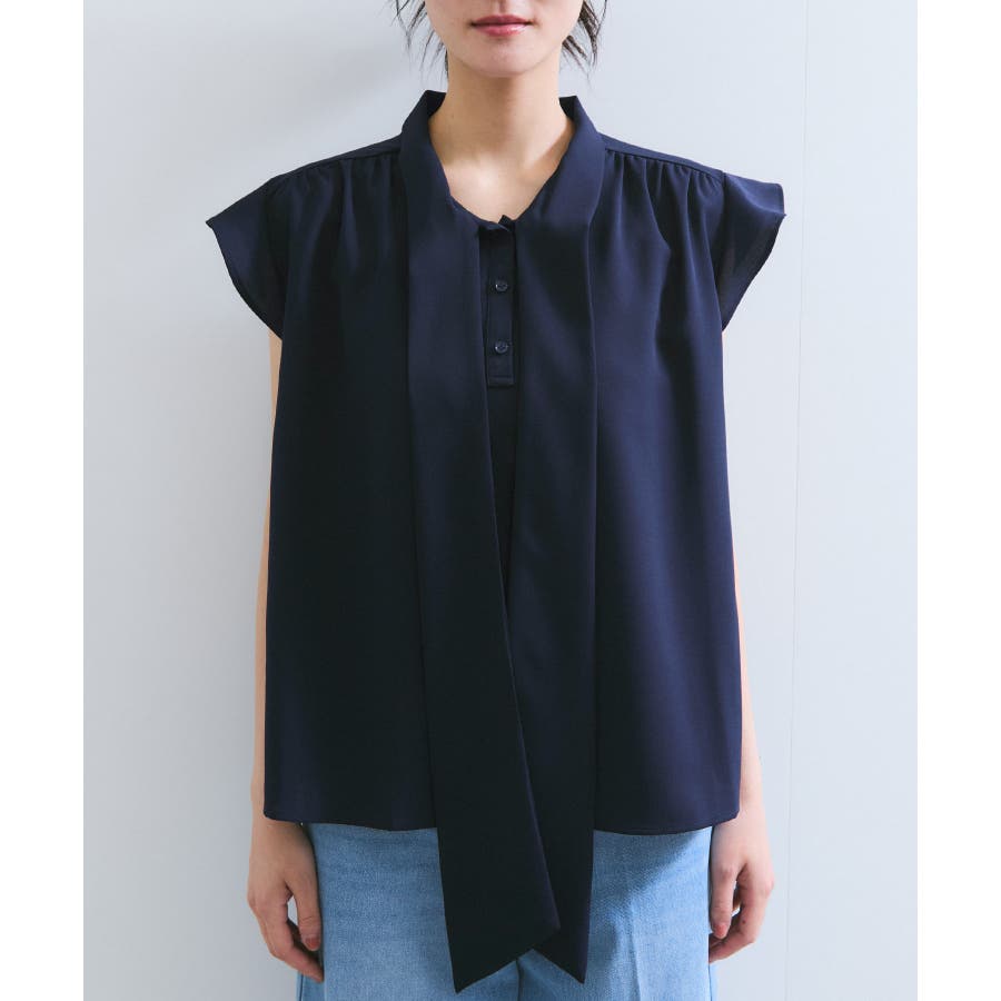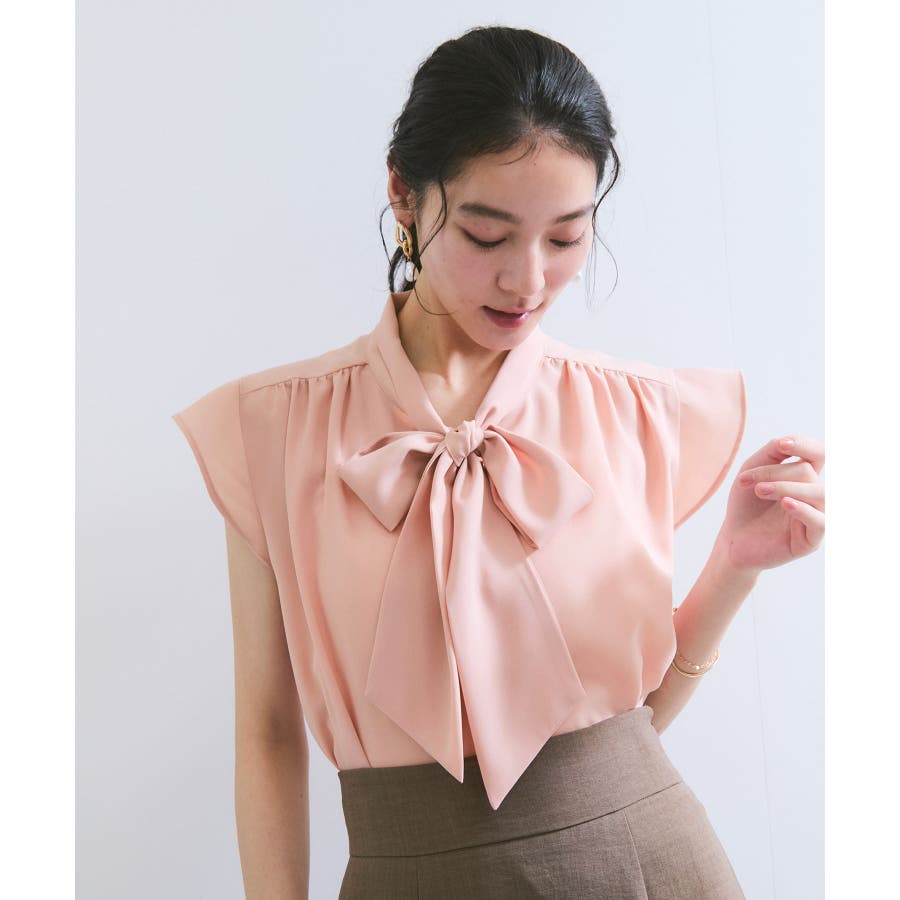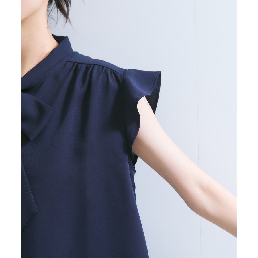 首元のボウタイが顔まわりを華やかに見せてくれる、大人のためのノースリーブブラウス。