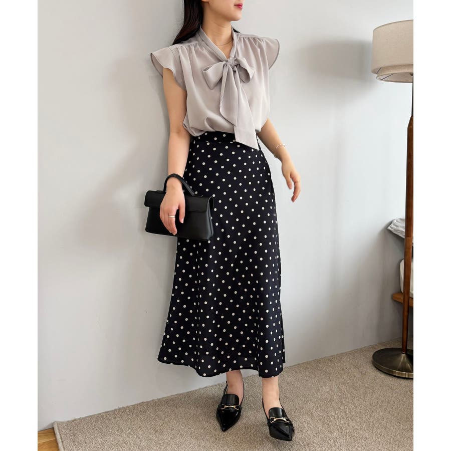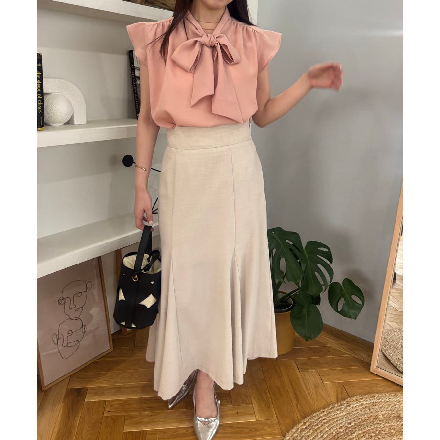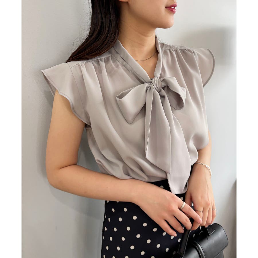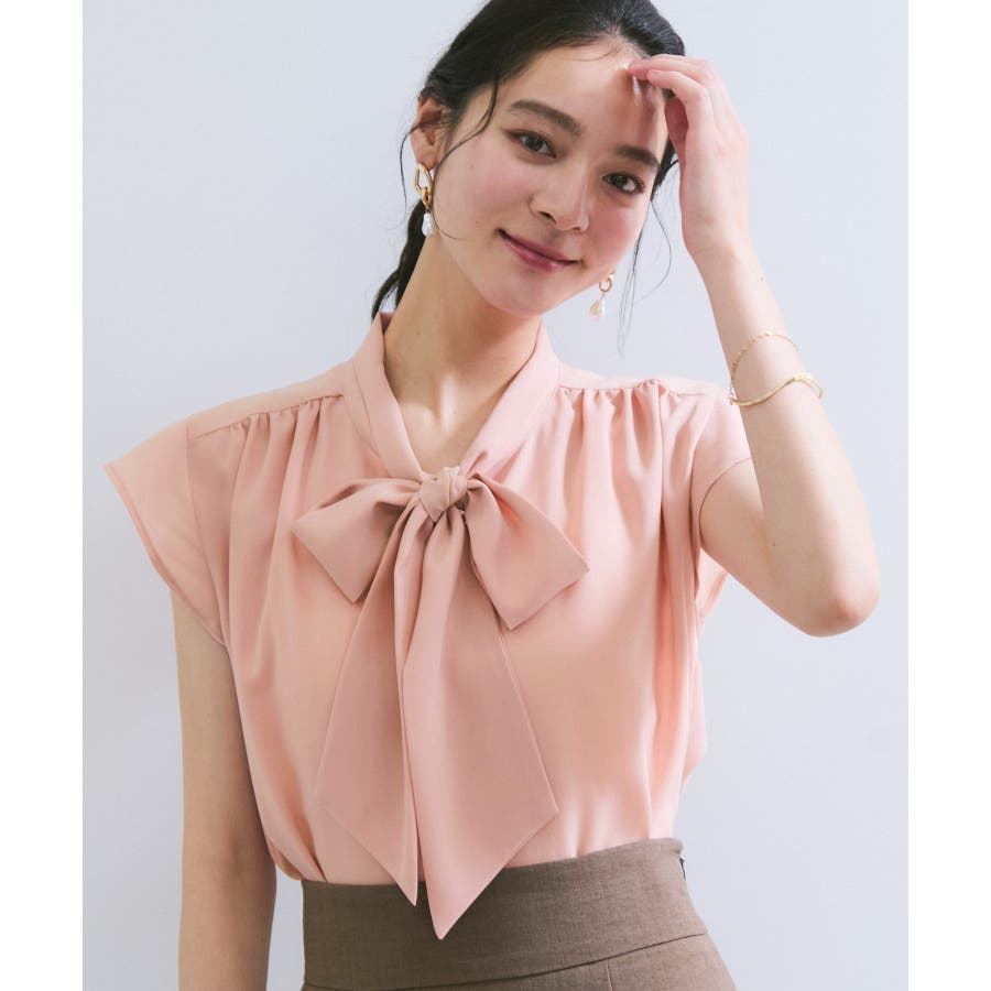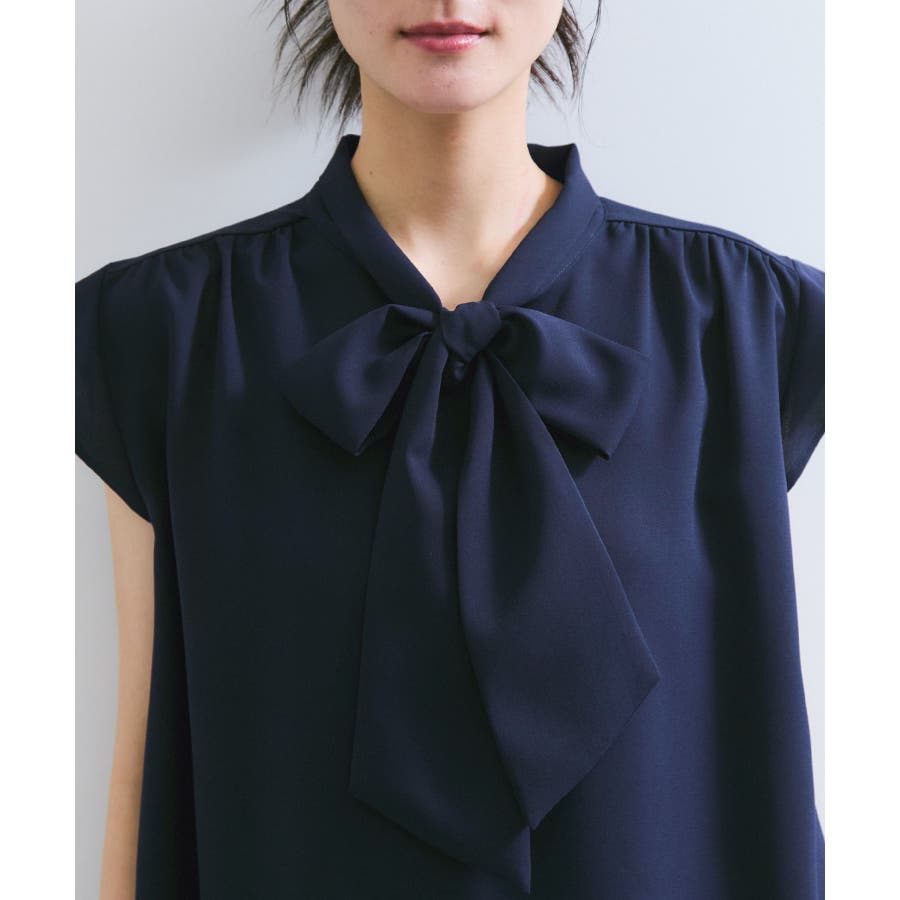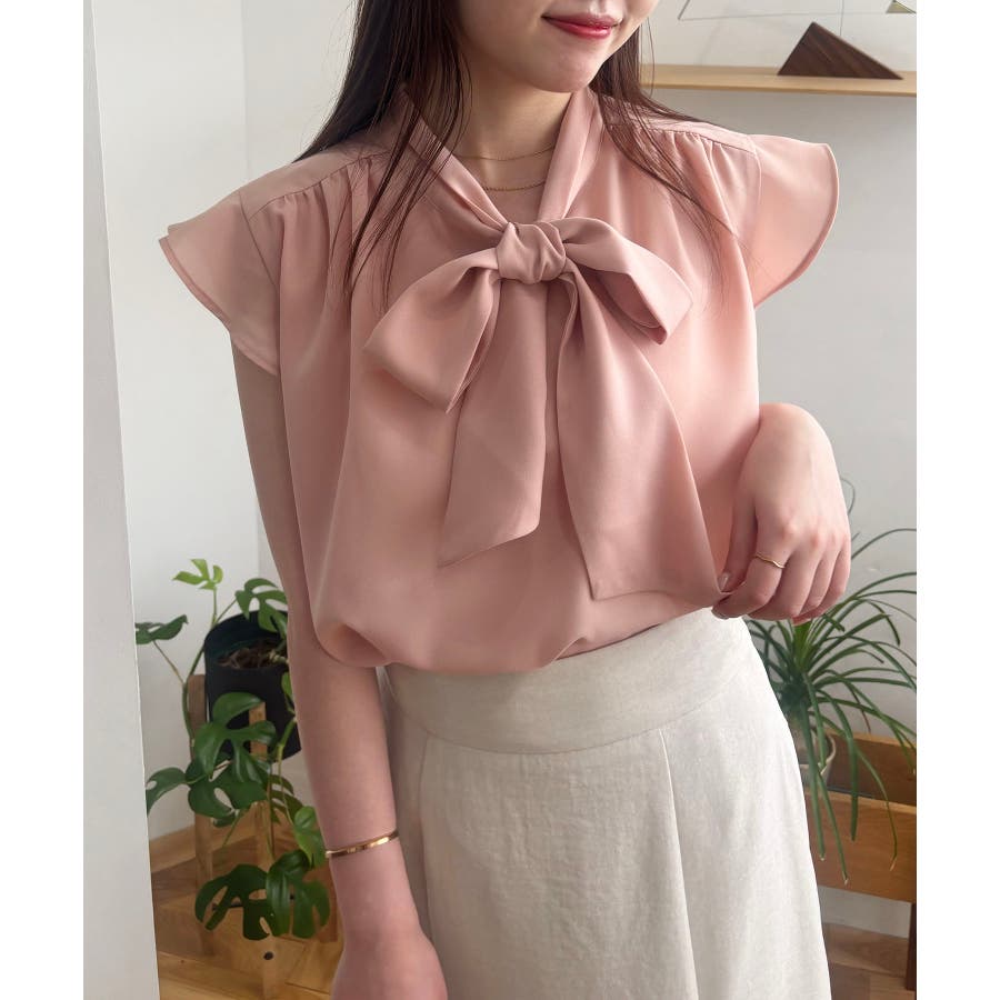 首元のボウタイが顔まわりを華やかに見せてくれる、大人のためのノースリーブブラウス。