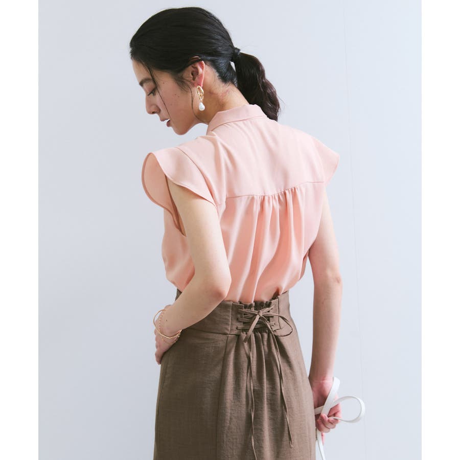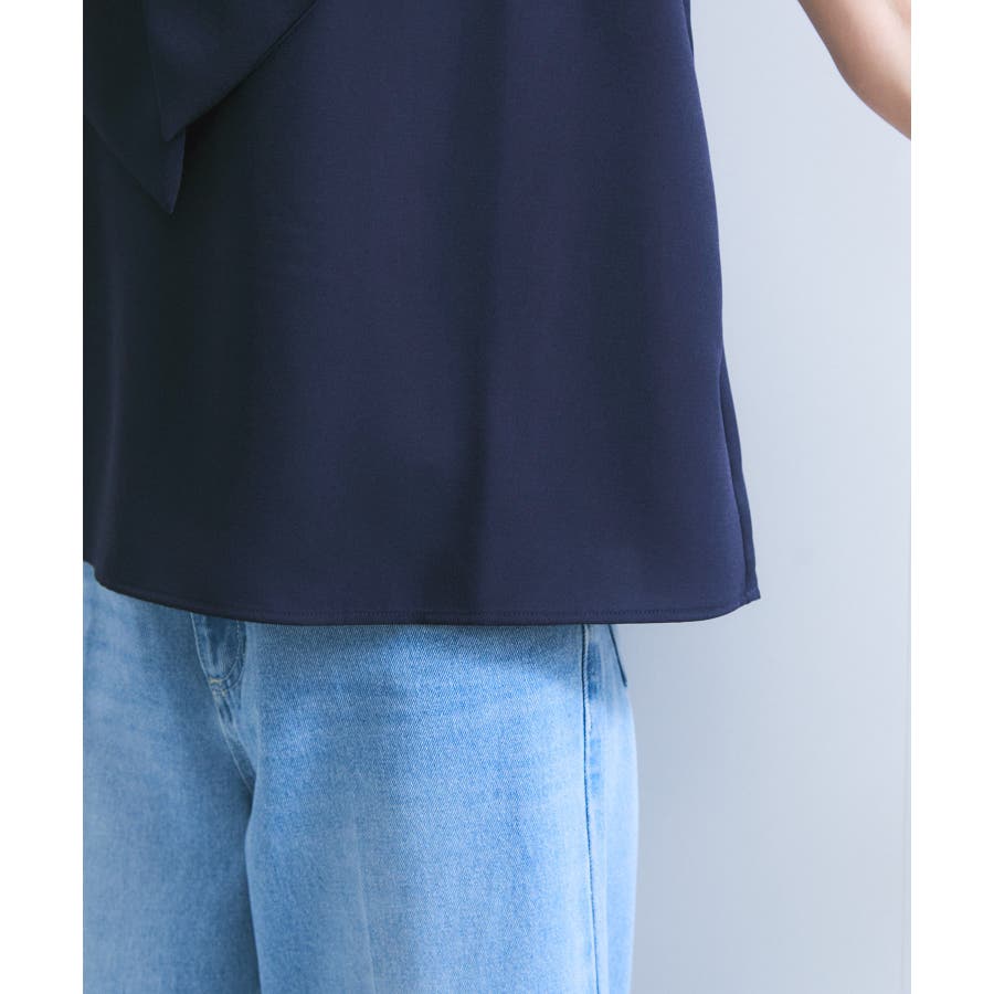 肩先まで自然にかかるフリル見えのスリーブデザインが、さりげなく二の腕をカバーしながら、女性らしいやわらかさを演出します。フロントには繊細なギャザーを施し、立体感をプラス。身頃は程よく身体から離れるストレートシルエットで、タックインしてももたつかず、アウトで着てもバランス良く決まる絶妙な丈感に仕上げました。