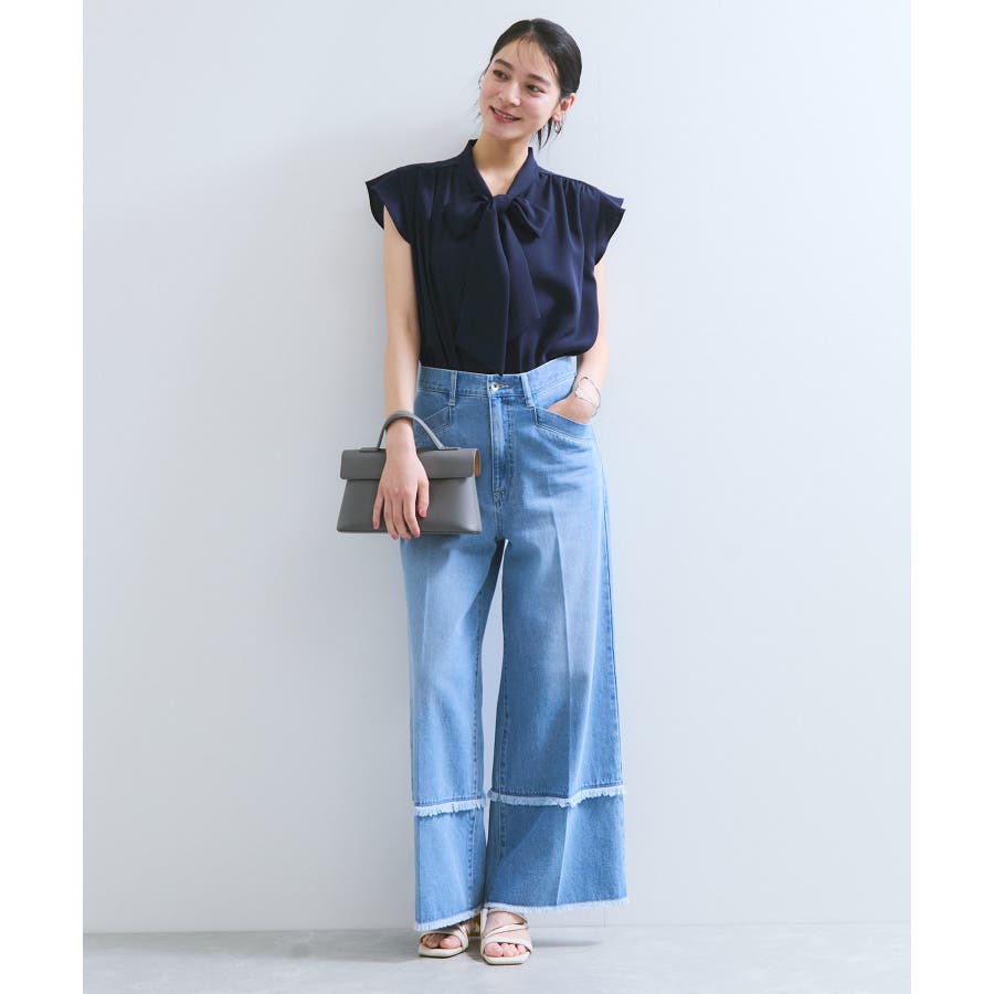 オフの日は、デニムやワイドパンツでカジュアルダウンしても◎。インでもアウトでも着映えするデザインのため、ウエストインでスタイルアップ見せ、アウトでリラックス感を演出など気分に合わせたアレンジが可能です。