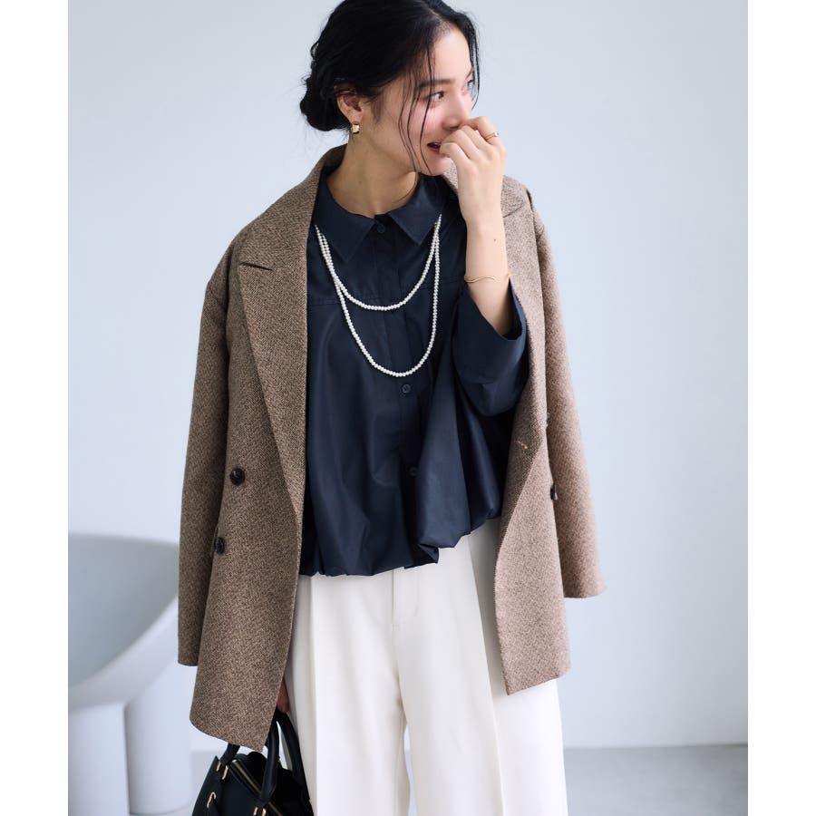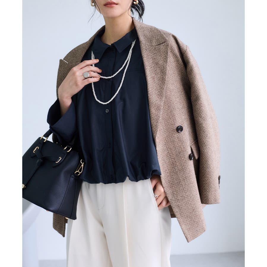 ワイドスリーブを取り入れることで、自然な抜け感と動きのあるシルエットに仕上げています。裾のペプラムは腰まわりをすっきり見せ、コンパクトな肩回りとのコントラストでメリハリを演出。