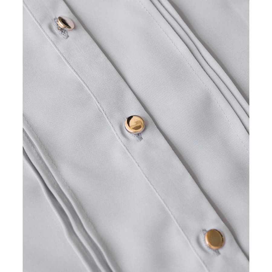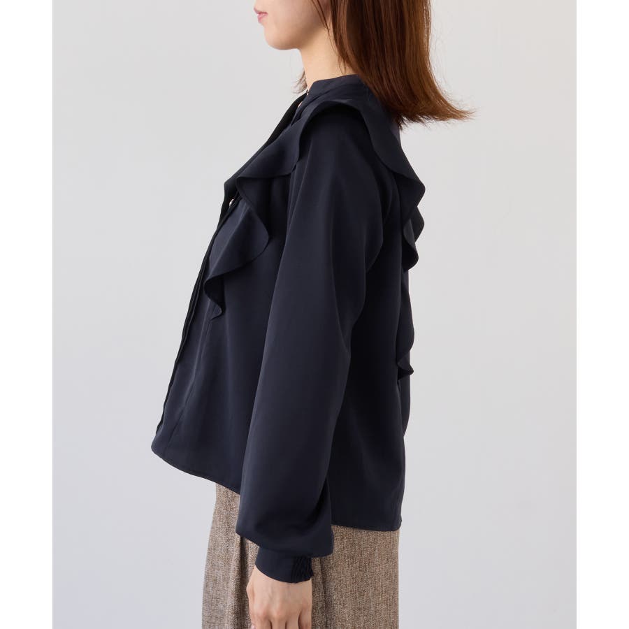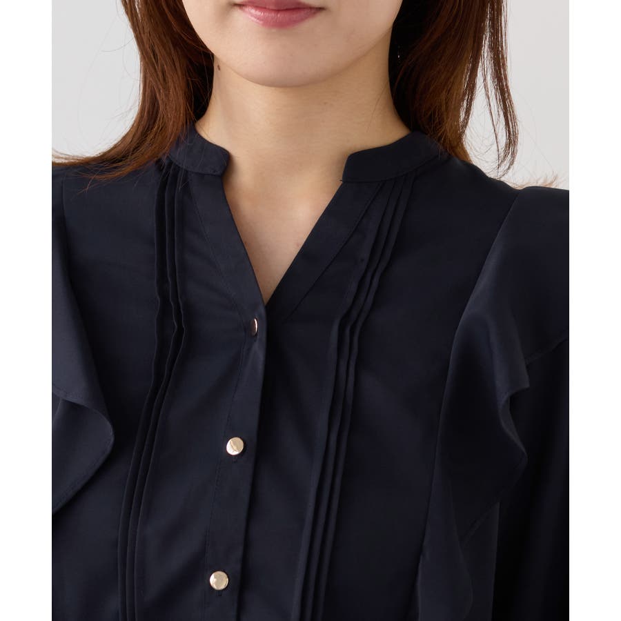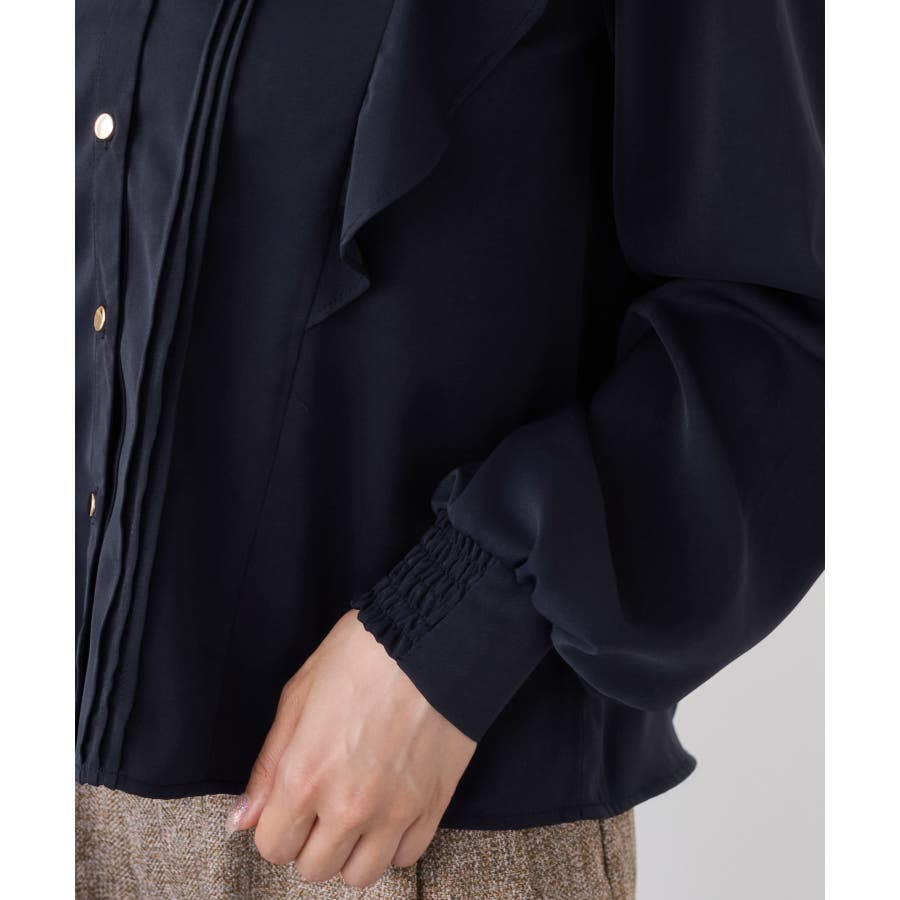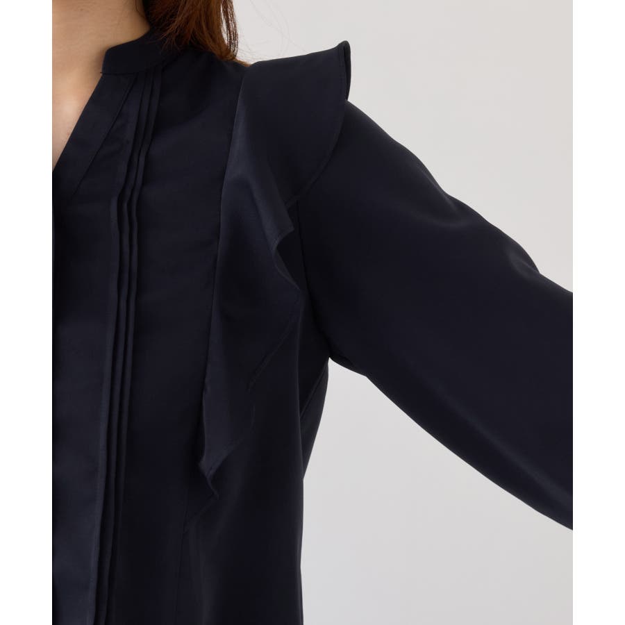 縦ラインを強調するピンタックとサイドフリル切替で、フェミニンさとスタイルアップを両立。程よい高さのスタンドカラーが首元を美しく見せ、前立ての金ボタンがきちんと感と華やかさをプラスします。袖口はゴム仕様で、袖をたくし上げても落ちにくく、表情のある着こなしが叶います。