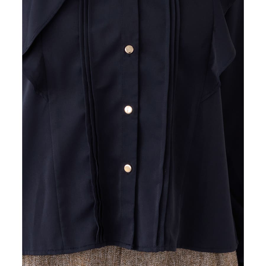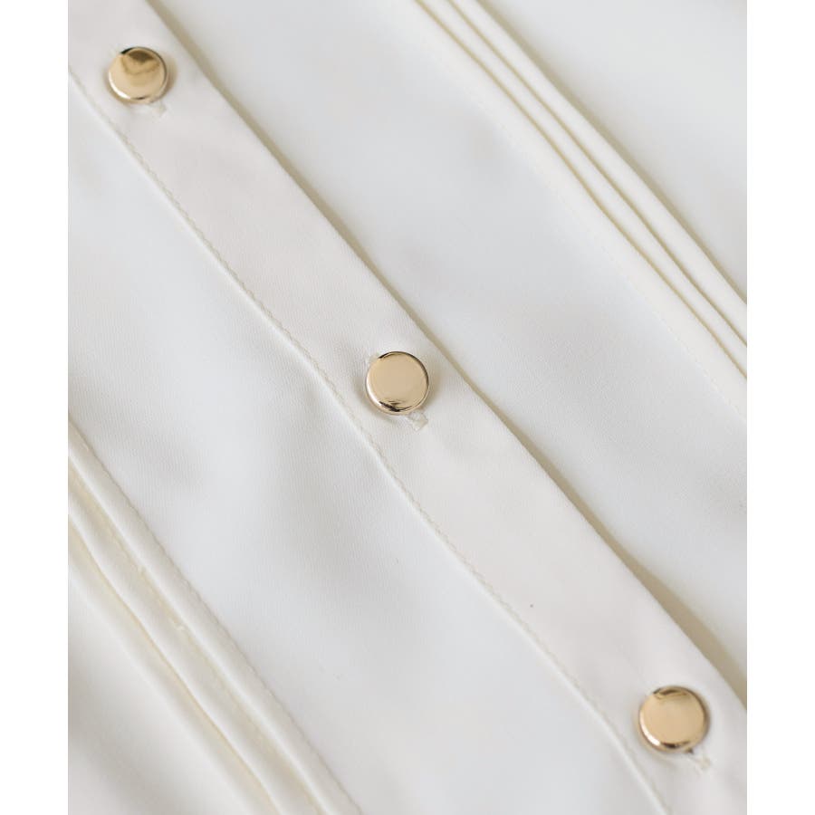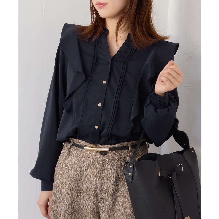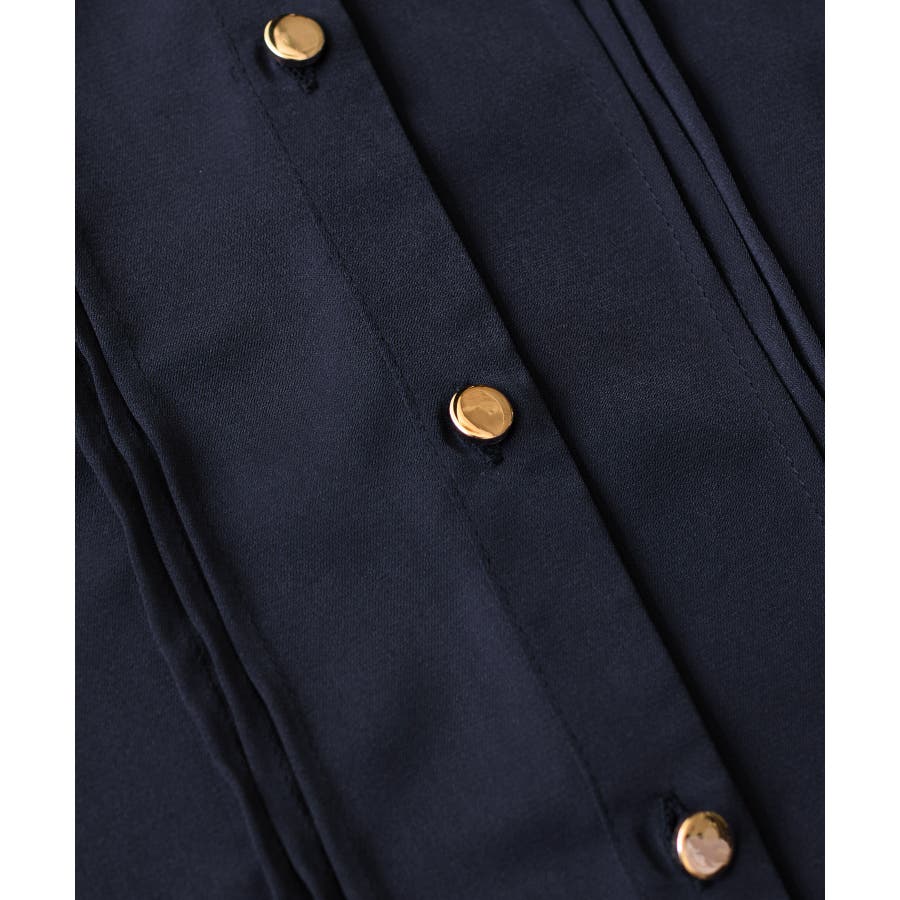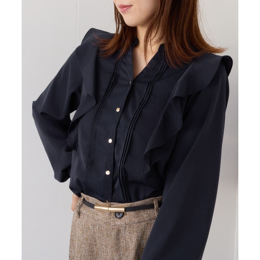 縦ラインを強調するピンタックとサイドフリル切替で、フェミニンさとスタイルアップを両立。程よい高さのスタンドカラーが首元を美しく見せ、前立ての金ボタンがきちんと感と華やかさをプラスします。袖口はゴム仕様で、袖をたくし上げても落ちにくく、表情のある着こなしが叶います。