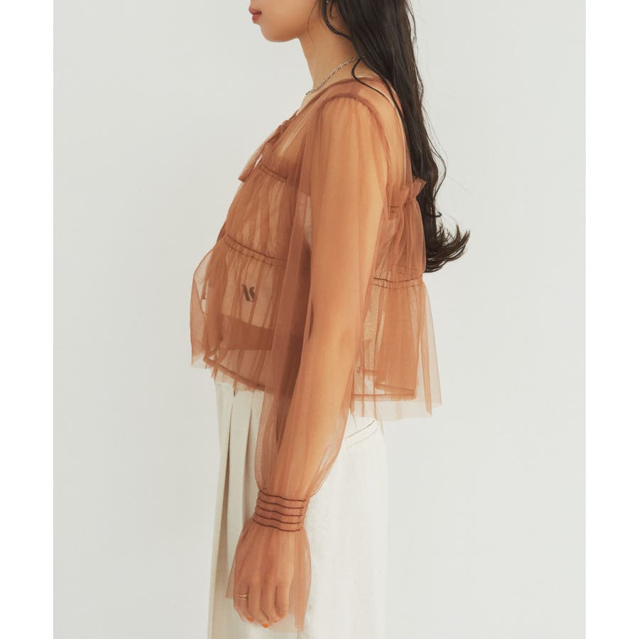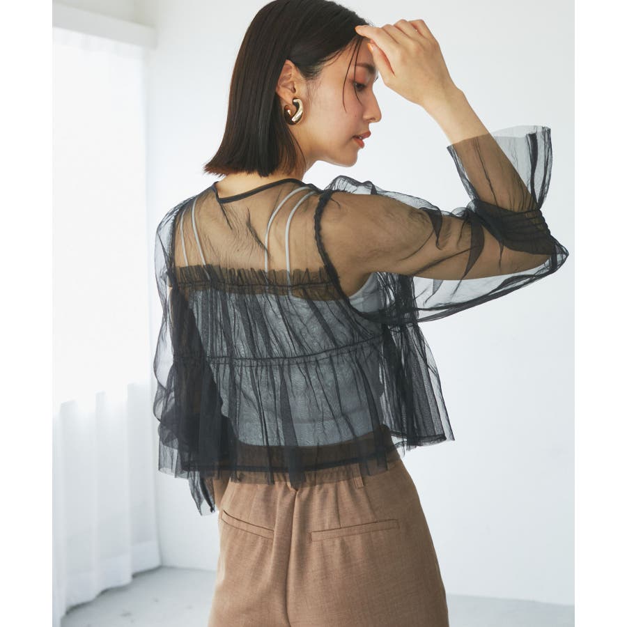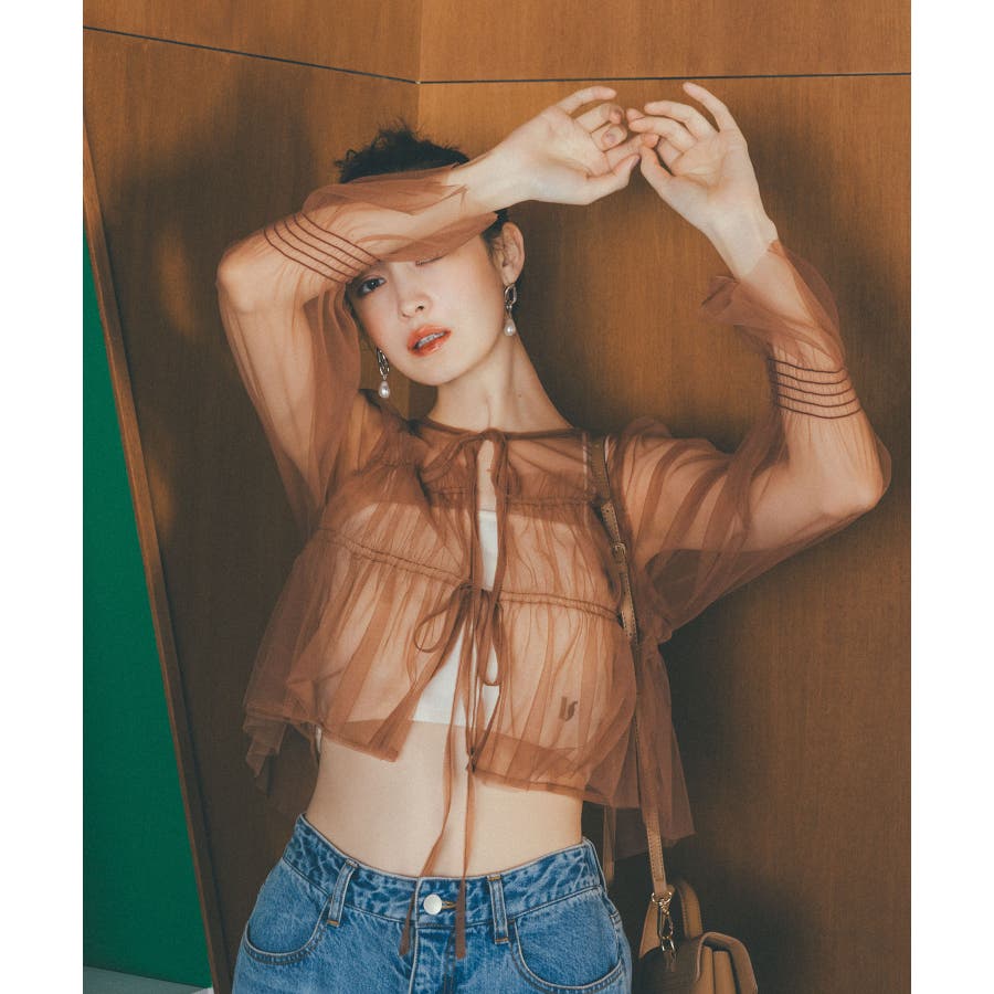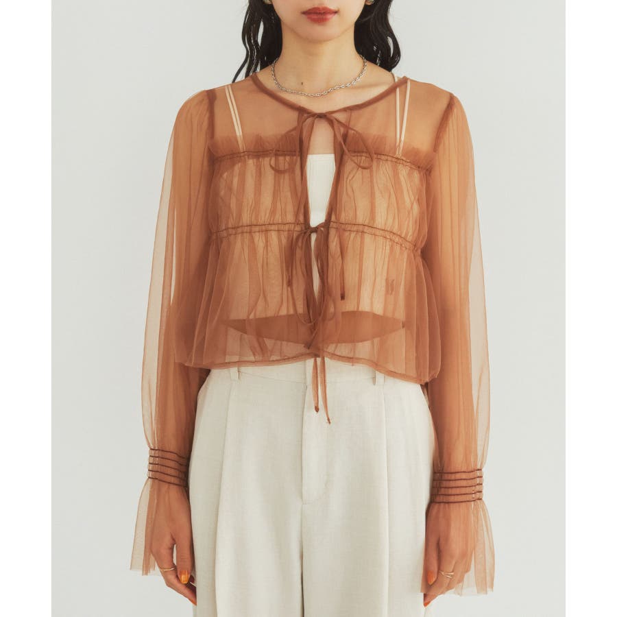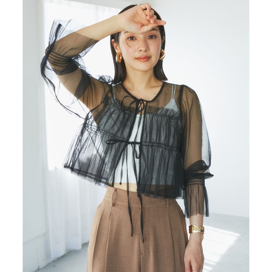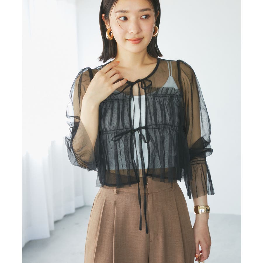 ◆2024春夏◆ 【デザイン・シルエット】 前開き部分は共地リボンがポイントになりコーデを華やかにするプラスワンアイテムです。 トレンドのチュール素材でティアードのボリュームがさらに今年らしく、ワンピースの羽織りやTシャツに合わせてレディな印象に。 袖口はシャーリングゴムで締め付けず、たくし上げてバルーンシルエットにするのもおすすめです。 【素材】 トレンドのチュール素材を使用 【カラー】 ブラック、ホワイト、ブラウンの3色展開。 【おすすめのスタイリング】 やや短丈なのでデニムなどワイドシルエットのパンツと相性◎ ミニスカートを合わせてカジュアルダウンした着こなしもおすすめです。 <モデル着用インナー> BVF34060 BVF34030 ----------------------------- 透け感:あり 伸縮性:なし 生地の厚さ:薄手 季節:通年 ----------------------------- 【モデル着用サイズ】 ブラック着用モデル身長:163cm、着用サイズ:F 詳細モデル身長:160cm、着用サイズ:F ※画像の商品はサンプルです。 実際の商品と仕様、加工、サイズが若干異なる場合がございます。 ※画像によっては実際の色味と異なる場合があります。正しい色味は生地アップ画像をご確認ください。