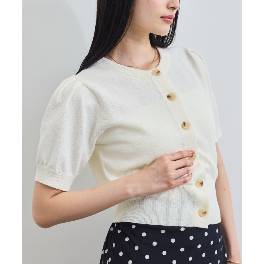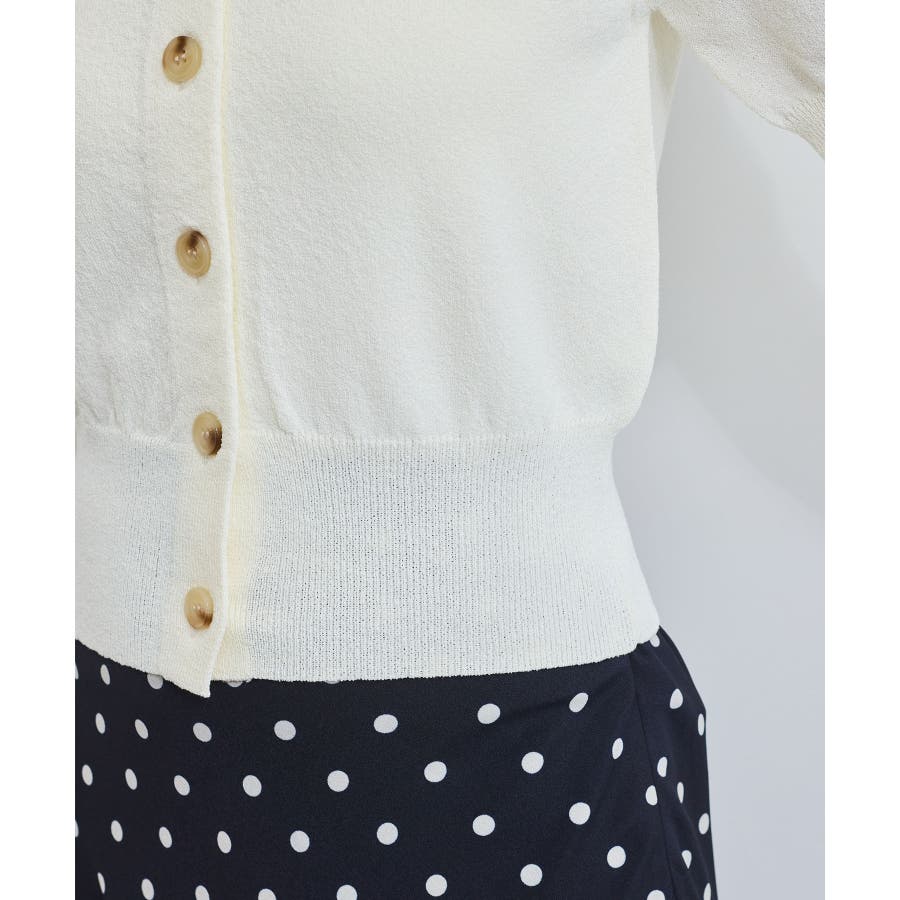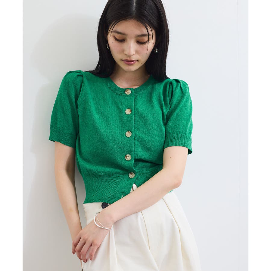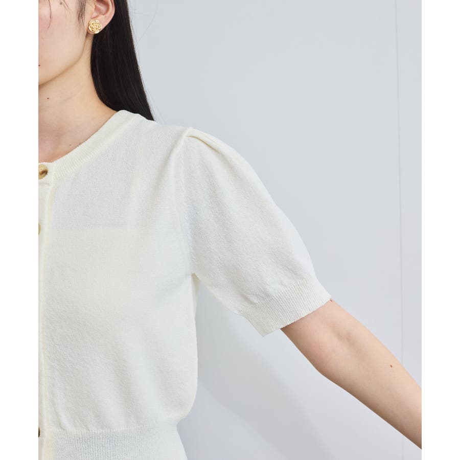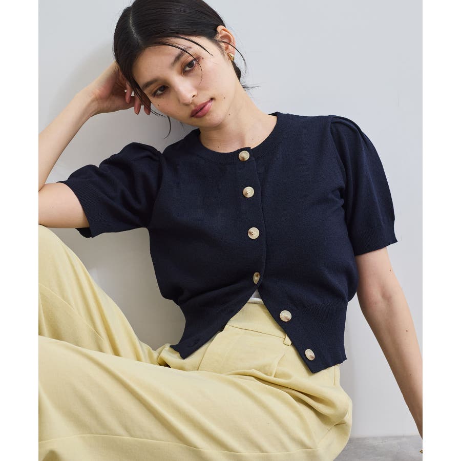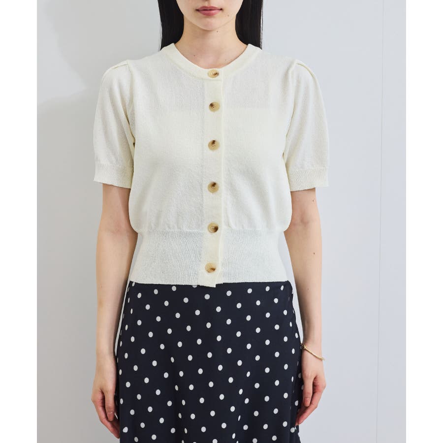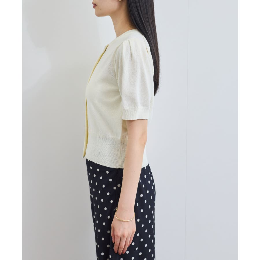 トップス使いにぴったりなフロント開きのニットカーデ。丸みのあるシルエットが女性らしく、ボトムを選ばずご着用いただけます。袖は肘よりやや上のハーフスリーブ丈で気になる二の腕をカバー。