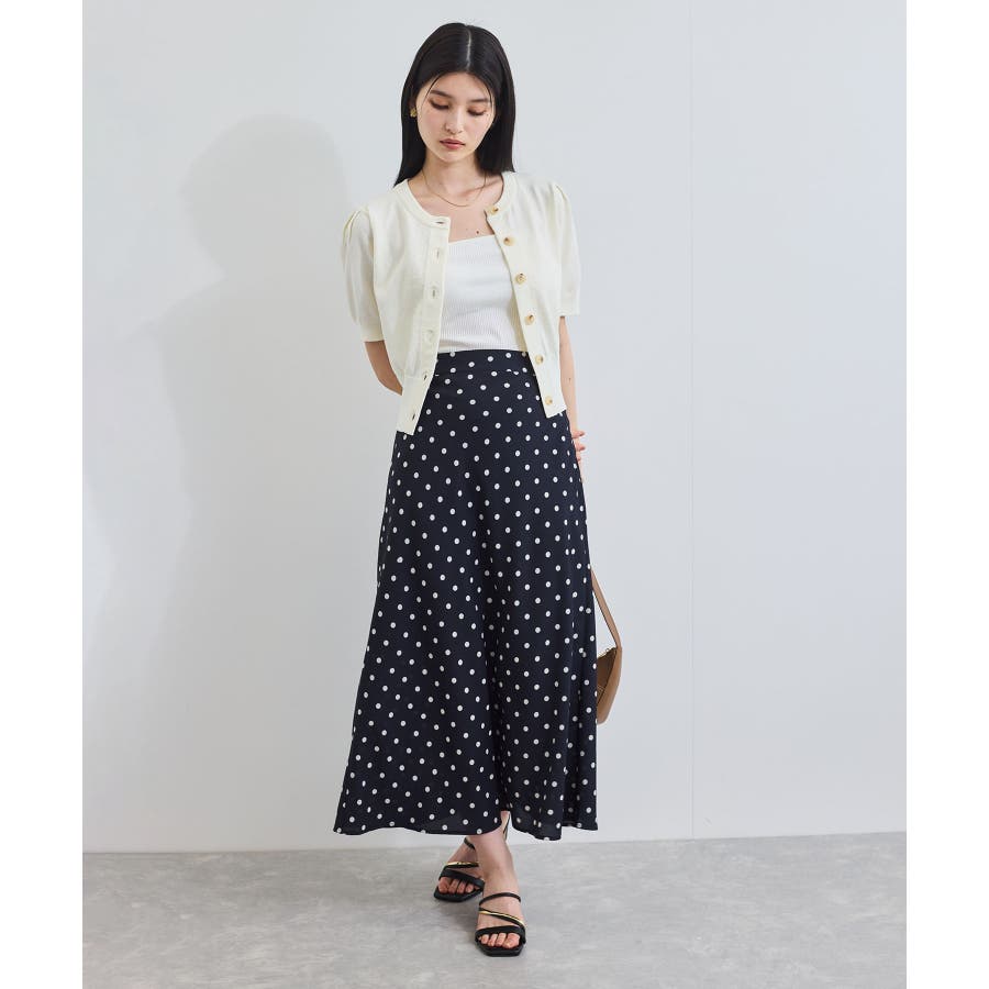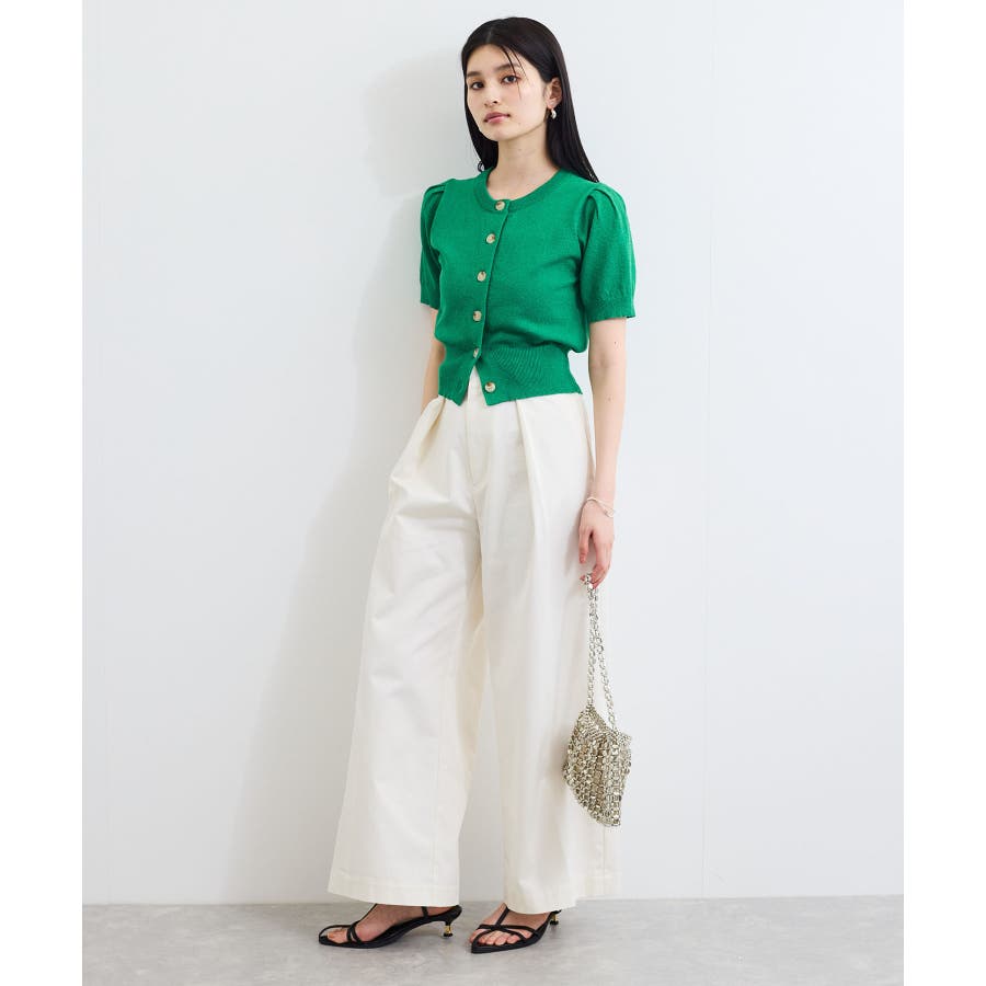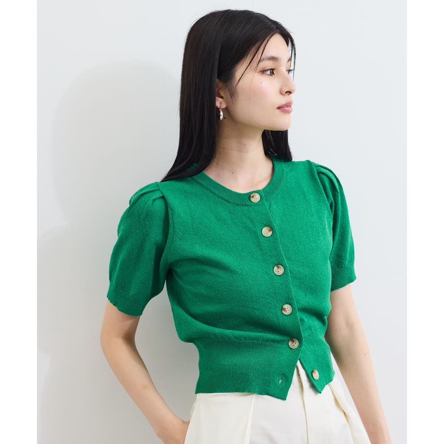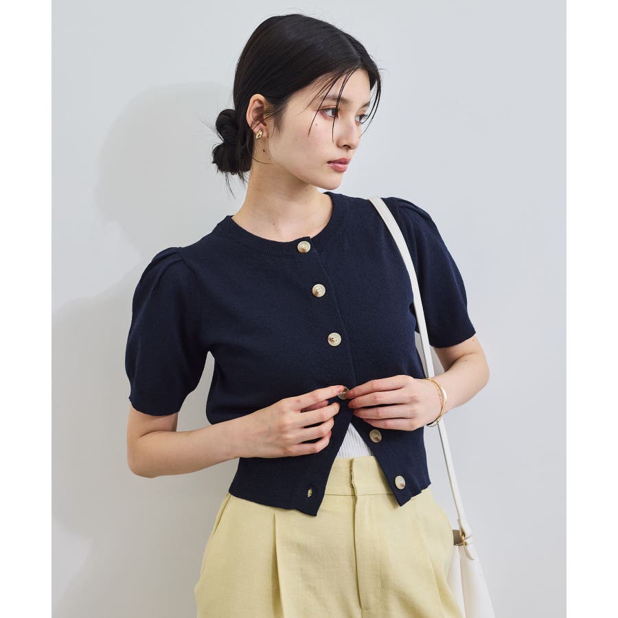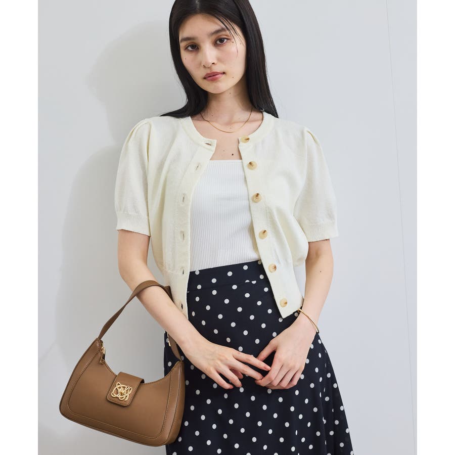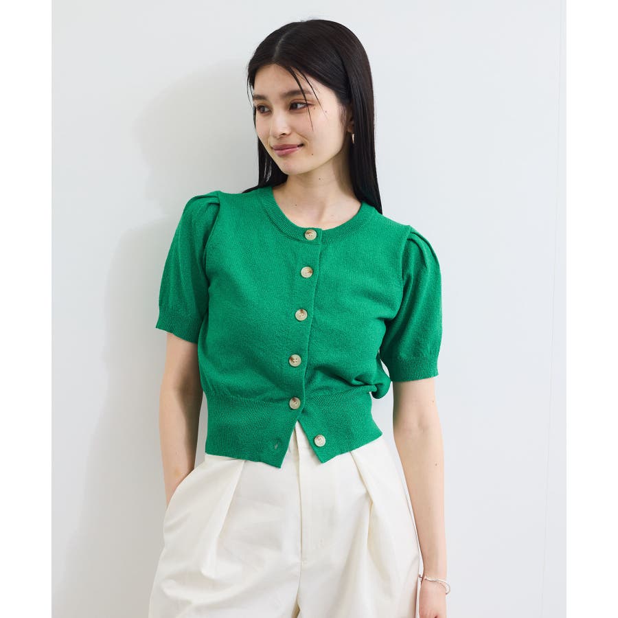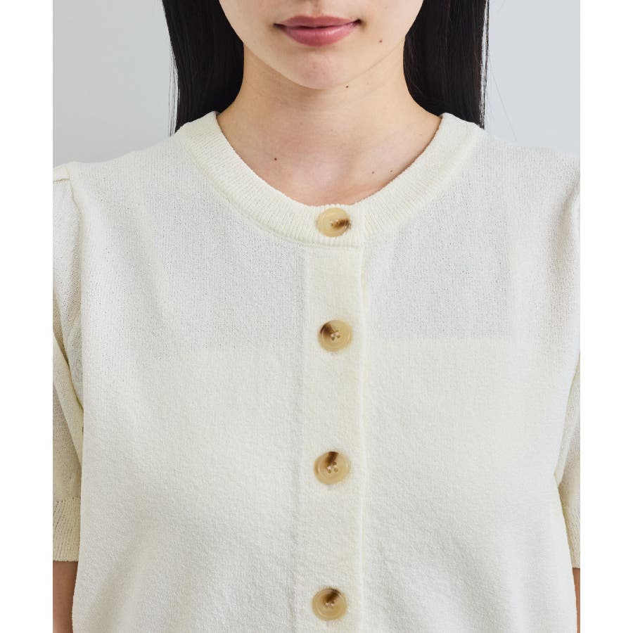 トップス使いにぴったりなフロント開きのニットカーデ。丸みのあるシルエットが女性らしく、ボトムを選ばずご着用いただけます。袖は肘よりやや上のハーフスリーブ丈で気になる二の腕をカバー。