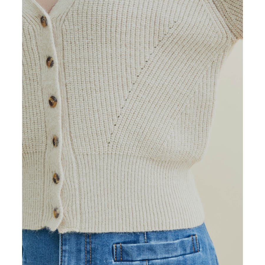 【デザイン・シルエット】 袖にタックを入れてパワーショルダーデザインを取り入れたVネックカーディガンです。 少し短めの丈にしてスタイルアップして見えるようにしています。 【素材】 ミドルゲージの片畦の編地で暖かみのある素材を使用しています。 【カラー】 ベーシックなブラック・キナリとアクセントになるオレンジの3色展開。 【おすすめのスタイリング】 ハイウエストのボトムやワンピースと合わせるのがおすすめです。 前ボタンを閉めてトップスとしても着ていただけます。 ----------------------------- 裏地:なし 光沢感:なし 透け感:なし ポケット:なし 伸縮性:あり 生地の厚さ:やや厚手 ボタン:あり 季節:秋~春 ----------------------------- 【モデル着用サイズ】 全色モデル身長:170cm、着用サイズ:F ※画像の商品はサンプルです。 実際の商品と仕様、加工、サイズが若干異なる場合がございます。