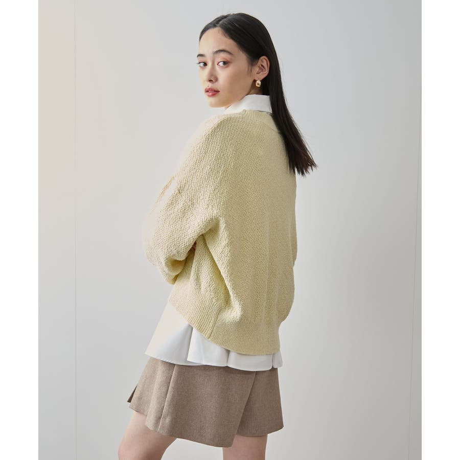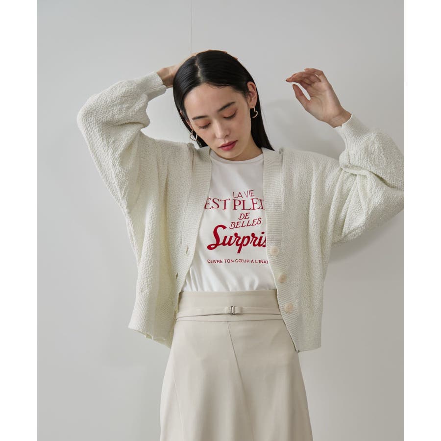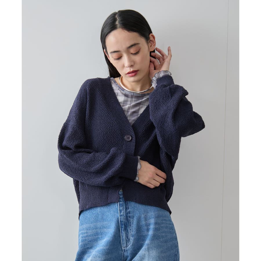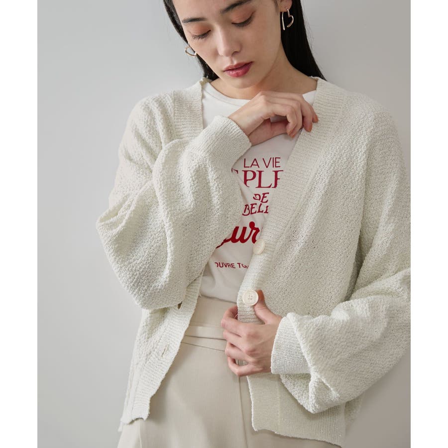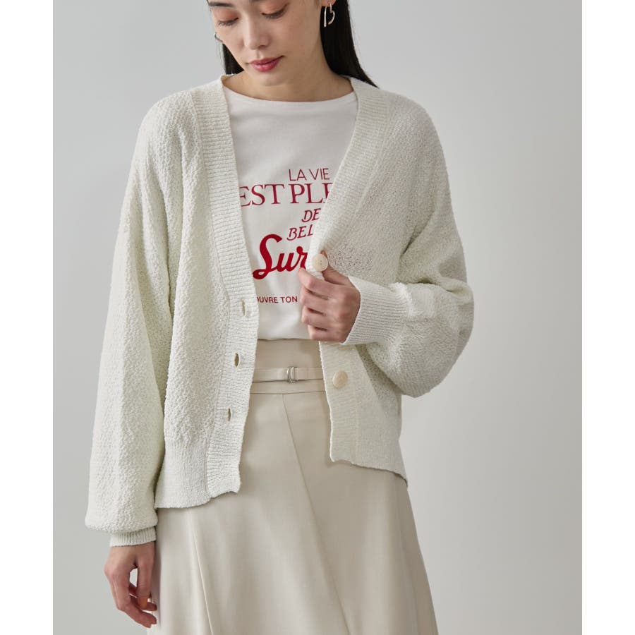 ◆2025春夏◆ 【デザイン・シルエット】 着流し系のフェミニン過ぎず大人っぽいカーディガン。 リラックス感のあるワイドシルエットで着心地もGOOD。 少し丸みのあるコクーンシルエット。 リンクス柄で素材の凹凸感や程よいラメ使いで旬なスタイルにアップデート!
