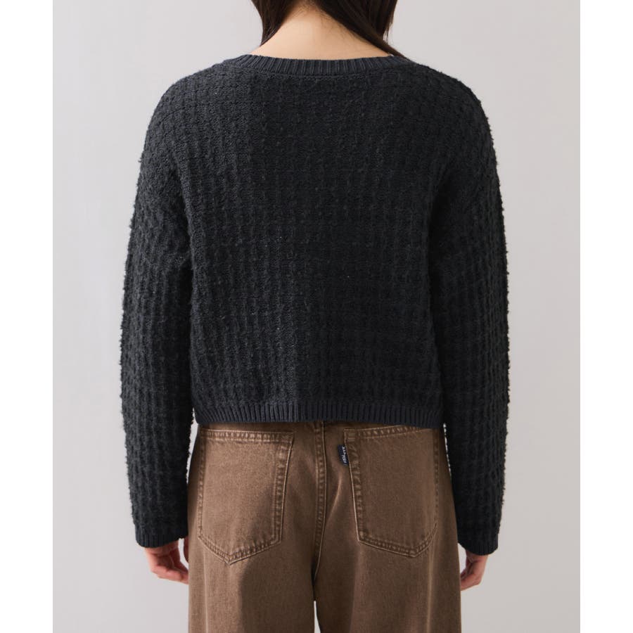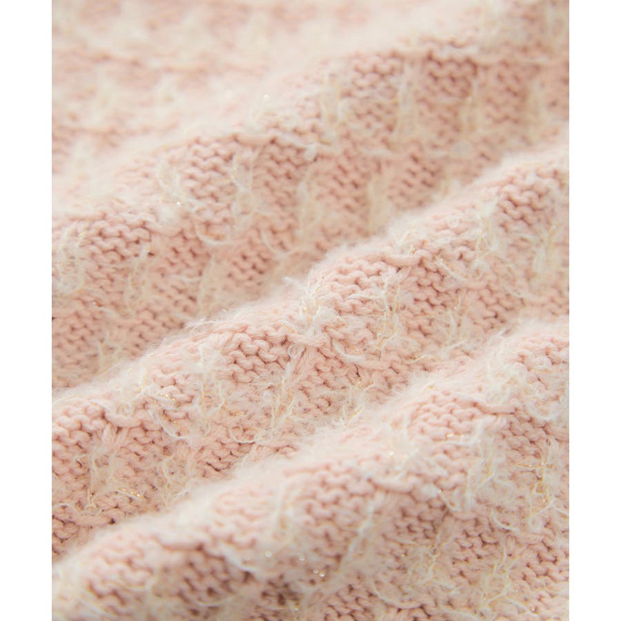 ブークレ糸やストレートの糸を混ぜてツイードのような編み方にしています。ラメが入っていますが、触り心地のざら付きは少ないです。