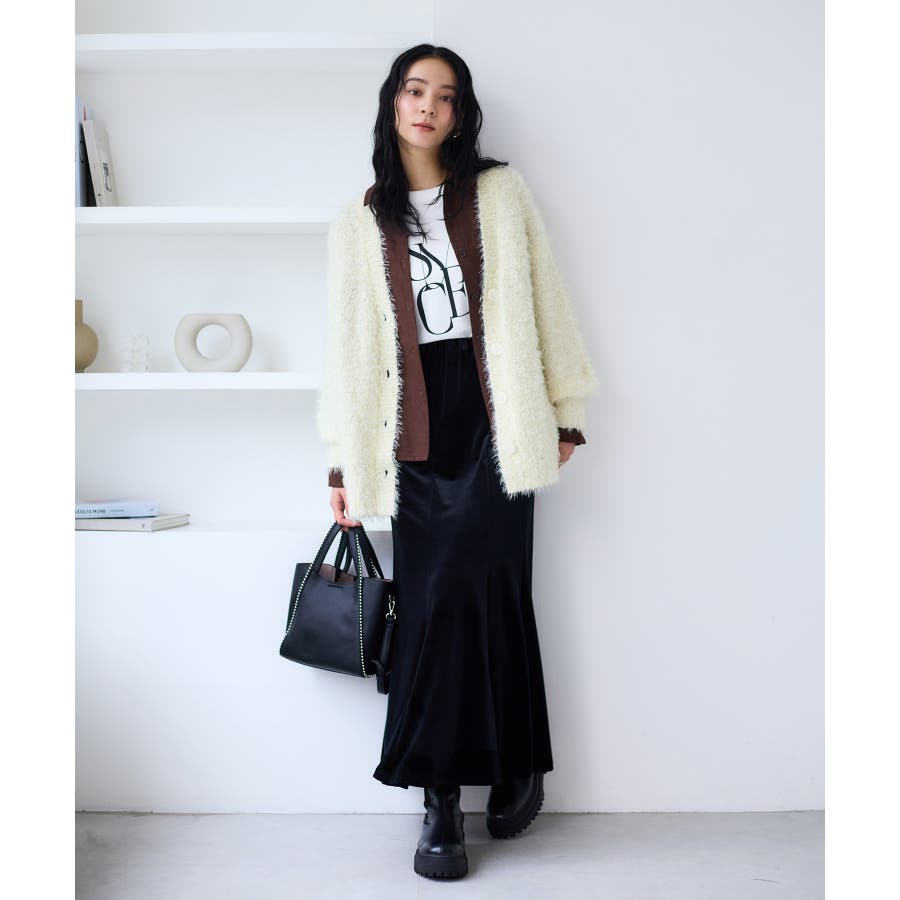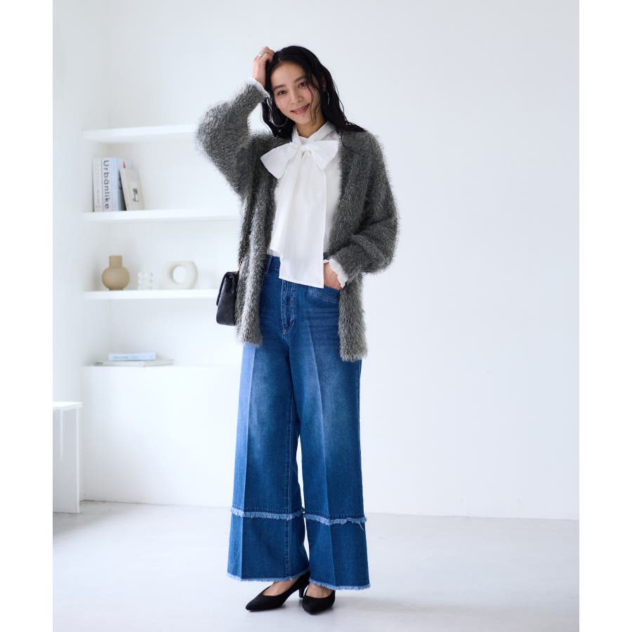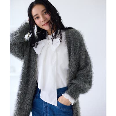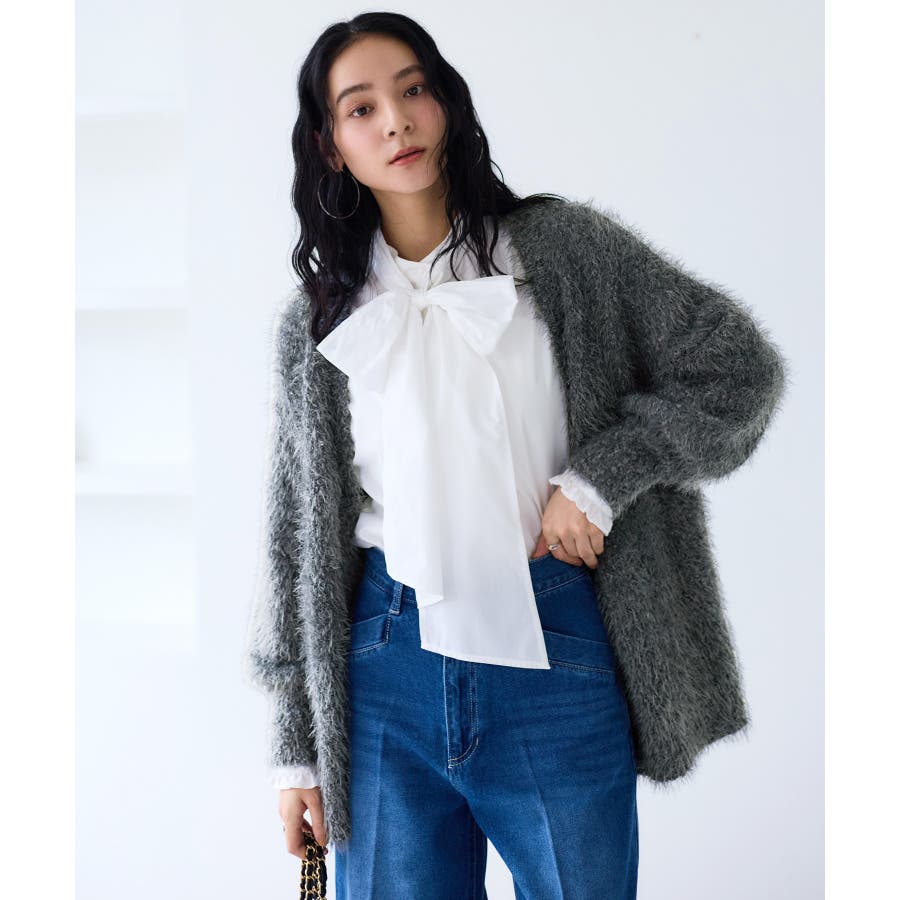 Vネック空きなのでボウタイブラウスの合わせも可愛いです。着丈が長いので腰回りスッキリとしたマーメイドラインやワイドパンツなどの、ボトムスとの相性が良いです。